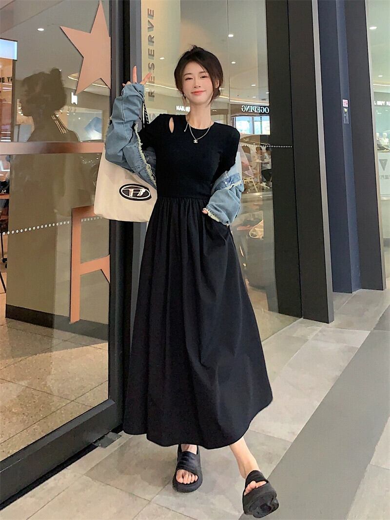 ヘップバーンスタイル中空ニットドレス女性秋 2023 新しいフレンチウエスト痩身ミッドレングス長袖スカート ロング オータム 秋物 missk20173971619