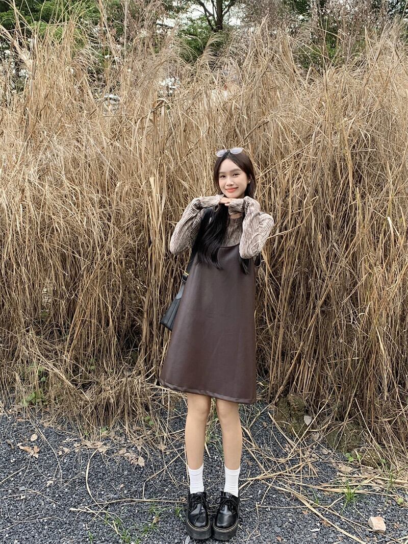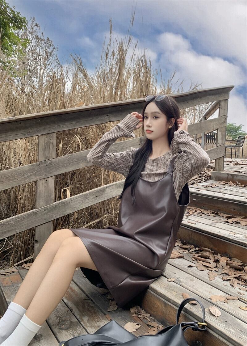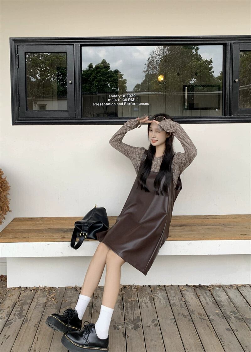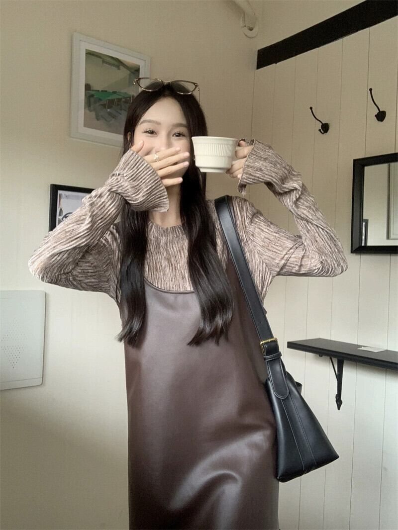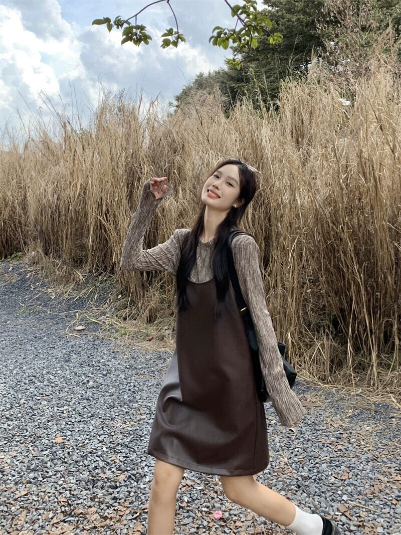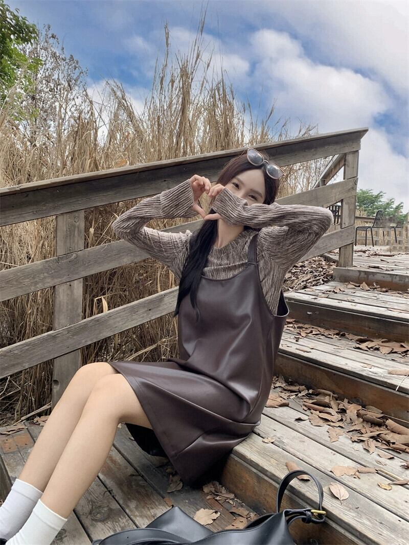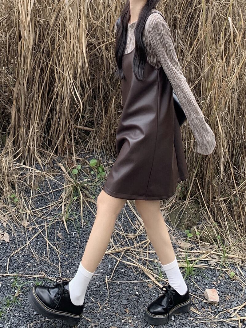 -エンド pu レザーミッドレングスサスペンダードレス長袖ボトシャツ女性の秋 2023 新しいファッション 2 点セット ロング オータム 秋物 missk89682047929