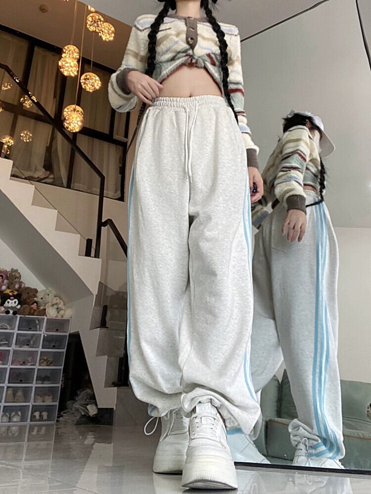 アメリカンスポーツカジュアルパンツ女性 2023 秋の新しいハイウエスト痩身ストライプ巾着デザインワイドレッグスウェットパンツ オータム 秋物 missk61678970772