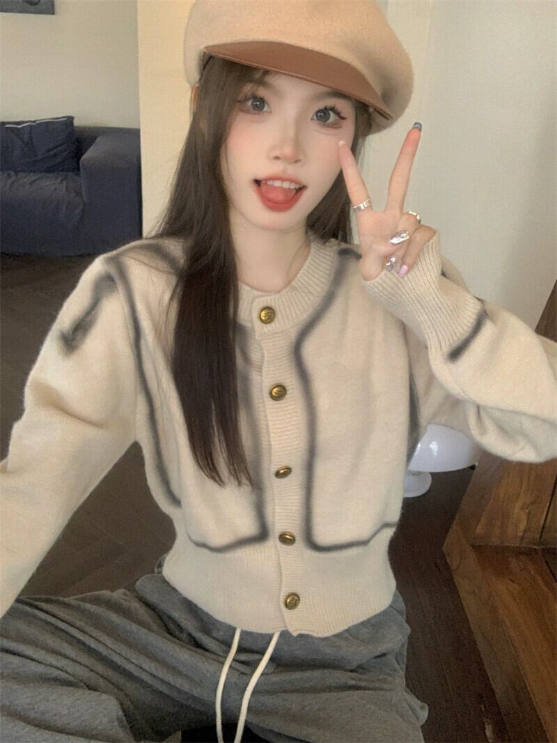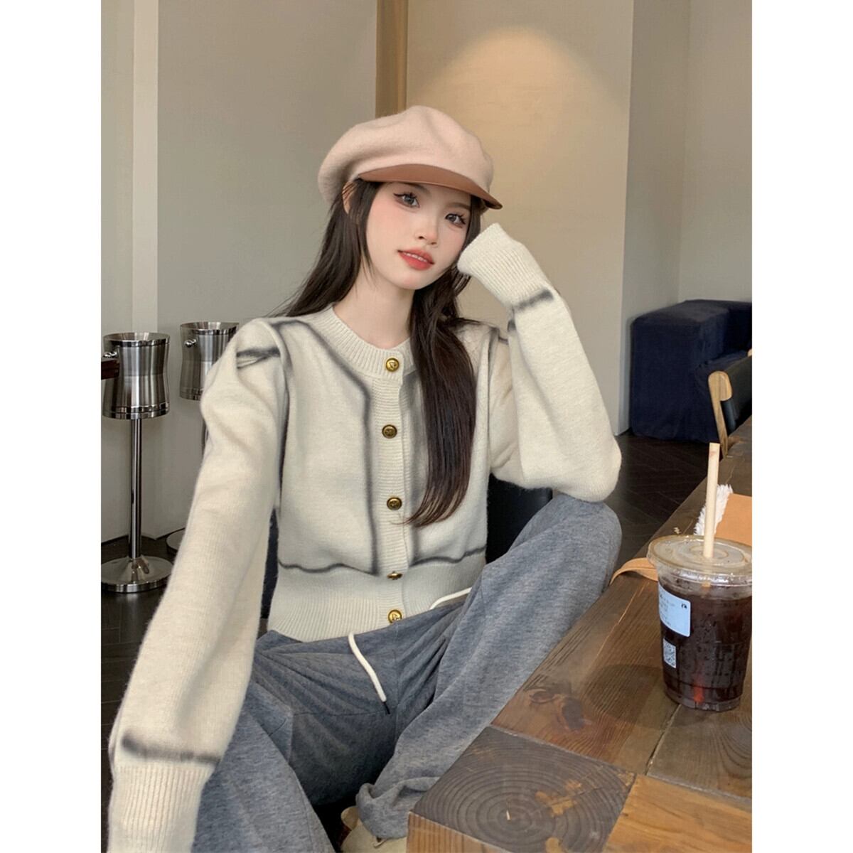 フレンチニッチ長袖ニットカーディガン女性2023秋新デザインルーズショートコントラストカラー多用途セーター ロング オータム 秋物 missk89622080334