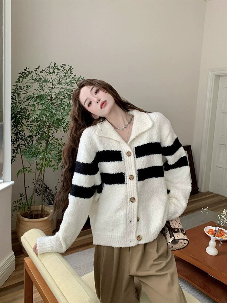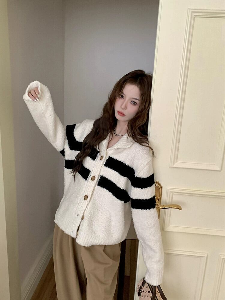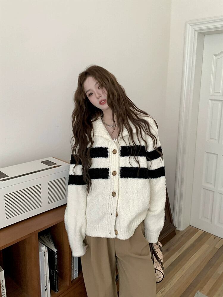 -エンドストライプタートルネック長袖セーター女性秋2023新しいファッション気質ルースソフトワックスカーディガンジャケット ロング オータム 秋物 missk84583444340