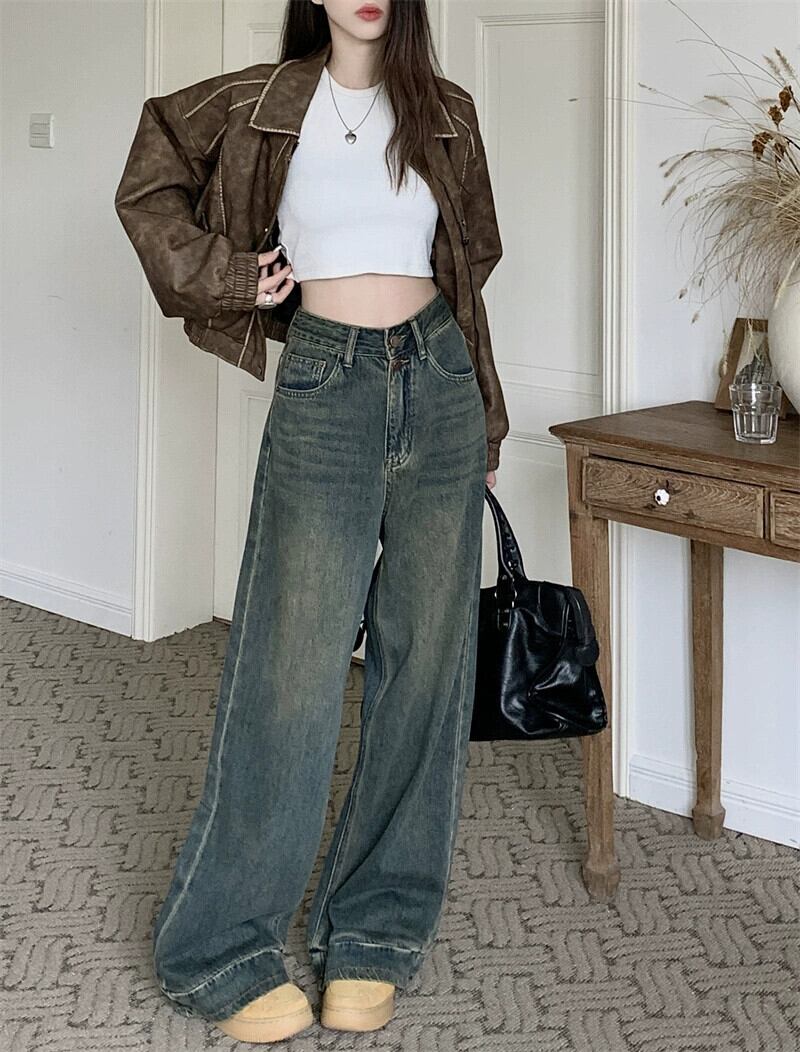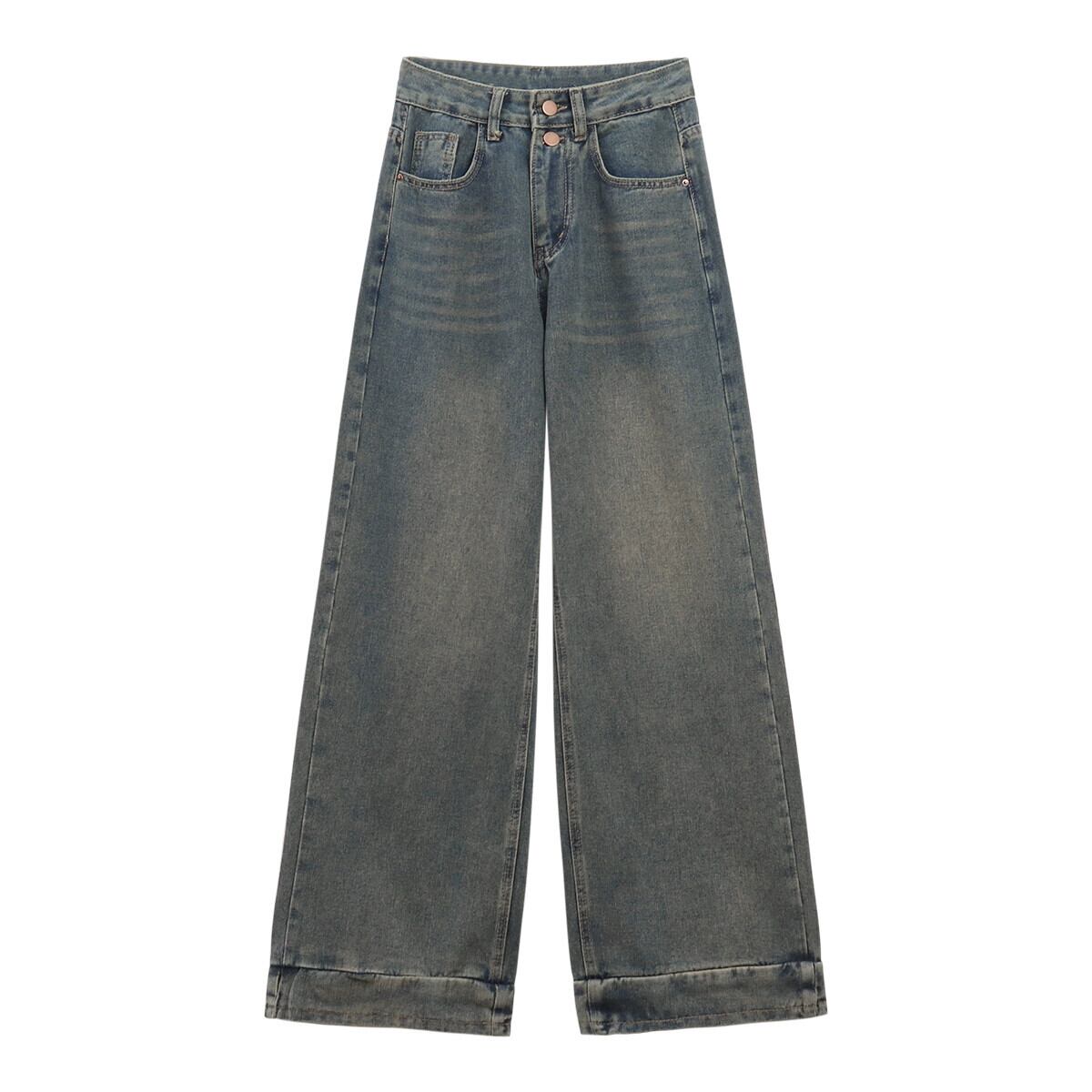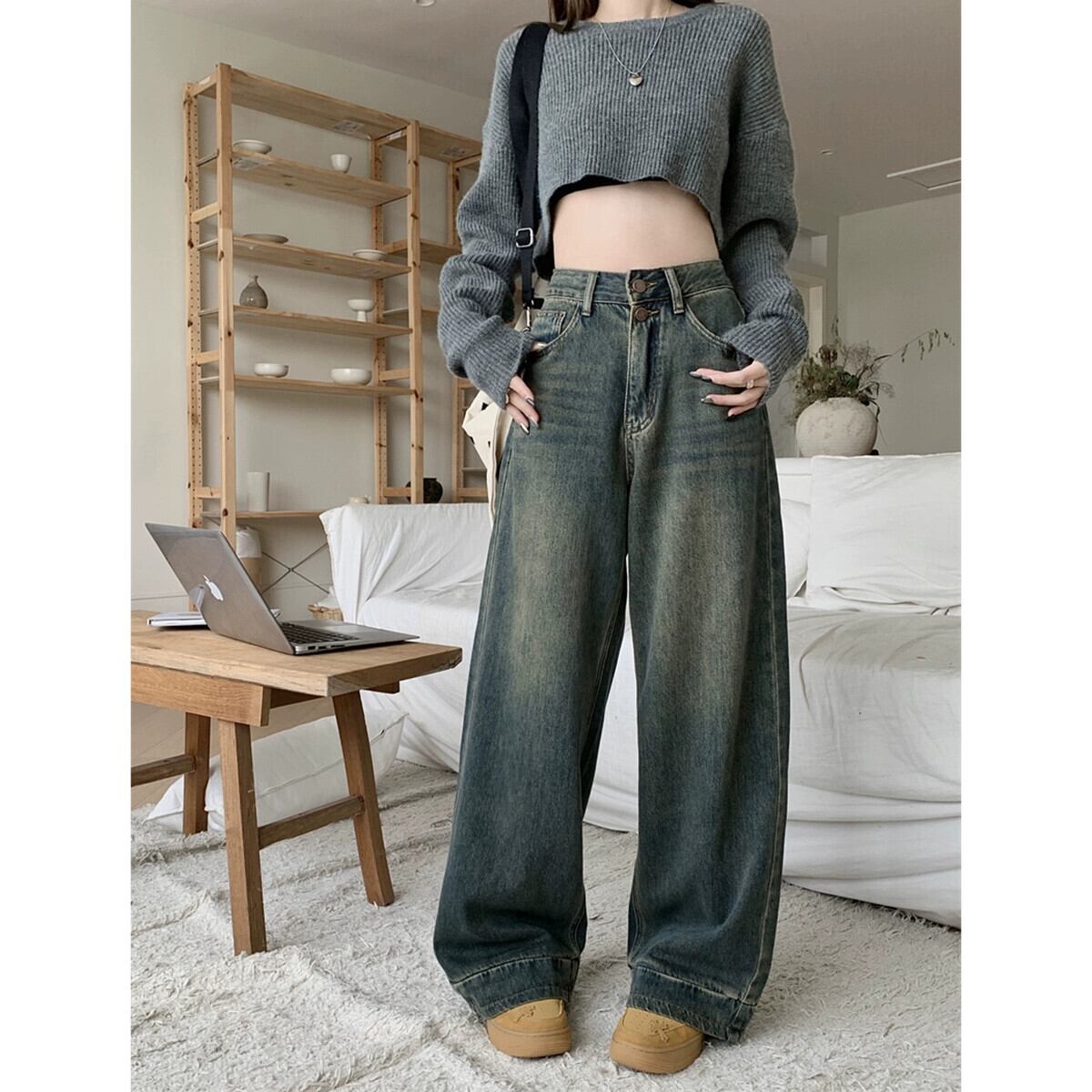 2023 秋のルーズワイドレッグジーンズの女性の新しいレトロハイウエストスリム 2 ボタンストレートフロアレングスパンツトレンディ オータム 秋物 missk99168800680