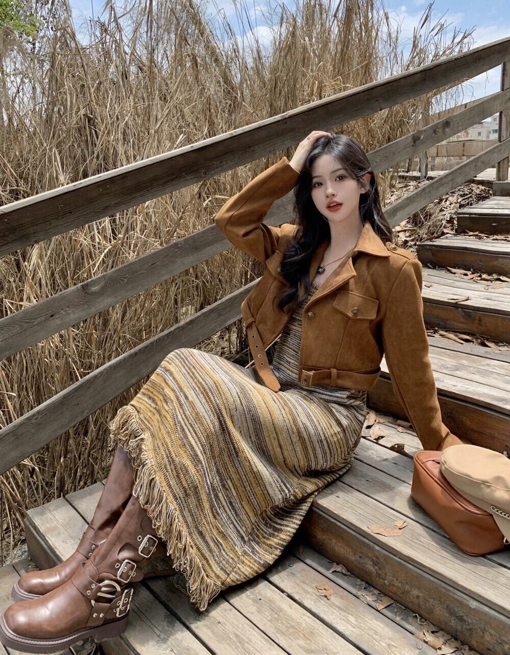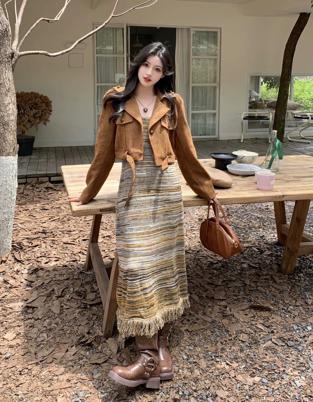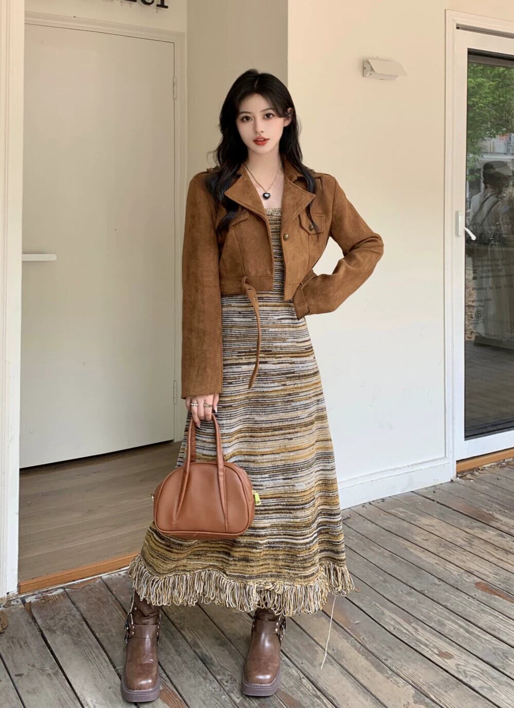 色:ブラウンのモーターサイクルジャケット,ニットワンピース