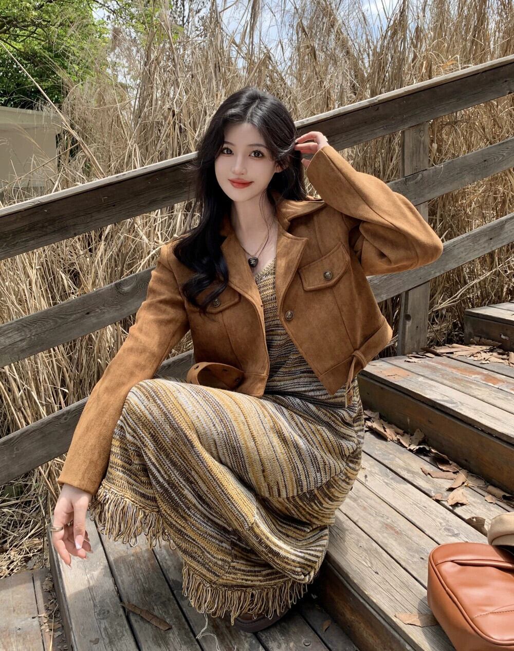 模造鹿革ベルベットジャケット女性 2023 秋の新しいスタイルのレトロなルーズショートオートバイウェアデザイン長袖トップトレンディ ロング オータム 秋物 missk79981521653