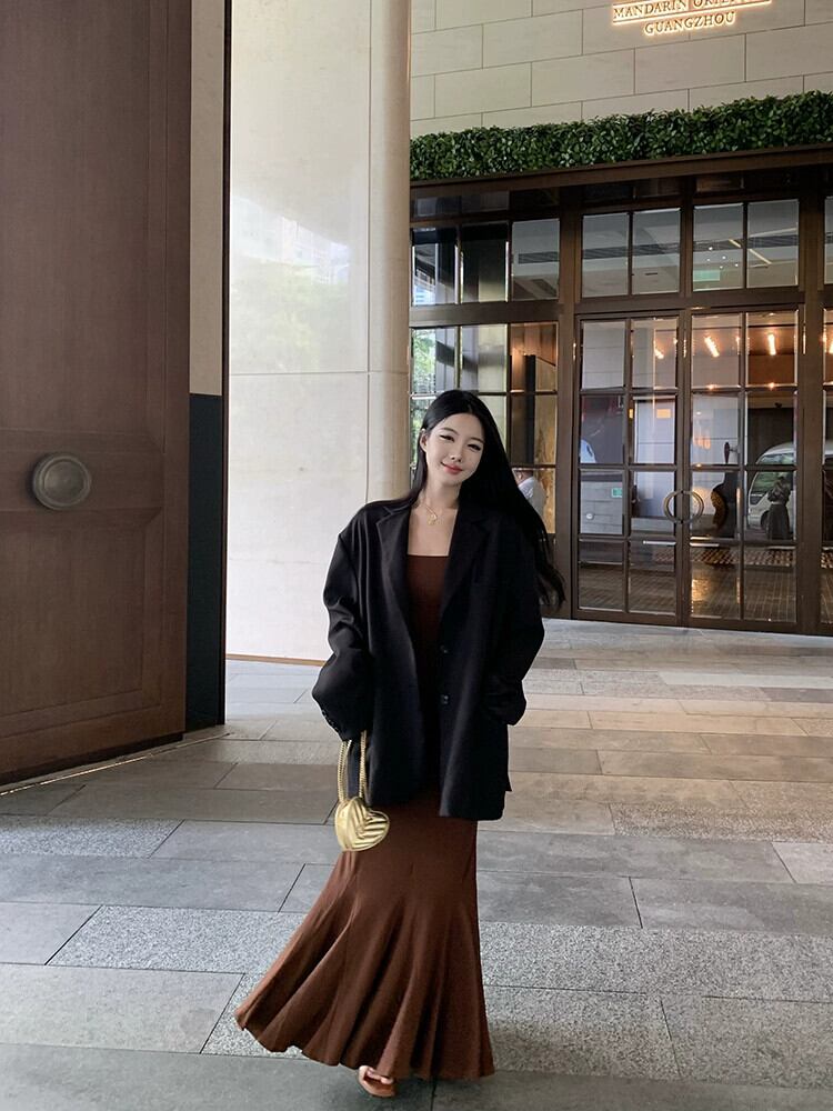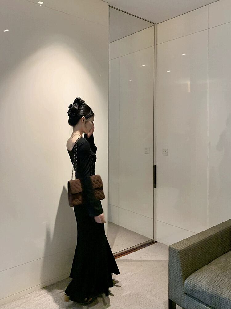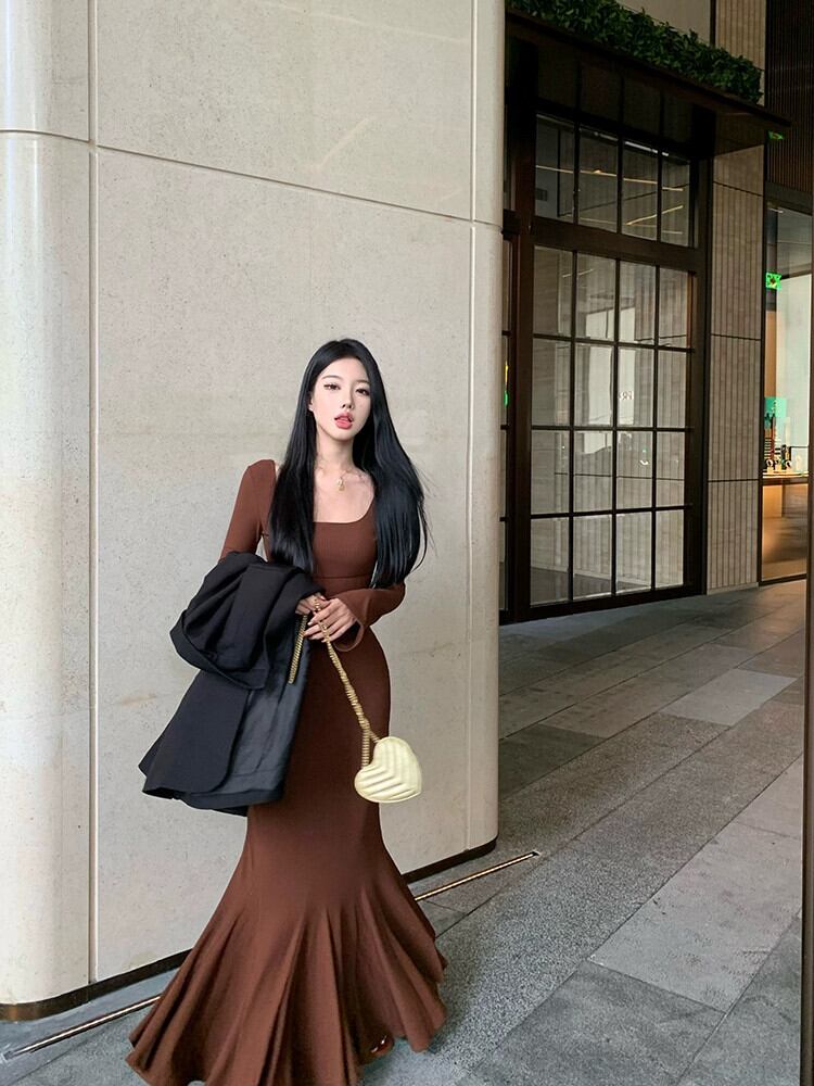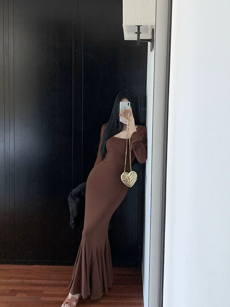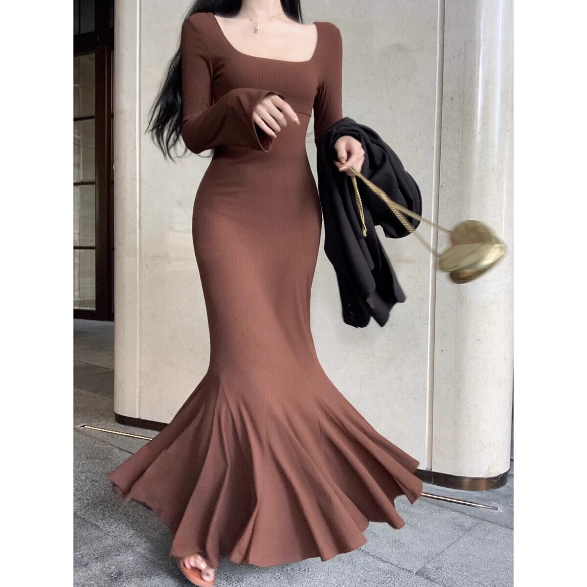 2023 秋の新ファッションデザインスクエアネックスリム長袖ドレス女性のヒップハグ気質フィッシュテールスカート ロング オータム 秋物 スクウェア missk46730512572