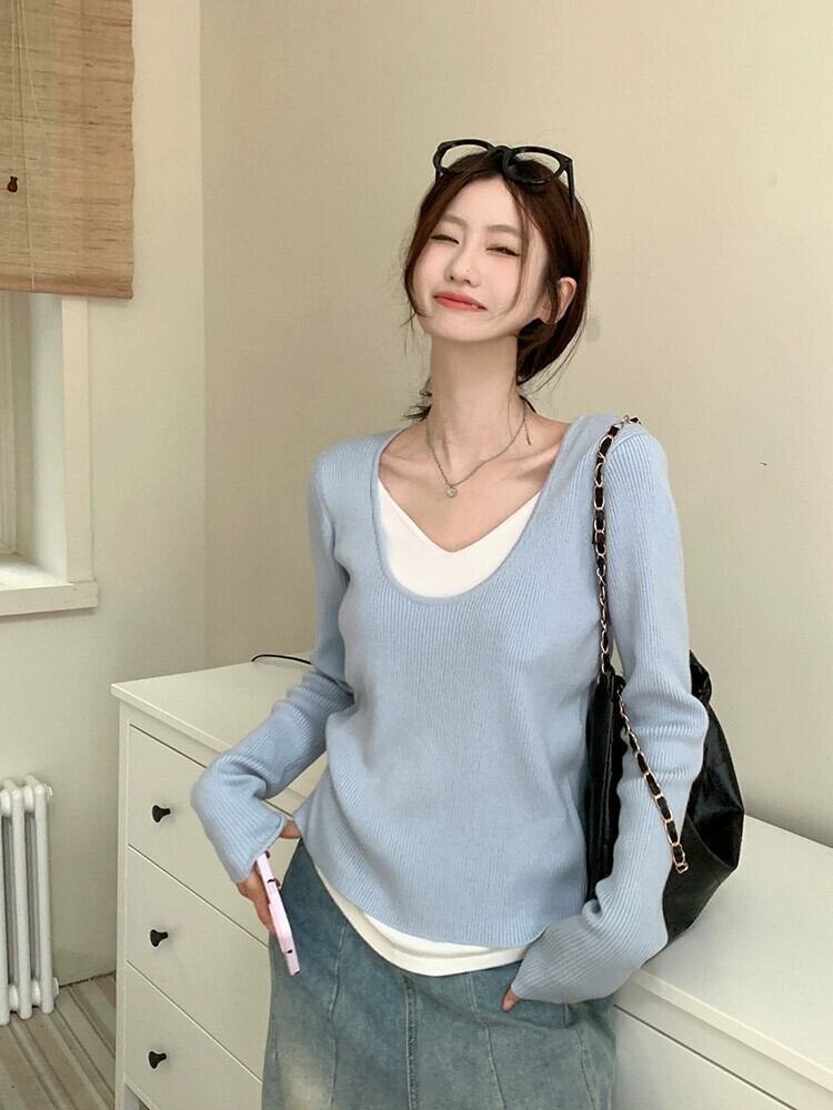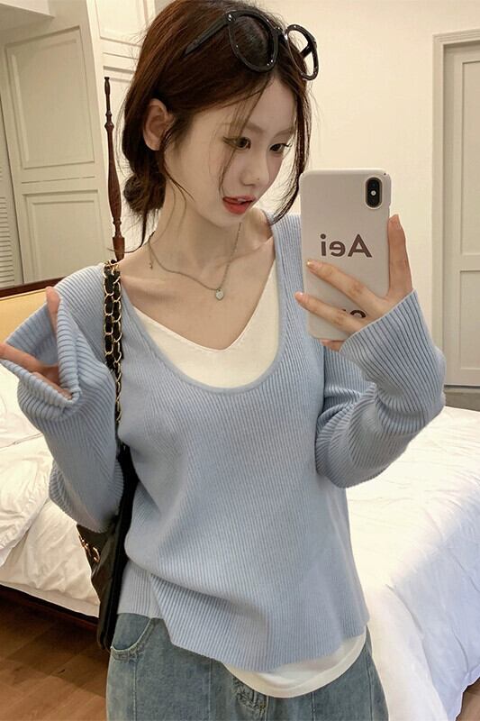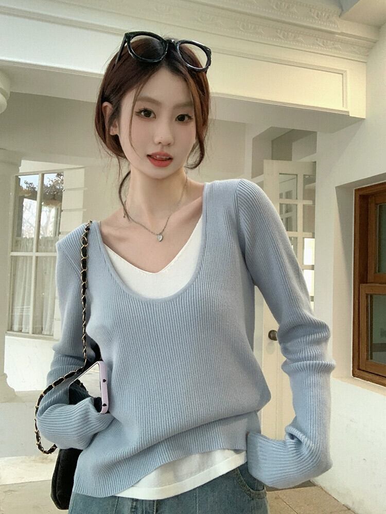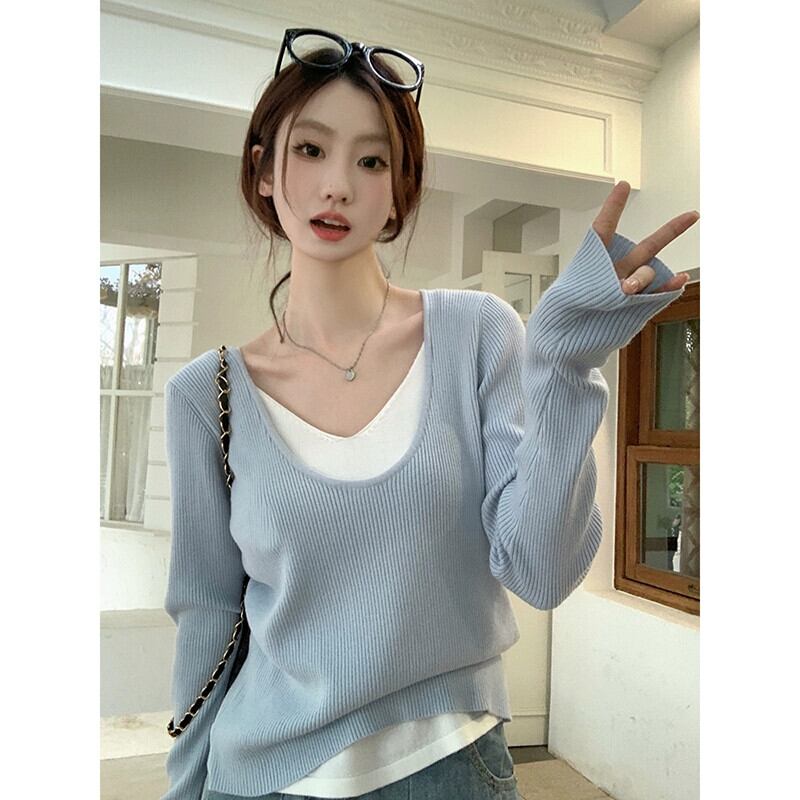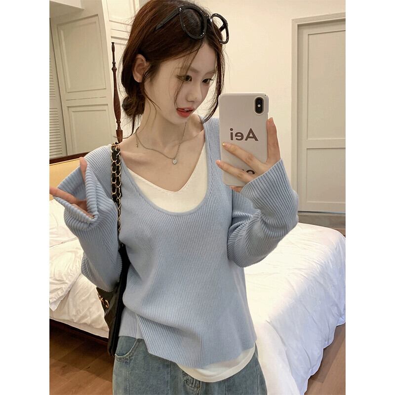 フェイクツーピースセーター女性秋バージョン2023新しいスタイル対照的なカラーステッチソフトワックス状Vネックデザイン長袖トップ ロング オータム 秋物 missk88657444076