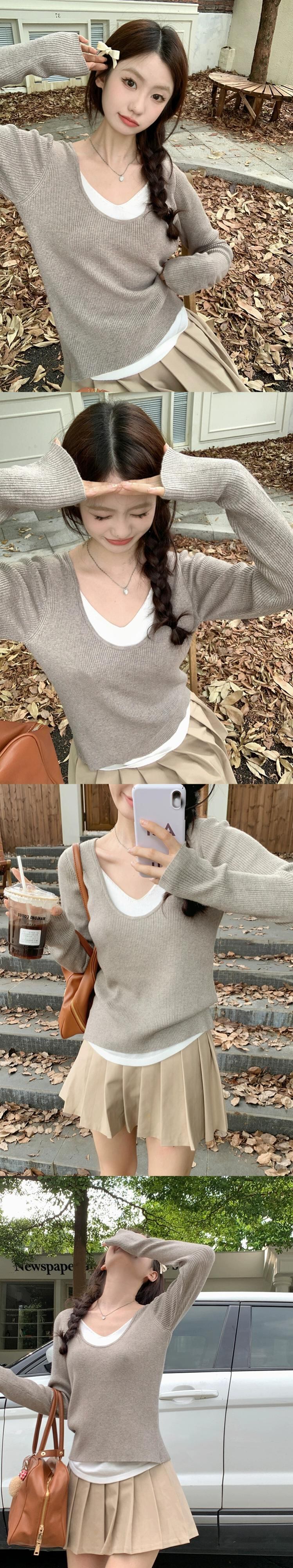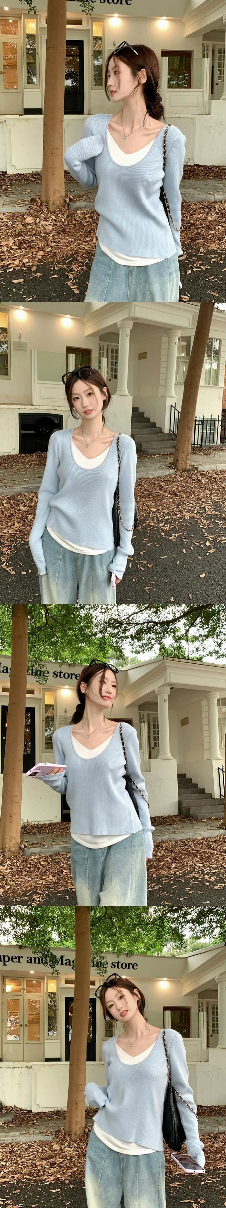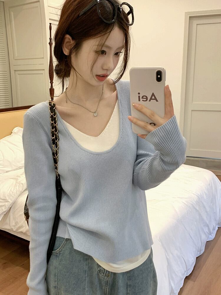 フェイクツーピースセーター女性秋バージョン2023新しいスタイル対照的なカラーステッチソフトワックス状Vネックデザイン長袖トップ ロング オータム 秋物 missk88657444076