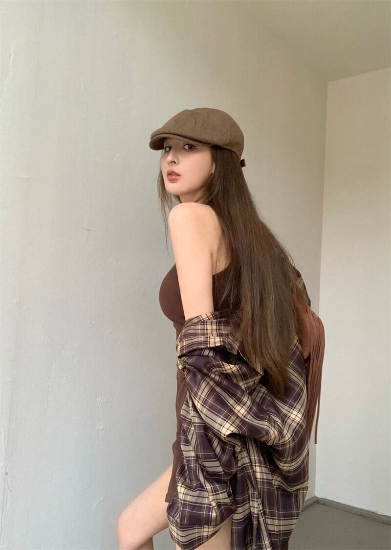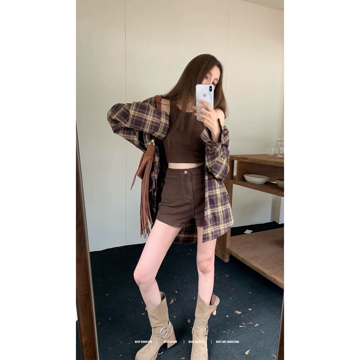 レトロアメリカンホットガールチェック柄長袖シャツベストウエストショーツ女性の秋2023 3点セット ロング オータム 秋物 ブルマー missk40547207896