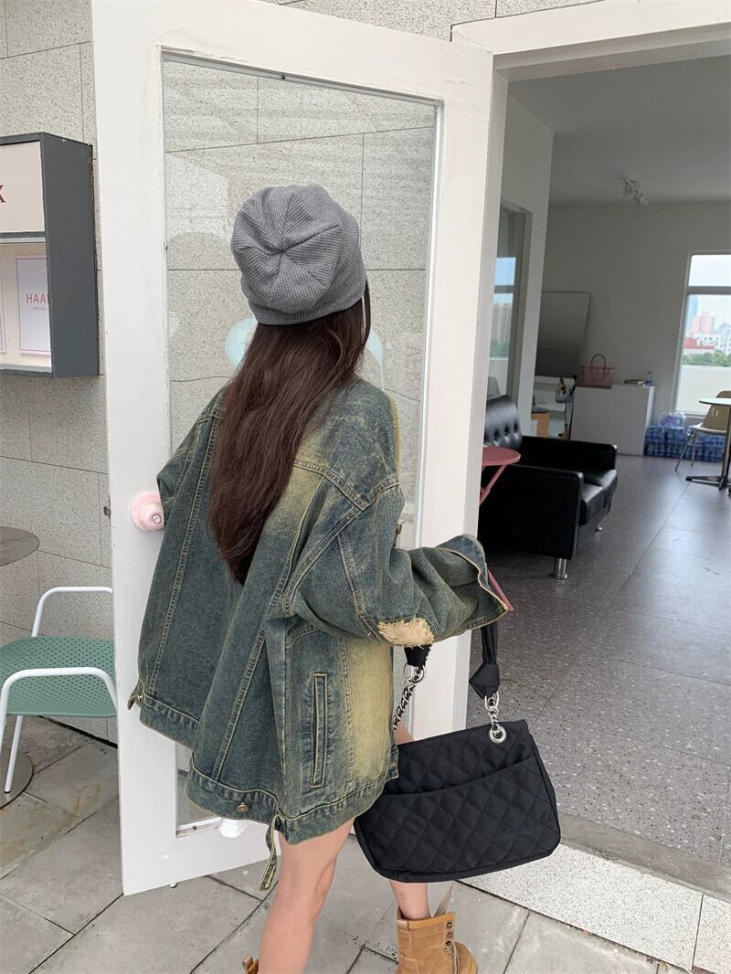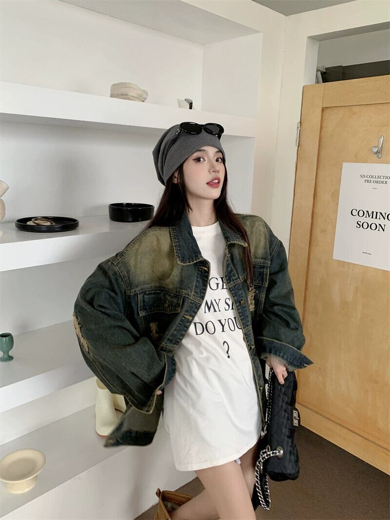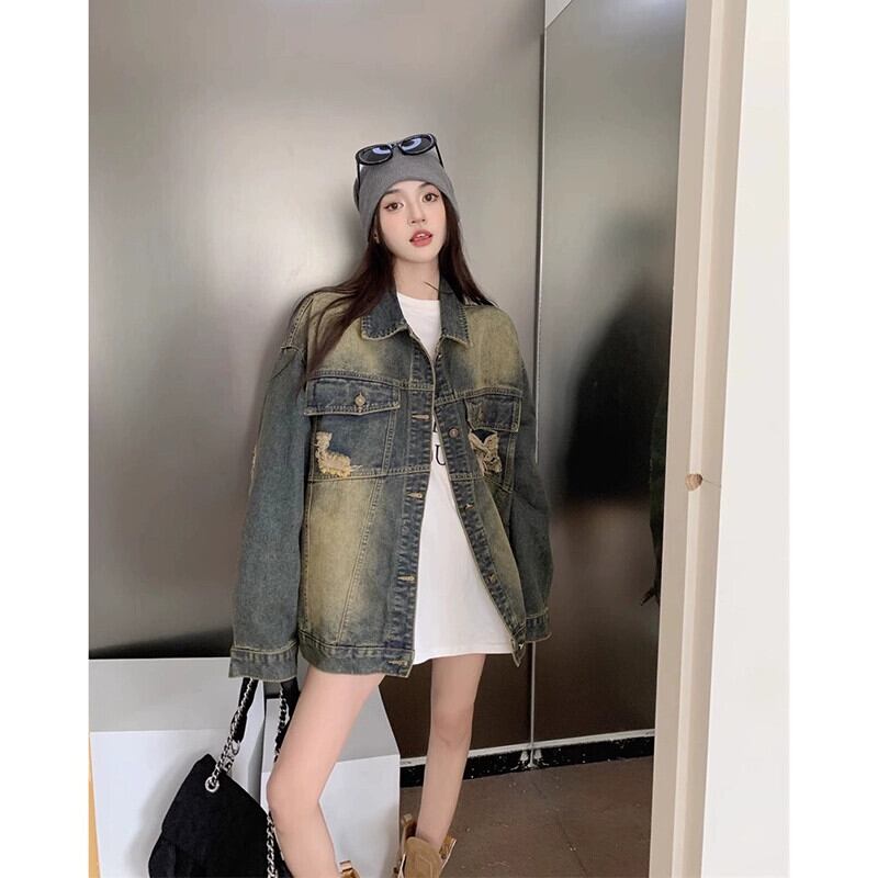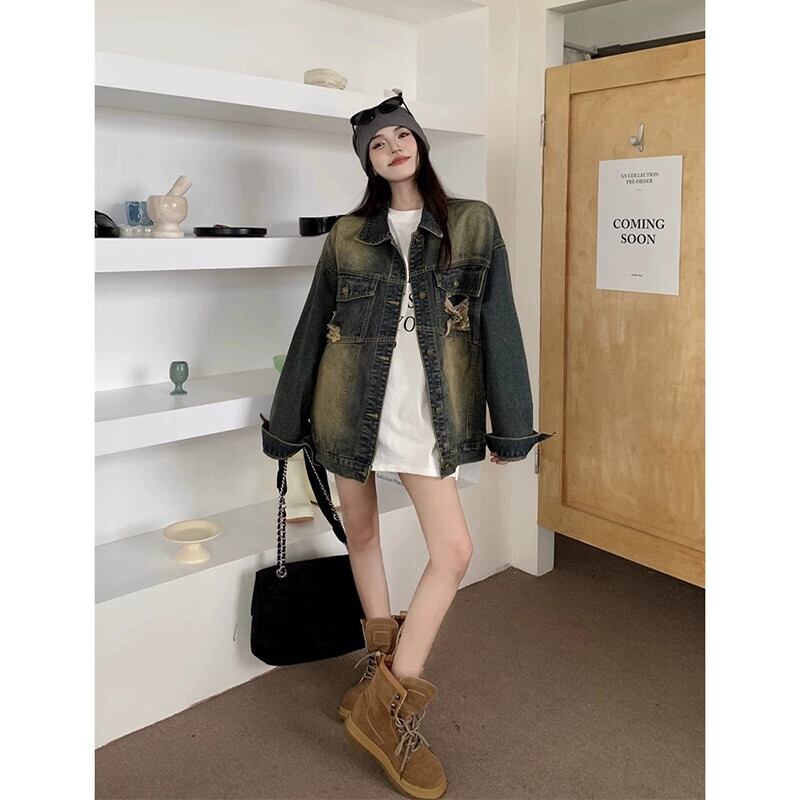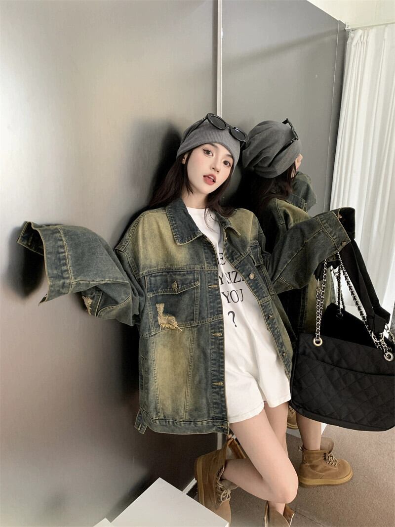 レトロなダメージ加工の破れたデニムジャケットの女性の秋 2023 新デザインルーズミッドレングス長袖トップトレンディな ロング オータム 秋物 missk80987933543