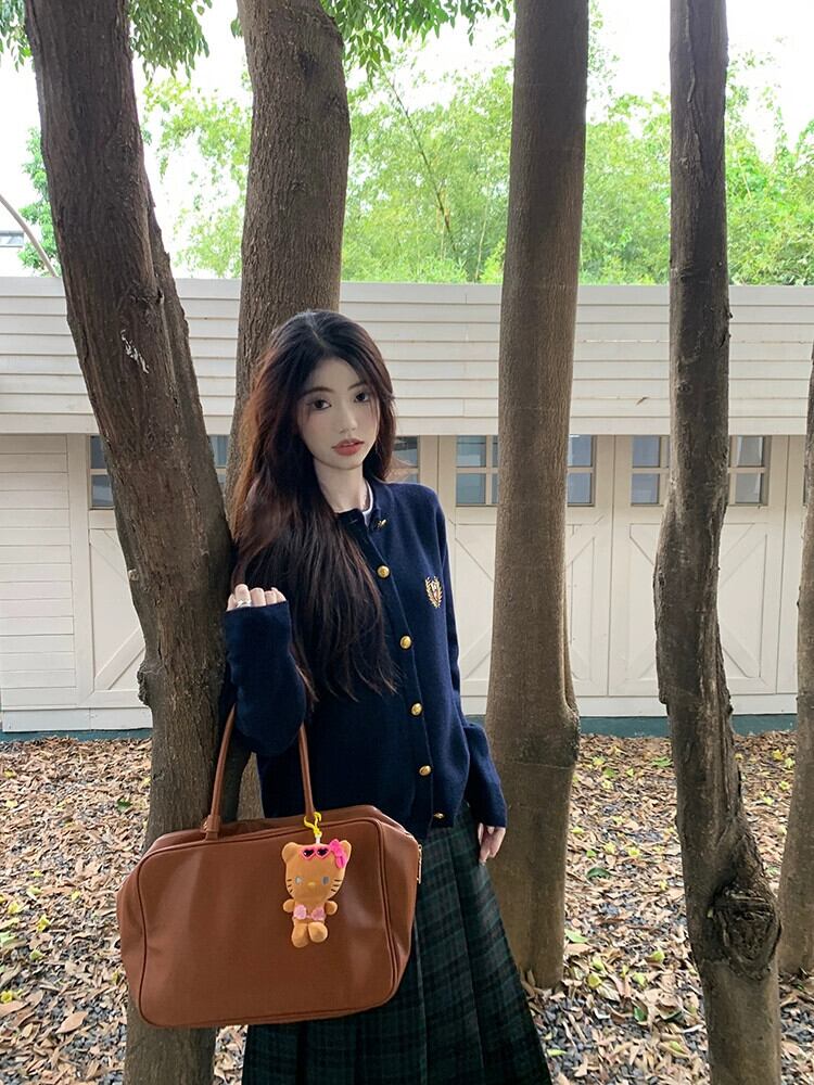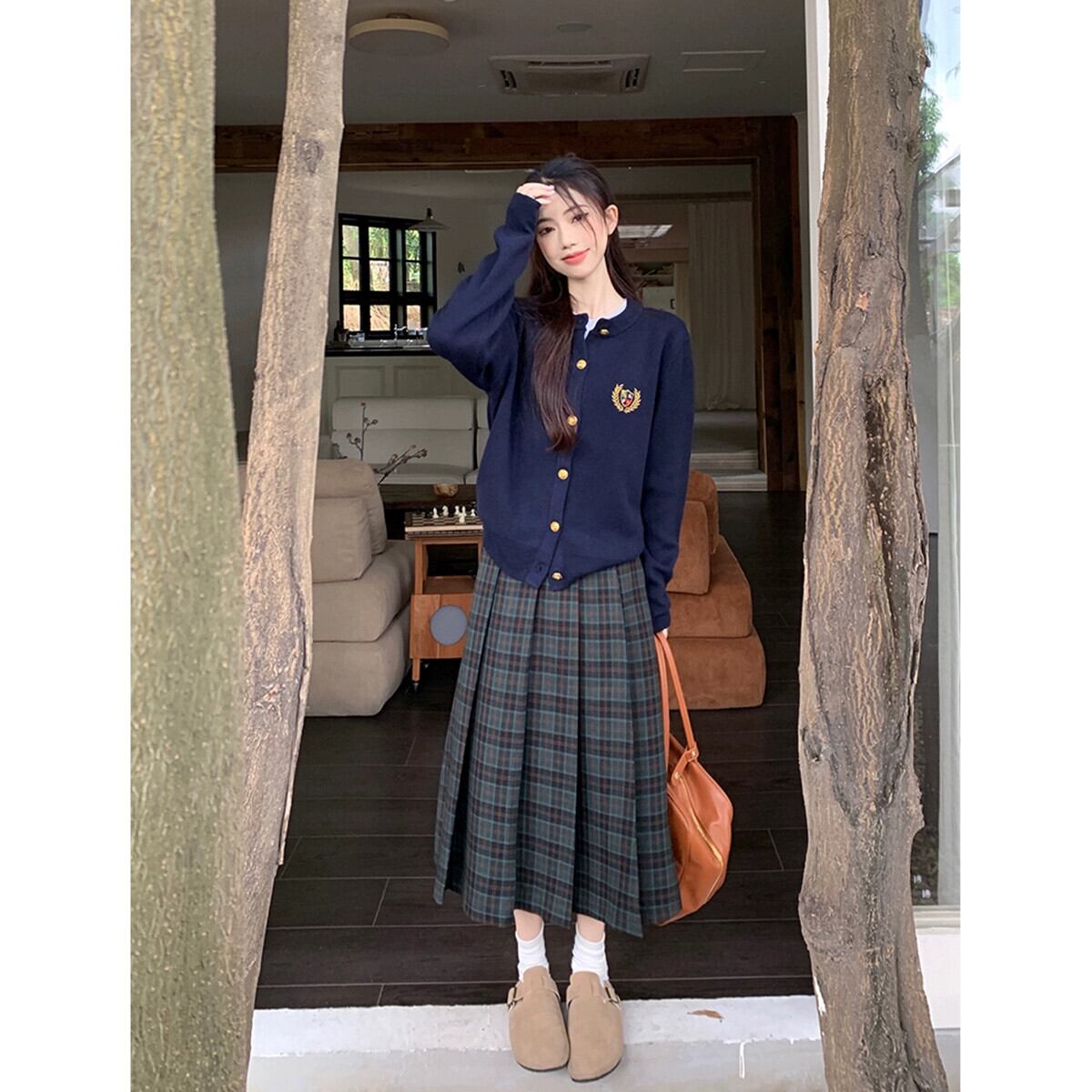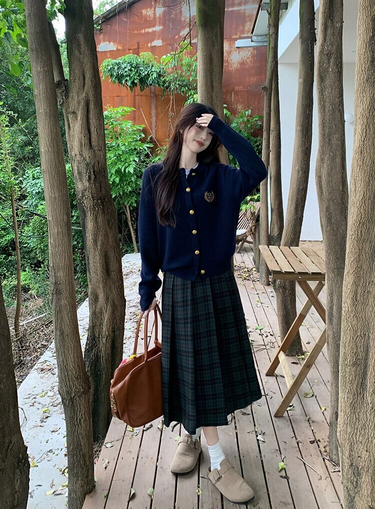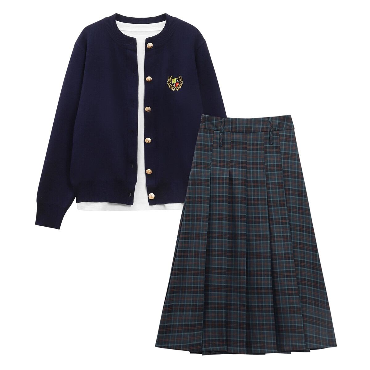 色:緑の格子縞のスカート,ネイビーブルーカーディガン,白い綿のTシャツ