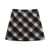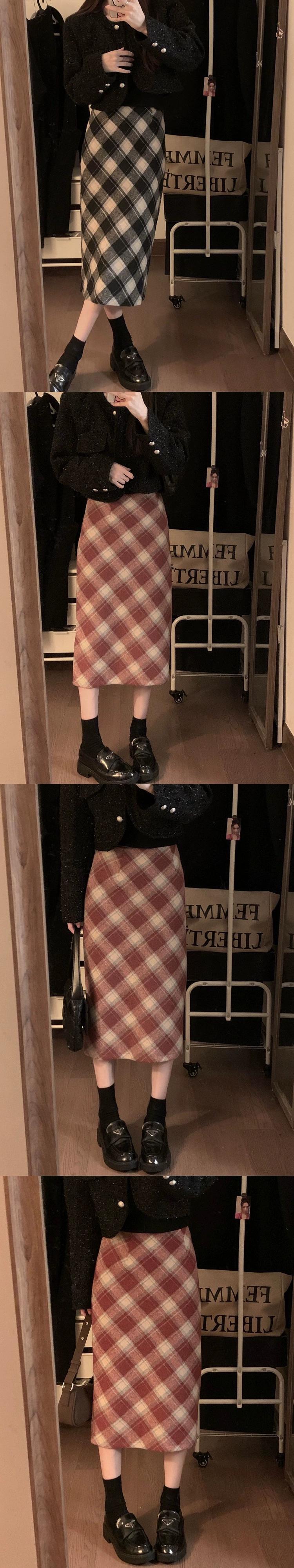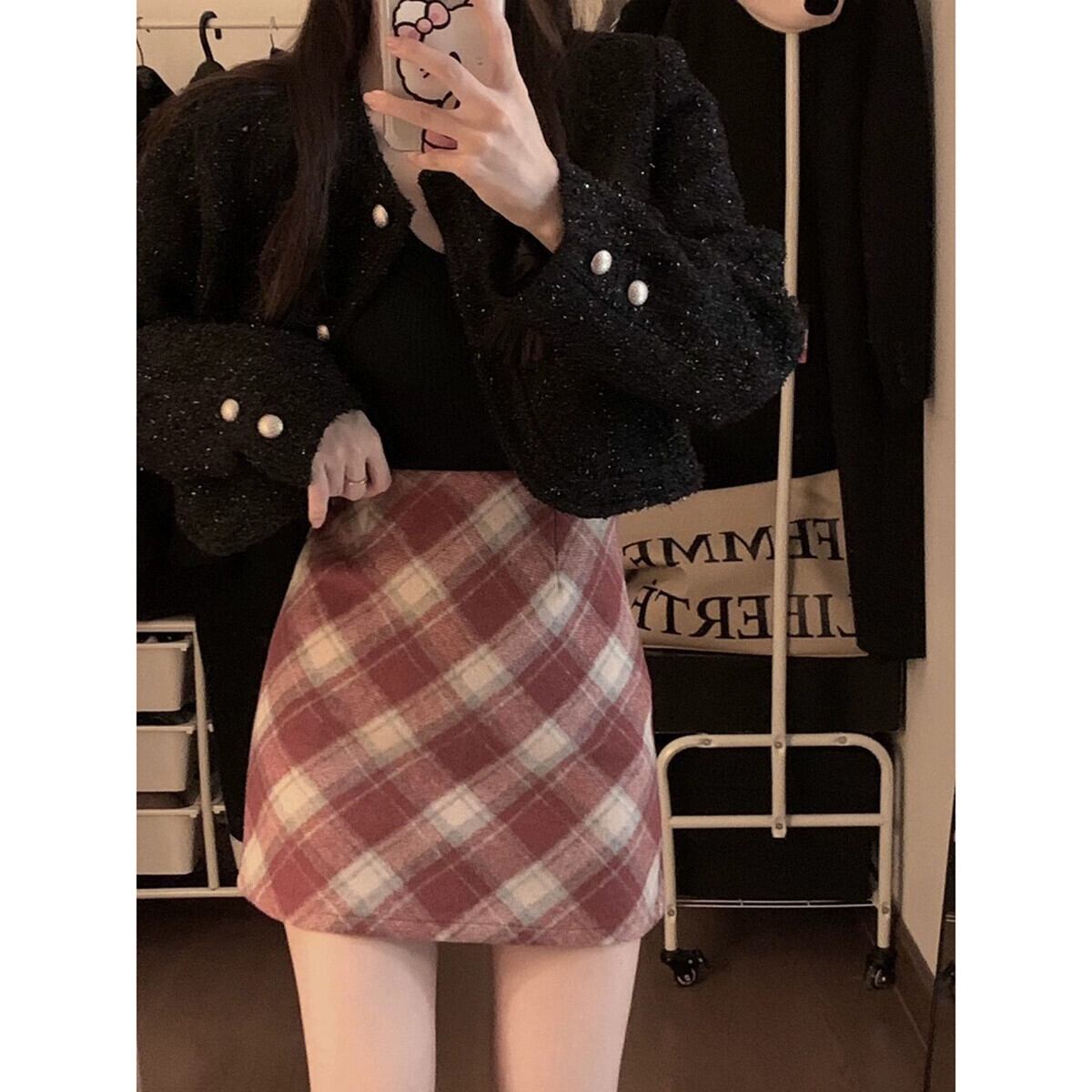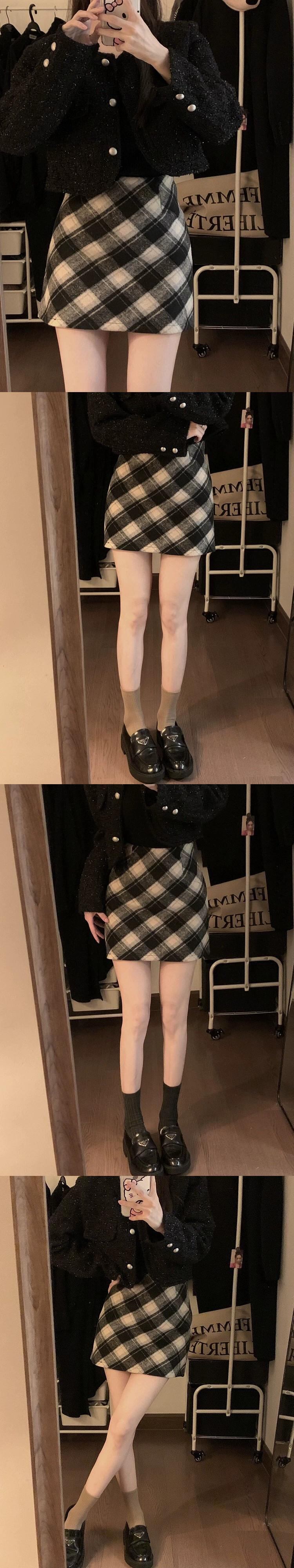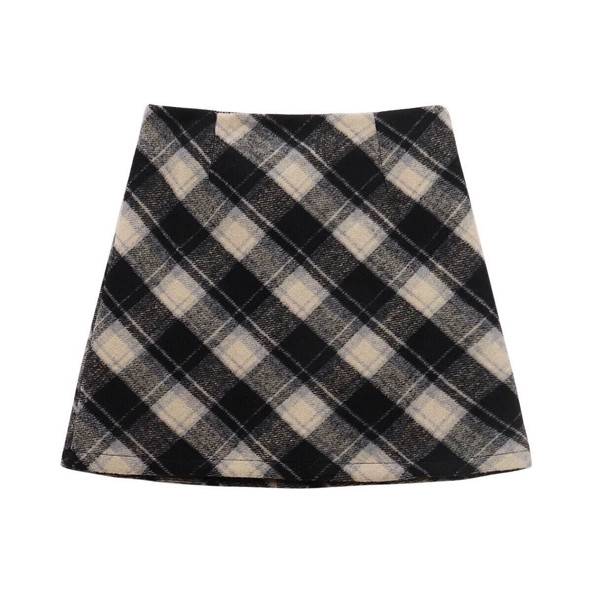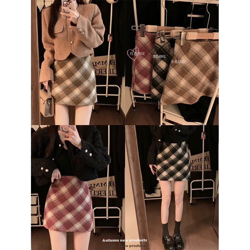 レトロチェック柄ウールスカート女性の秋バージョン 2023 -ウエストスリムと西洋スタイルの A ラインヒップスカート オータム 秋物 Aライン missk14155023249