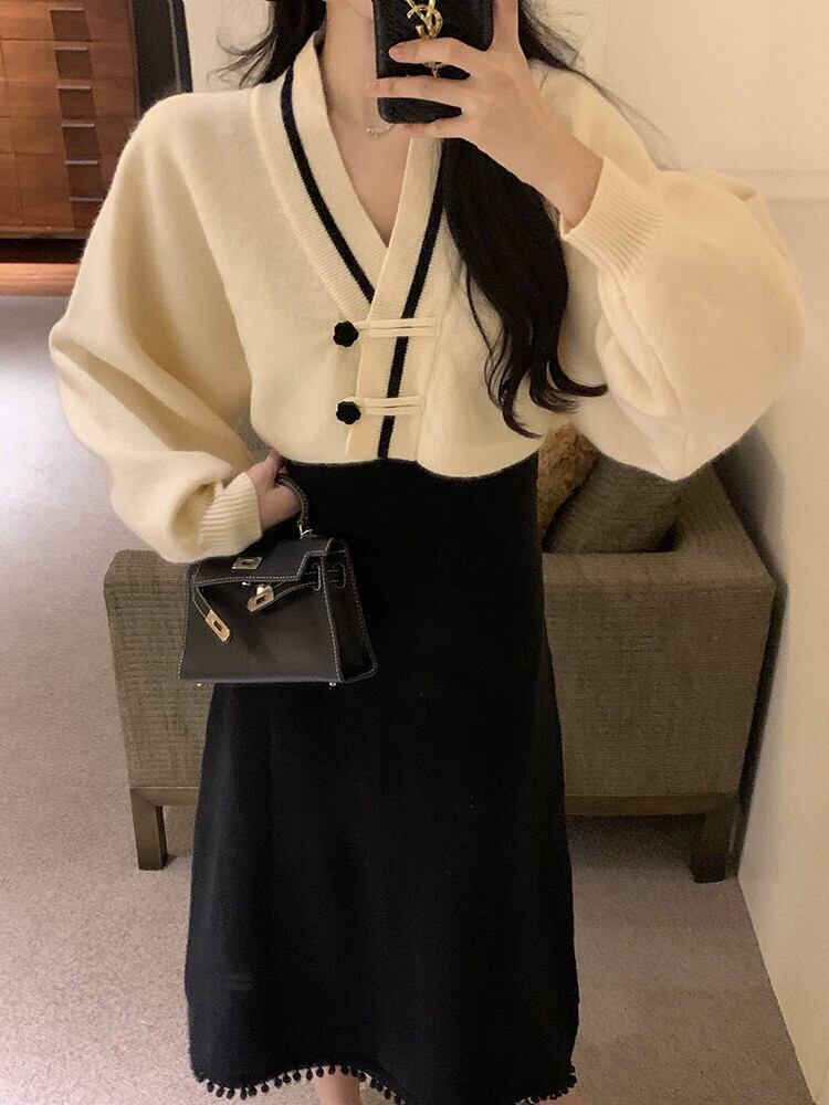 レトロ V ネックディスクボタン長袖セーター女性秋 2023 新デザインニッチシックなバットスリーブセーター ロング オータム 秋物 Vネック missk49160431304