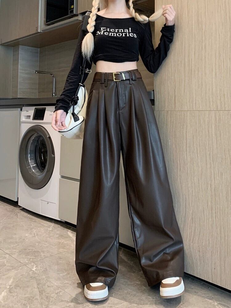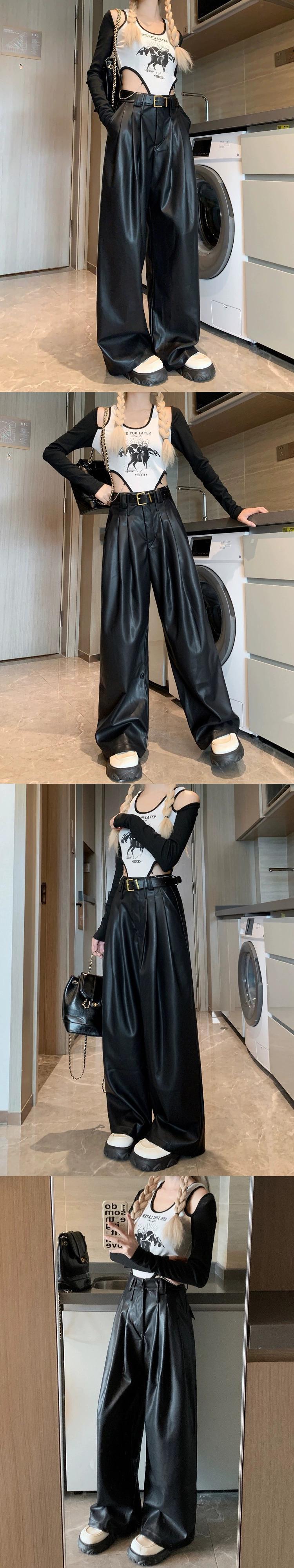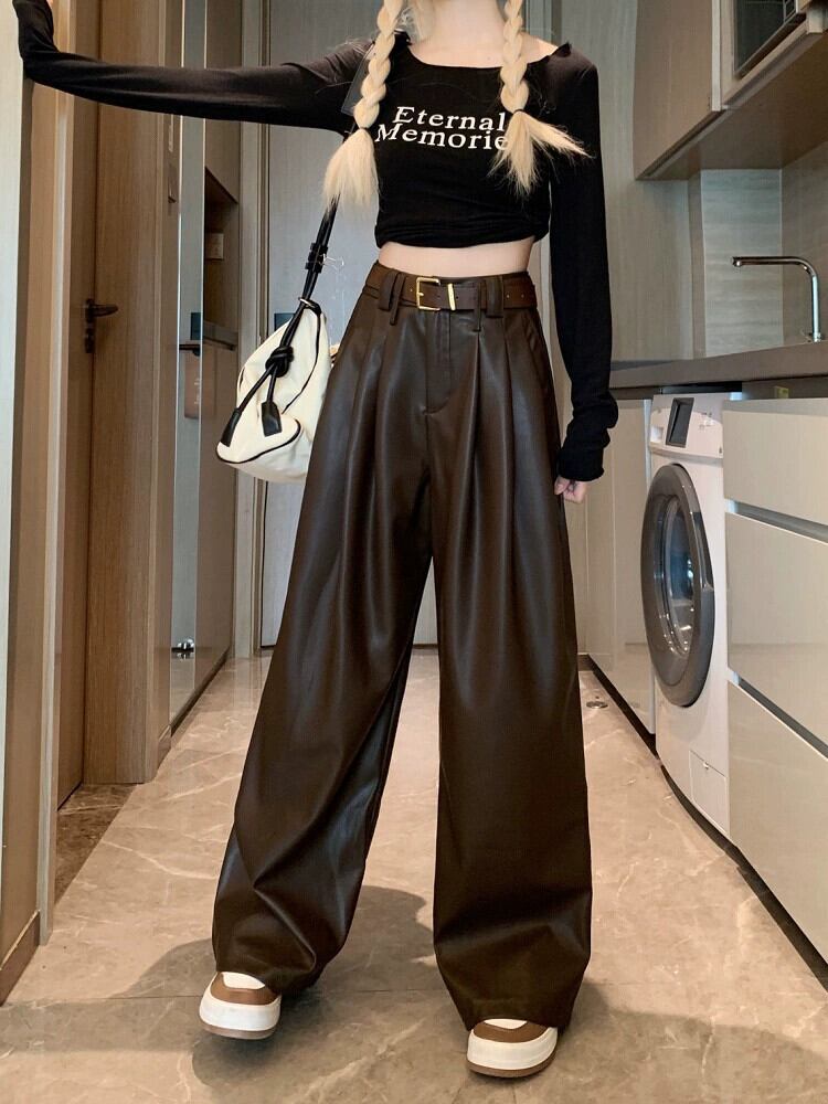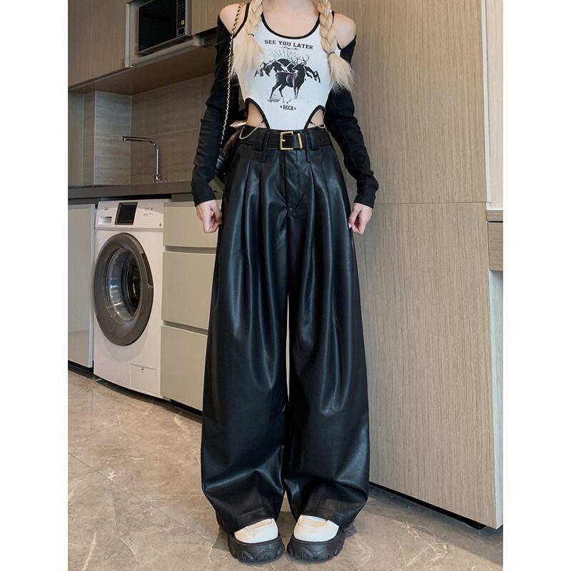 プレスプリーツ PU レザーカジュアルパンツ女性 ins 秋 2023 新デザインハイウエストスリムワイドレッグ万能ロングパンツ ハイウェスト オータム 秋物 ワイドパンツ missk16737515860