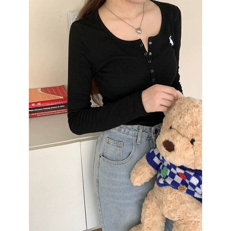 Uネック右肩Tシャツレディース秋バージョン2023新しいスリムフィットショート刺繍インナー長袖ボトムストップ ロング レッド オータム 秋物 missk40571251230