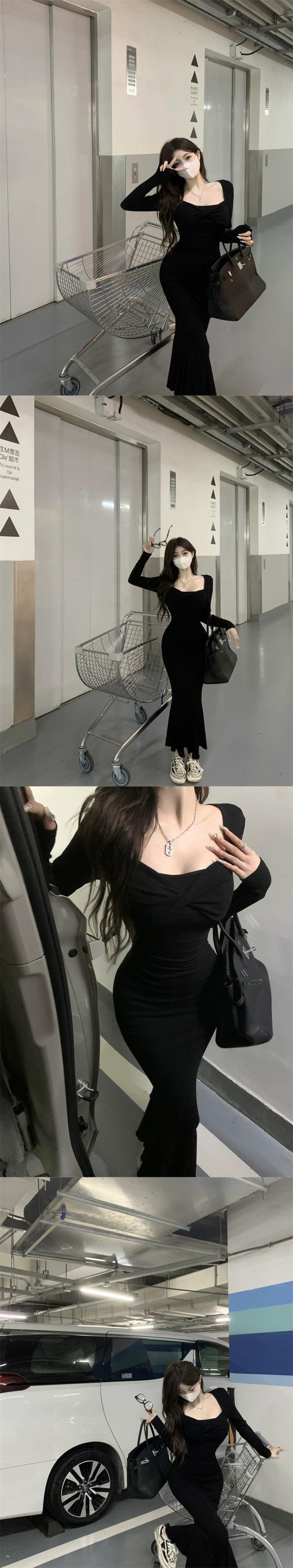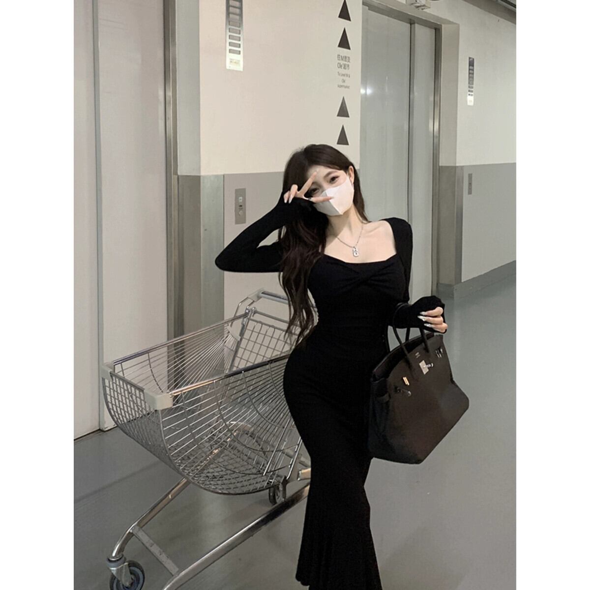 純粋な欲望スタイルスリムウエストドレス秋の新ソリッドカラー気質クロスプリーツデザインヒップハグロングスカート女性 オータム 秋物 missk16634092747