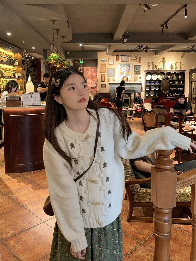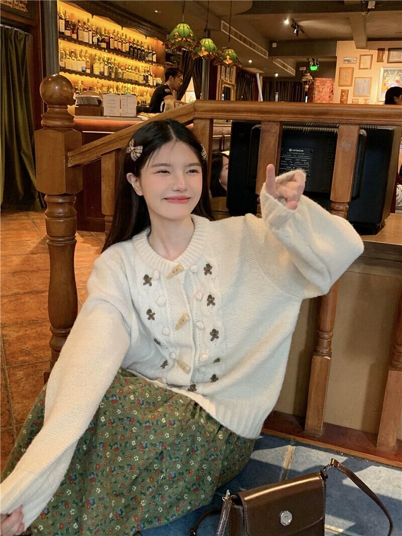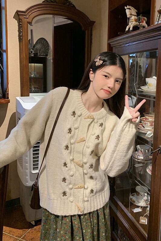 レトロスタイル ese スタイルかぎ針編みホーンボタンセータージャケット秋の新ラウンドネックカーディガン長袖ニットトップ女性のトレンド ロング オータム 秋物 Oネック missk8219736076