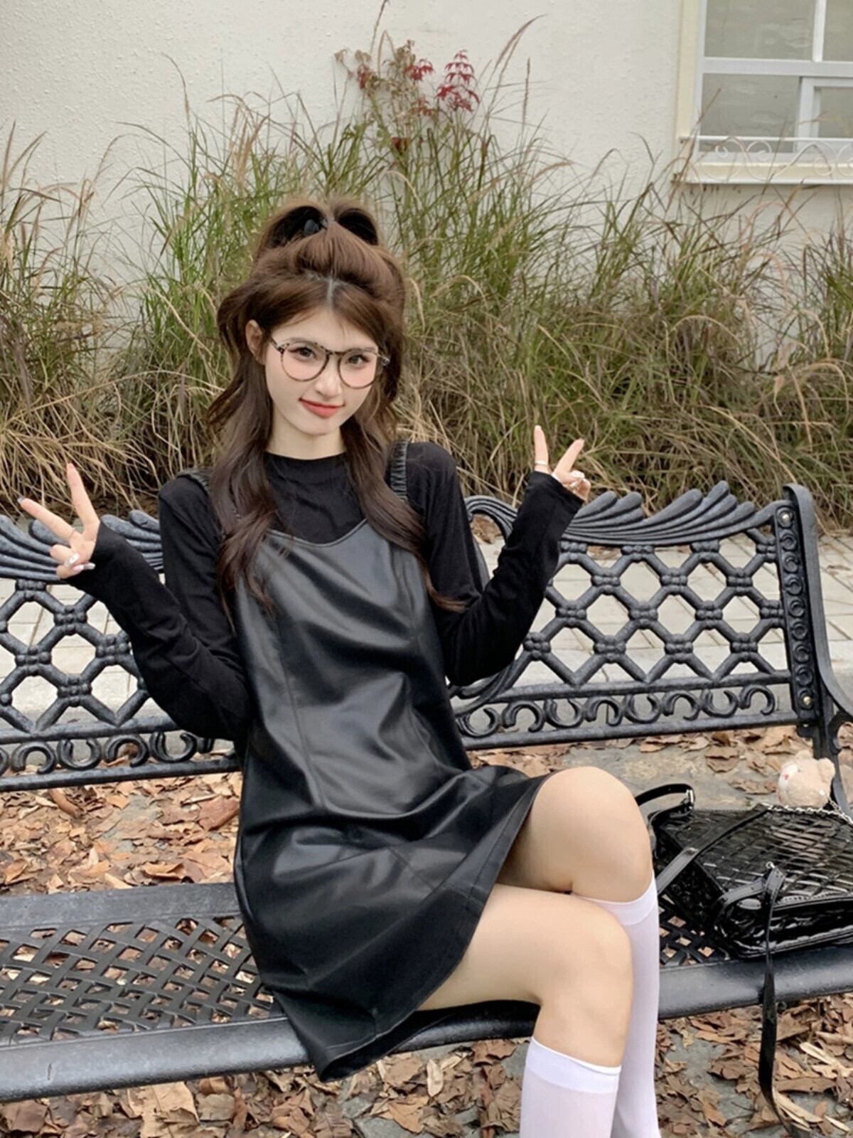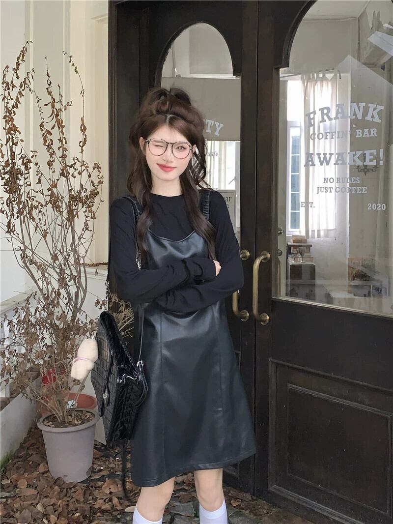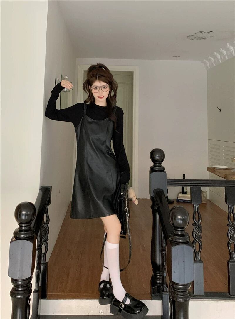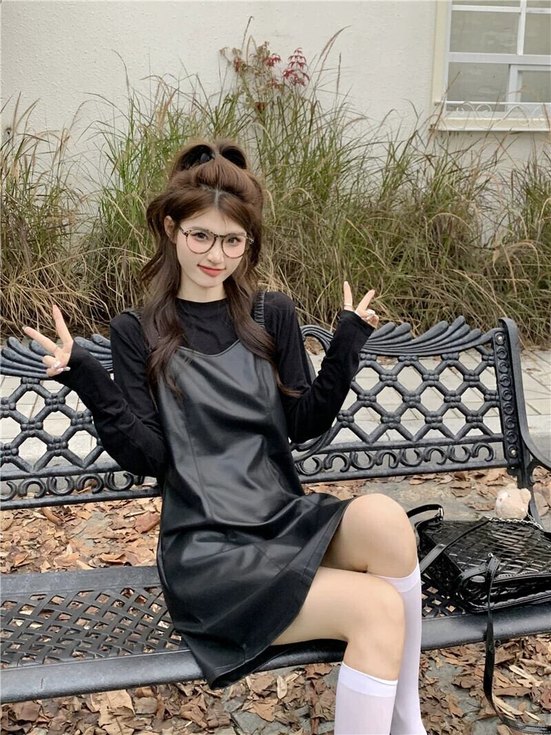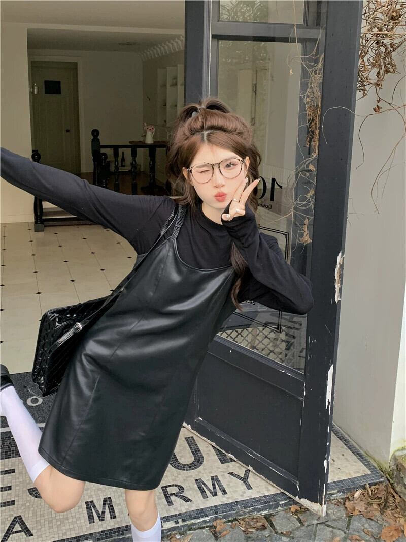 Pu レザーサスペンダードレス女性秋バージョン 2023 新しいハイエンド小さな黒痩身 A ラインスカート ブラック オータム 秋物 Aライン missk13830862938