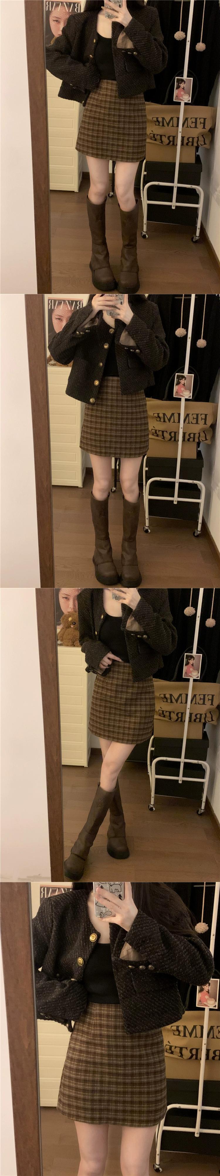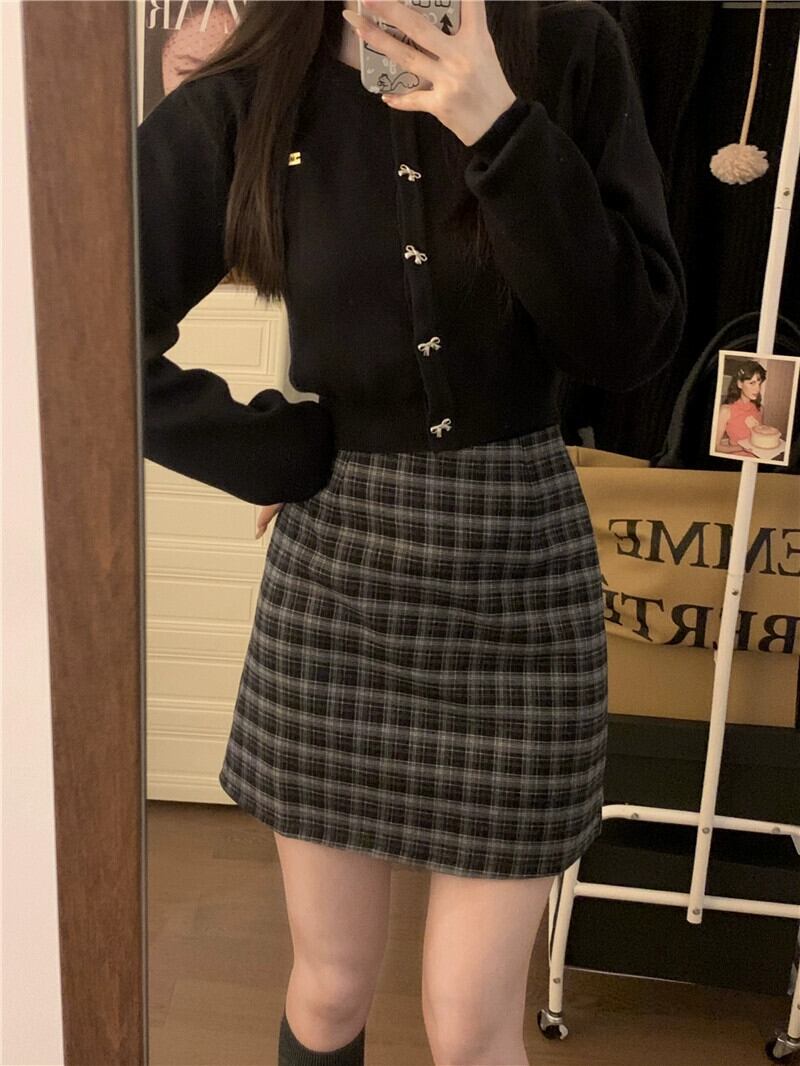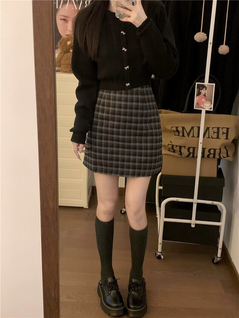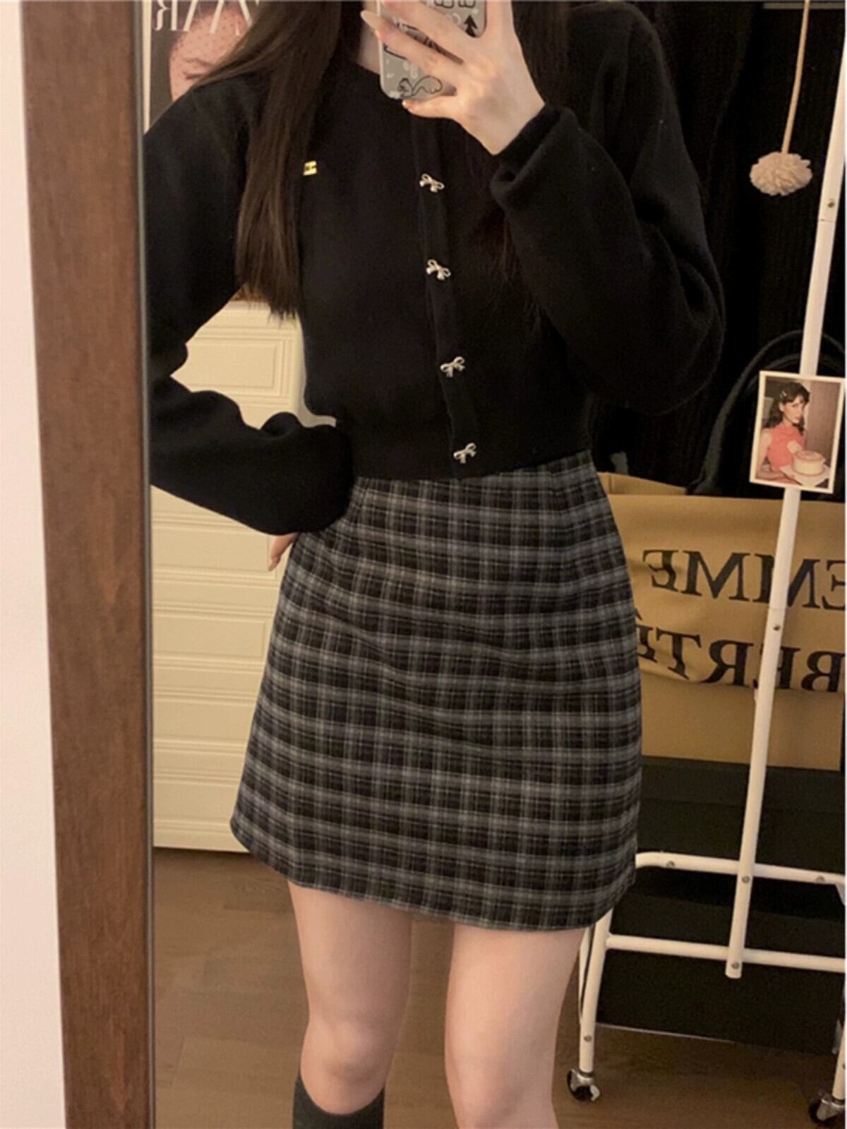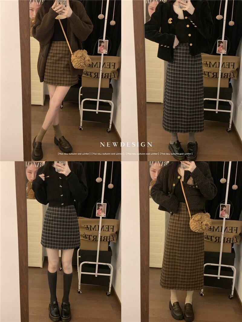 レトロチェック柄起毛スカート女性の秋 2023 ウエスト痩身 A ラインヒップカバーショートスカート オータム 秋物 Aライン missk88066917510
