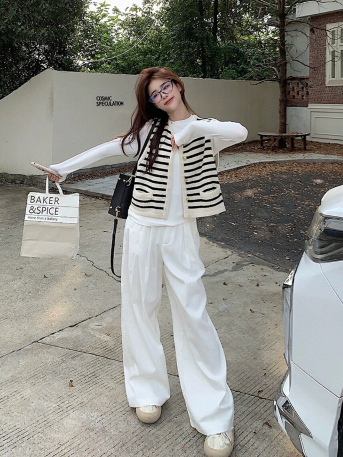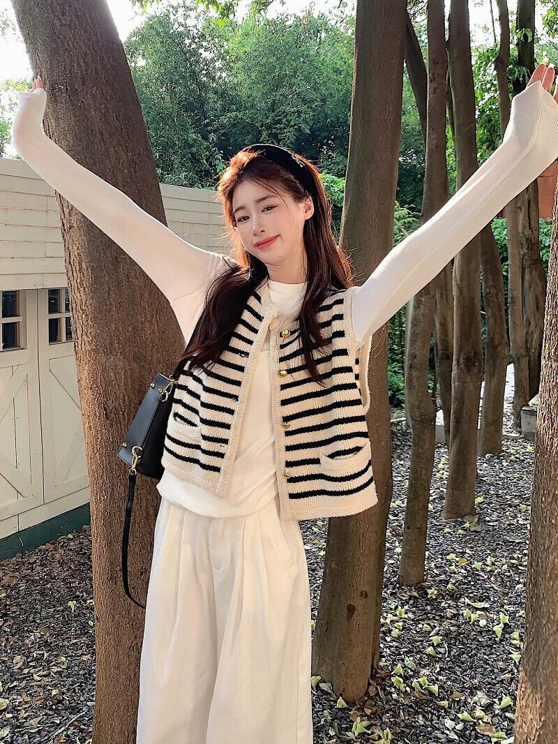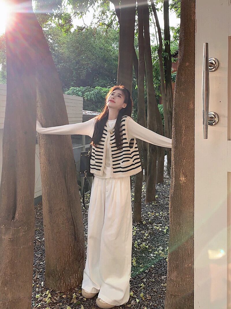 Xiaoxiangfeng ストライプコントラストカラーニットベストボトリングシャツワイドレッグパンツ女性の秋 2023 スーツ オータム 秋物 ワイドパンツ missk7026947117