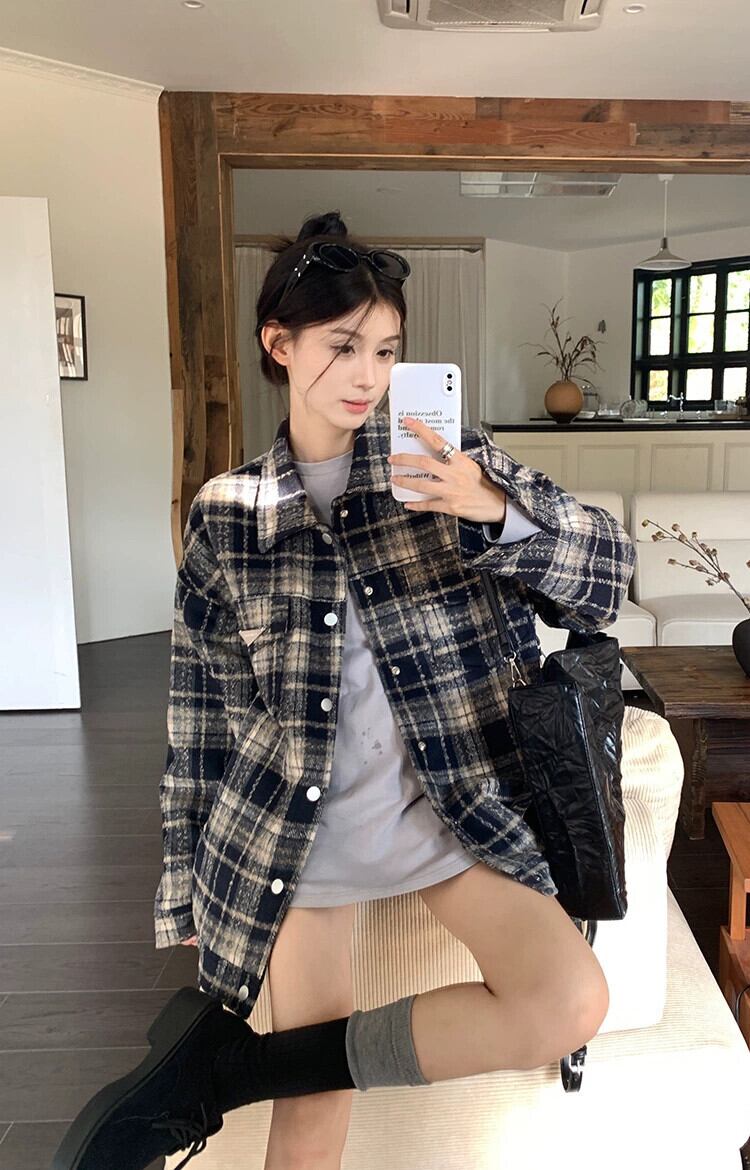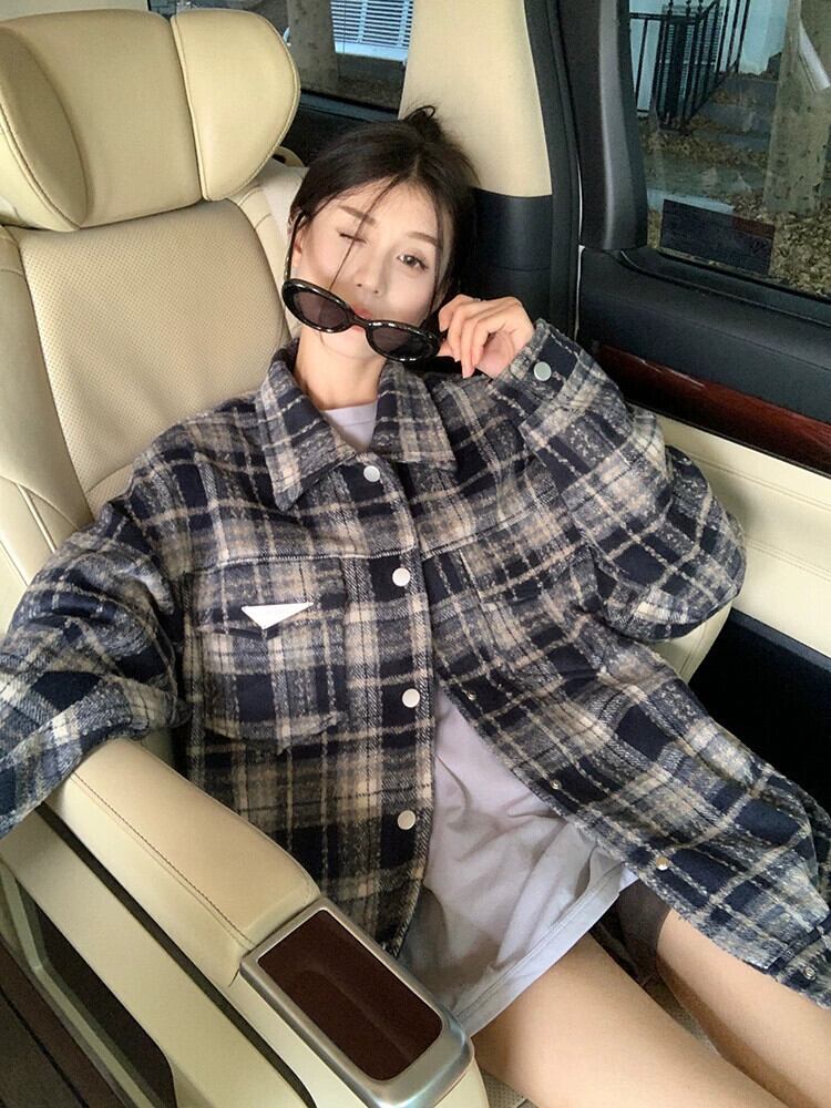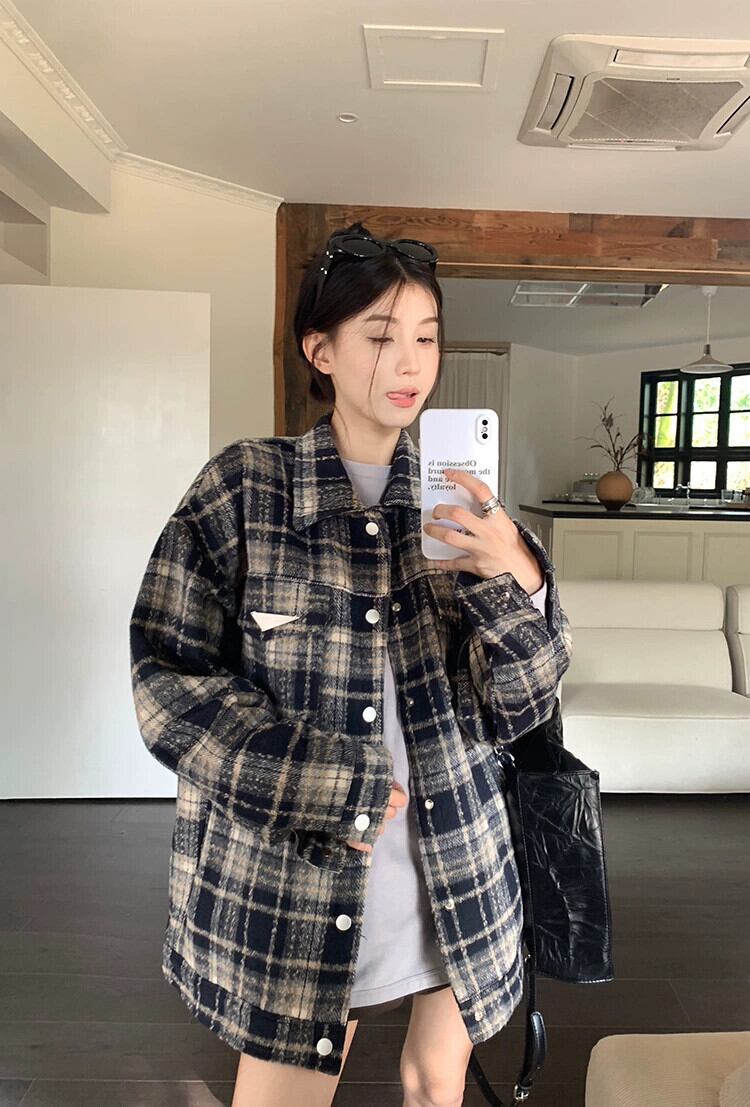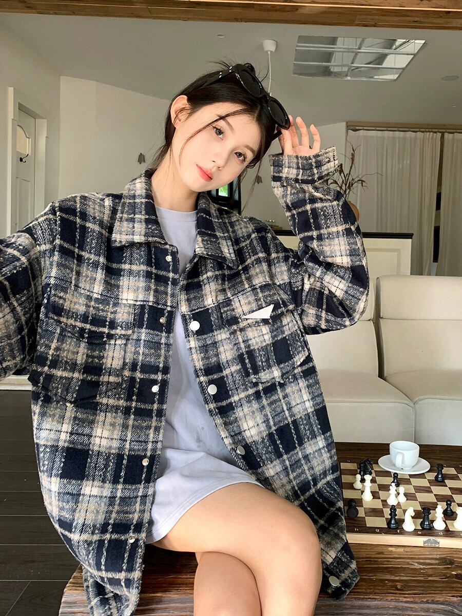 アメリカンレトロチェック柄ウールコートの女性の秋冬 2023 新しいルーズミッドレングス塩スタイル多目的長袖トップ ロング オータム 秋物 ウィンター 冬物 missk66100264664