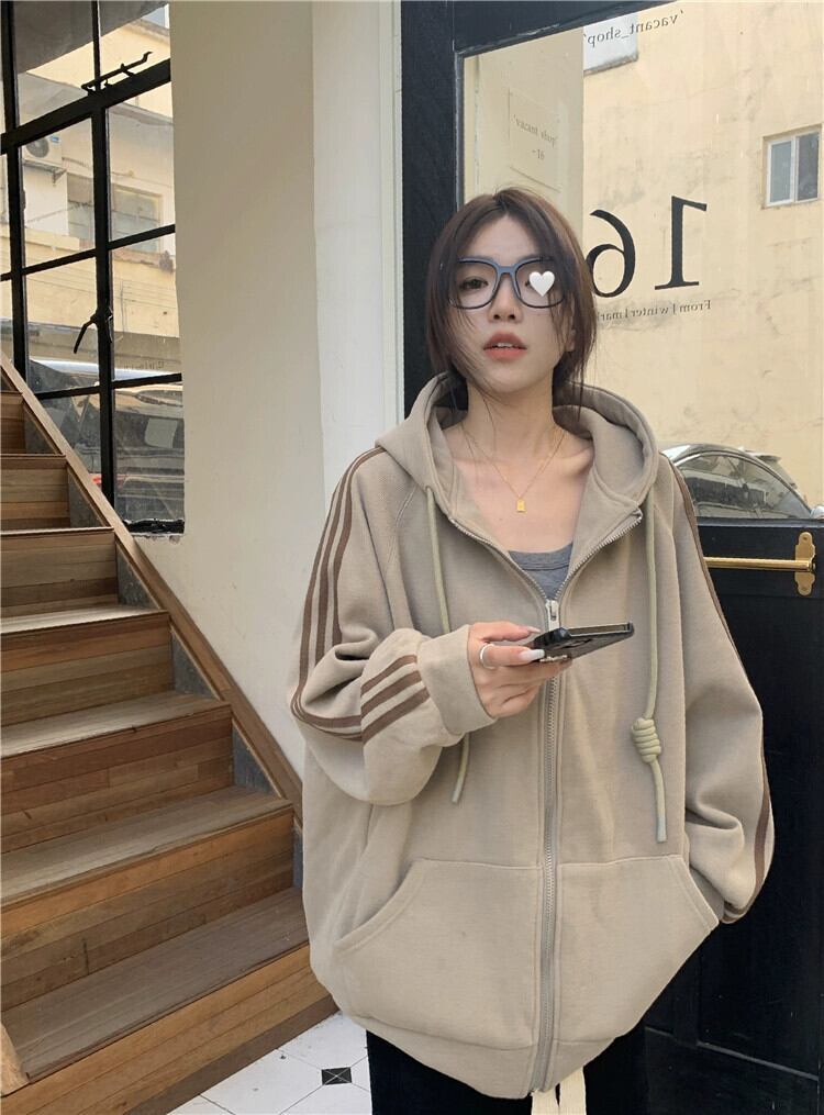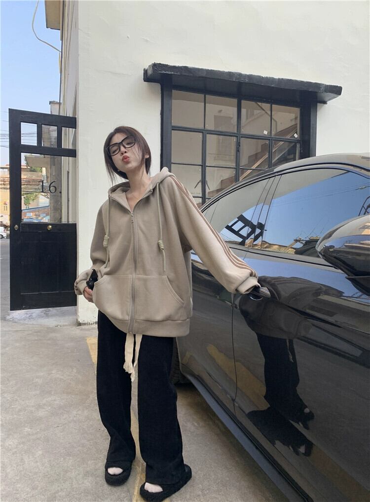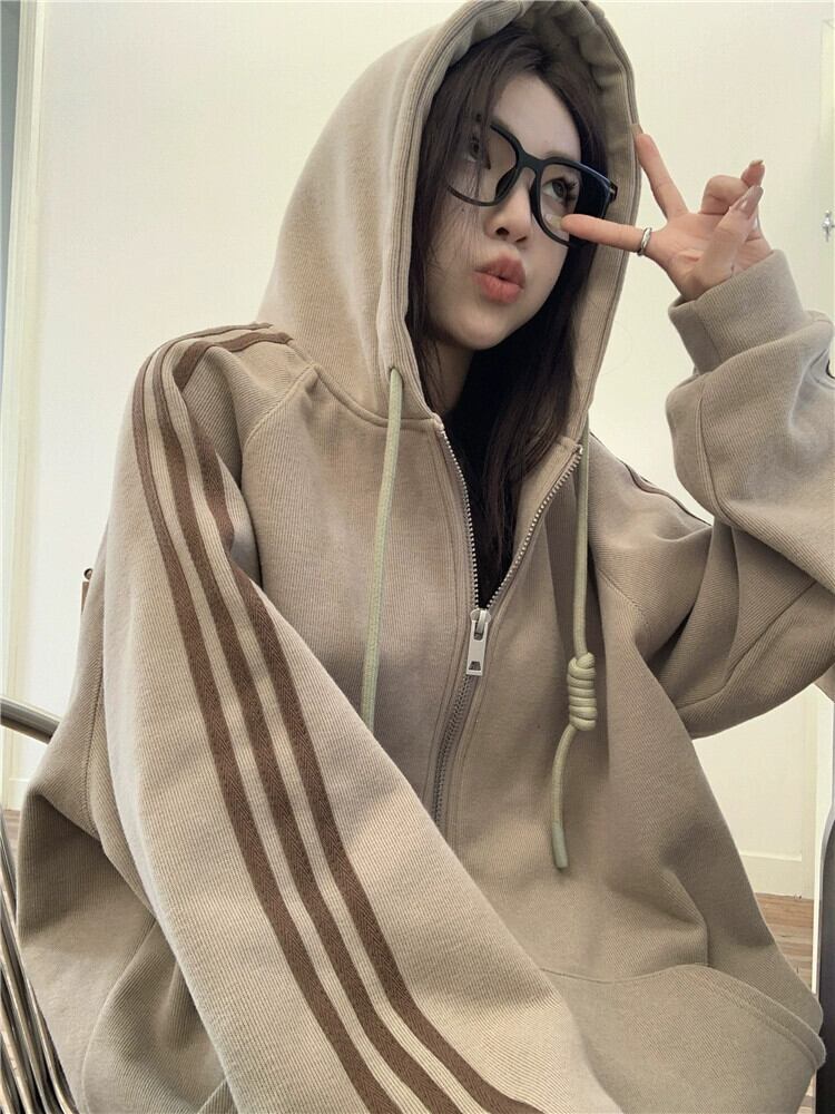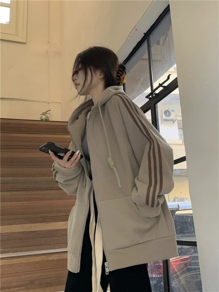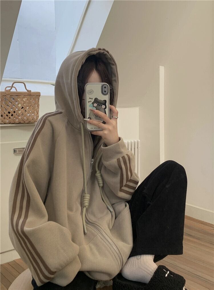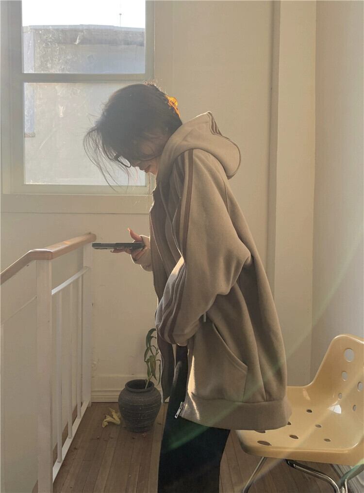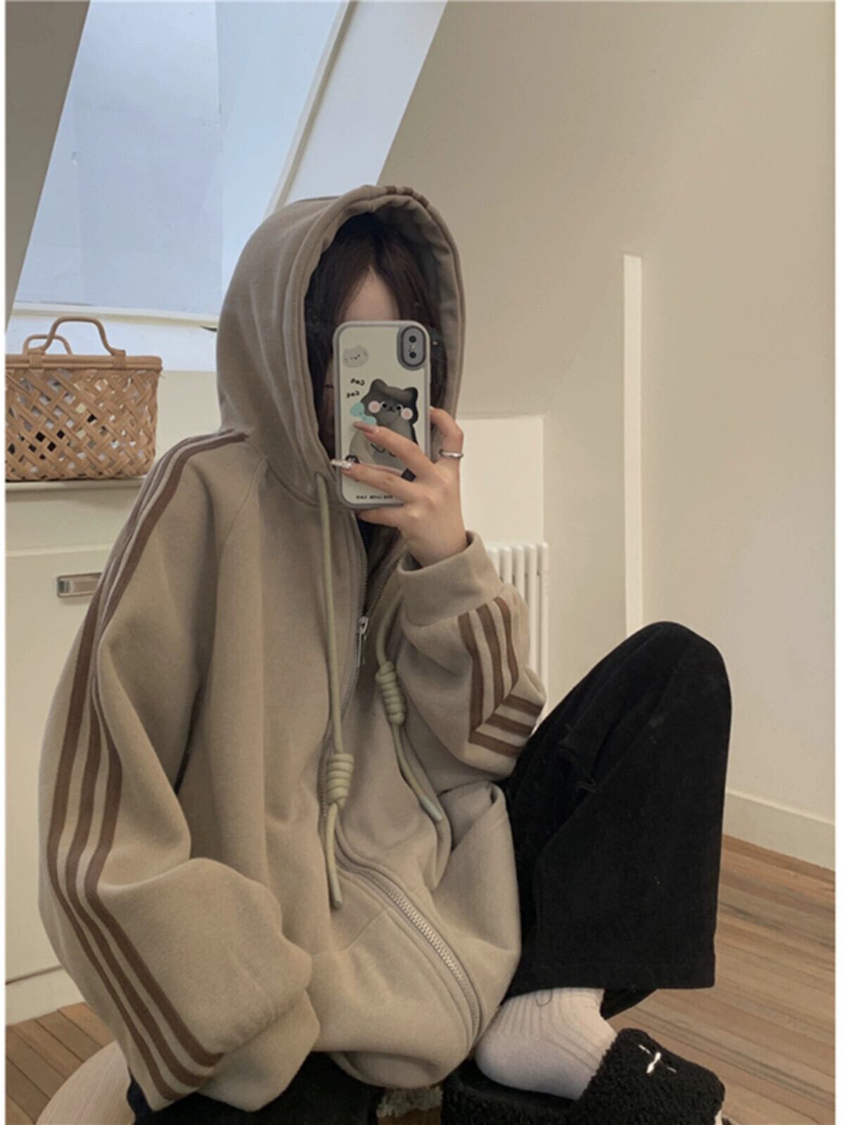 ベルベット肥厚フード付きスウェットシャツジャケット女性秋と冬 2023 新しいアメリカンレトロルーズ多用途長袖トップトレンディ ロング オータム 秋物 ウィンター 冬物 missk73859882694