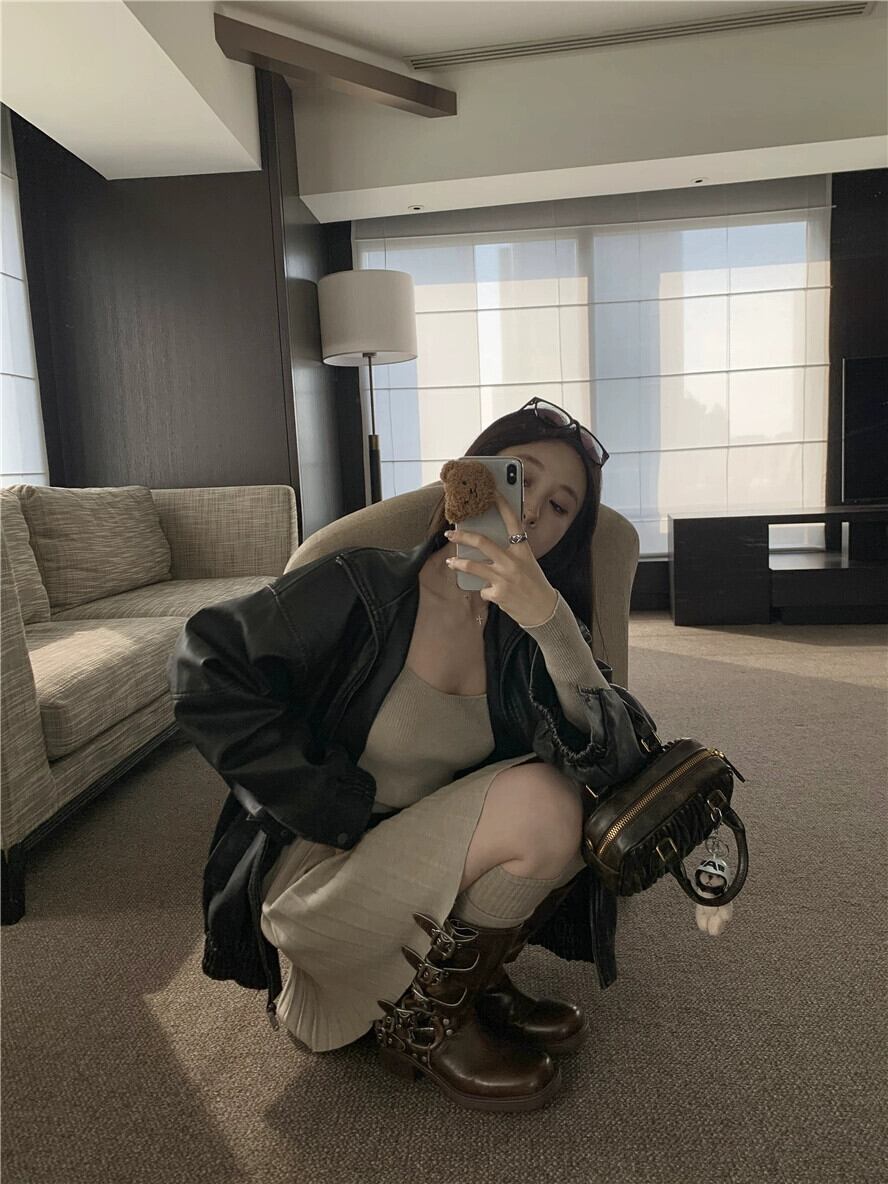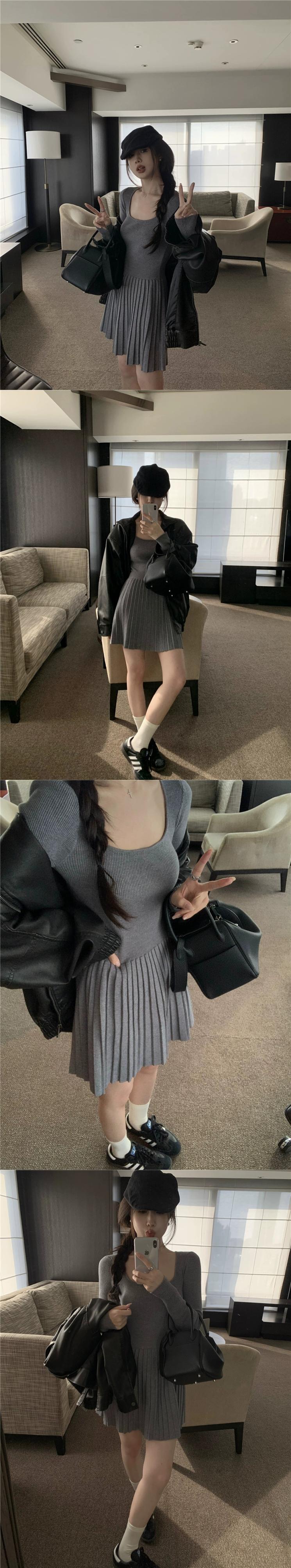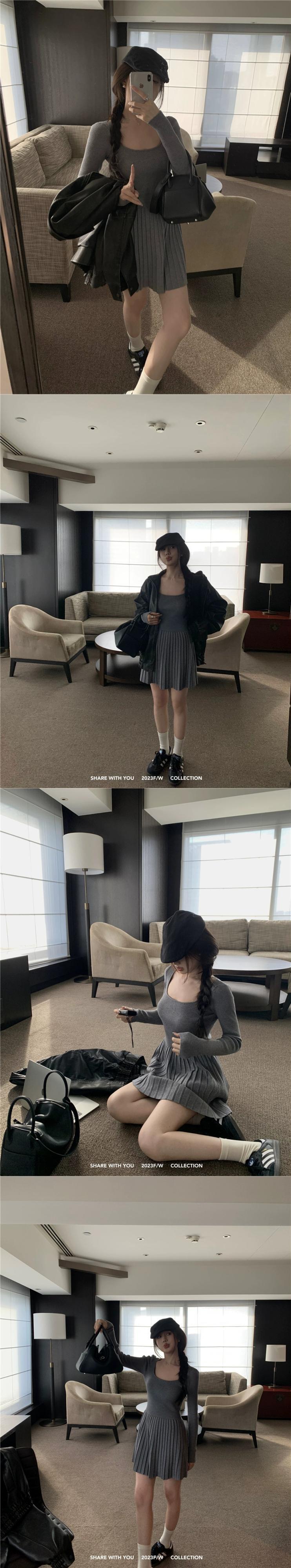 スクエアネック長袖ニットドレス女性秋 2023 新スタイルフレンチスリムフィット A ラインプリーツボトムスカート ロング オータム 秋物 Aライン スクウェア missk87536722243