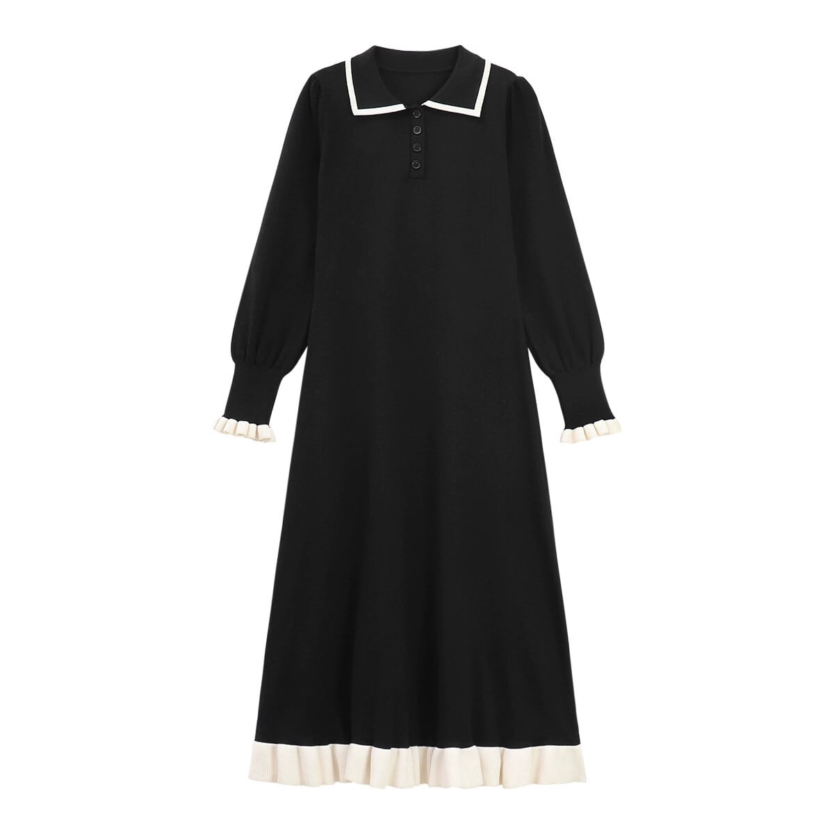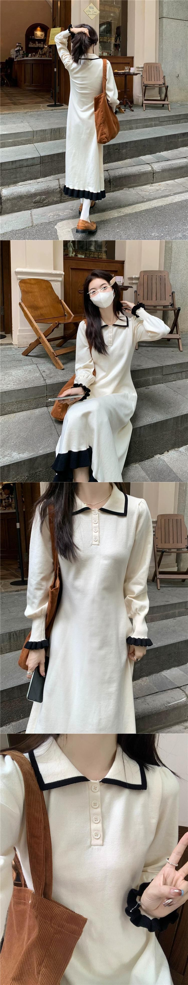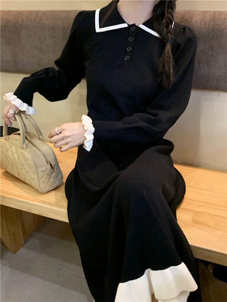 2023 秋のポロカラーニットドレスの女性の新しい気質対照的な色ミッドレングスウエスト痩身長袖スカート ロング オータム 秋物 missk26299685493