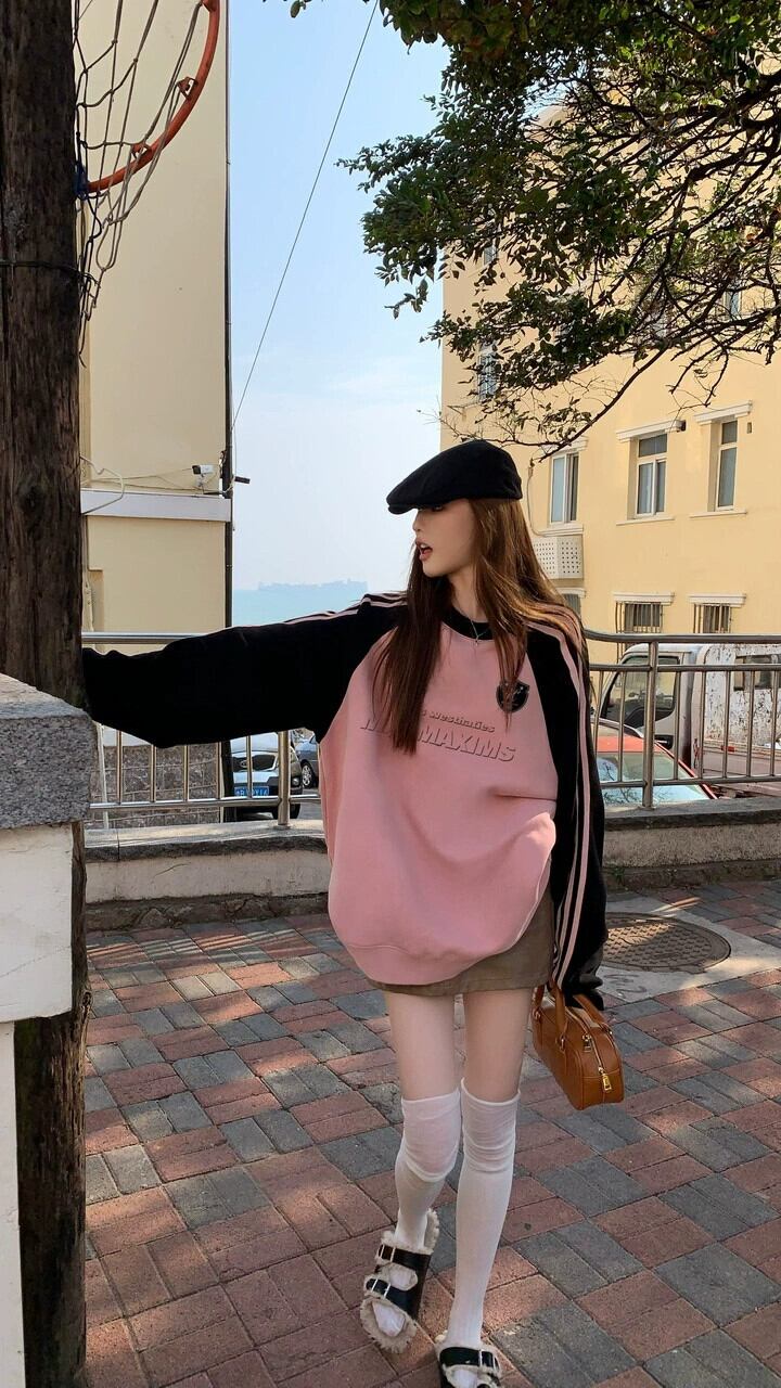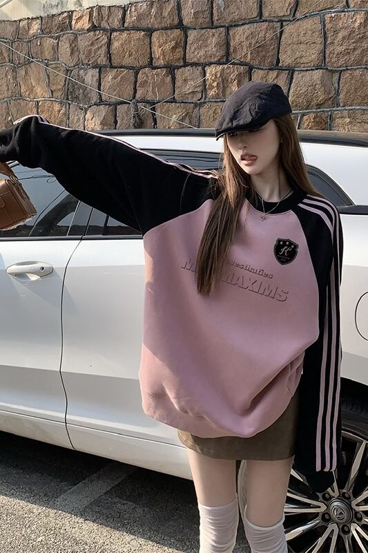 ベルベット肥厚スウェットシャツ女性の秋と冬 2023 新しいスタイルアメリカンレトロコントラストストライプレタープリント長袖トップトレンディ ロング オータム 秋物 ウィンター 冬物 missk96707548676