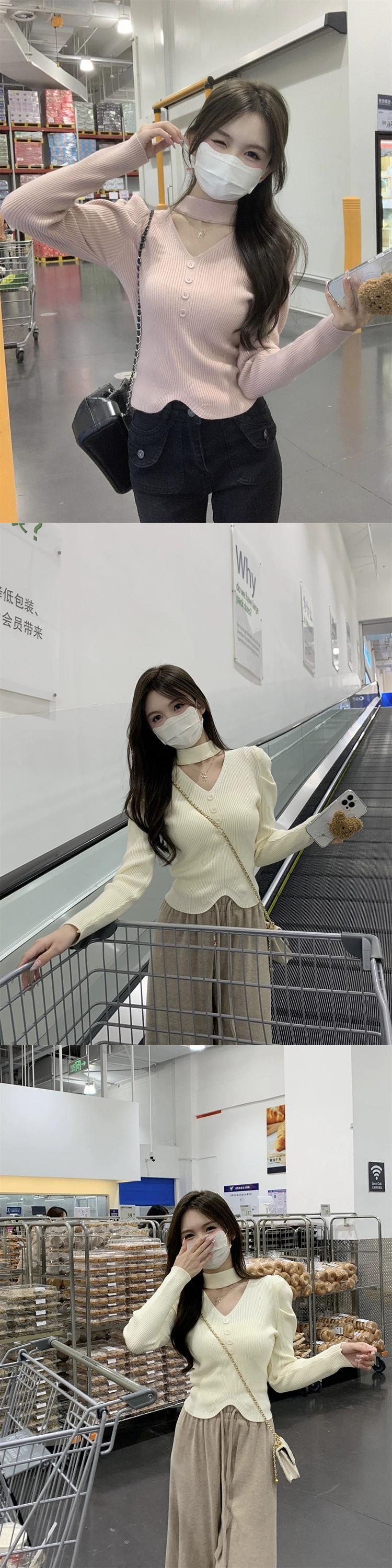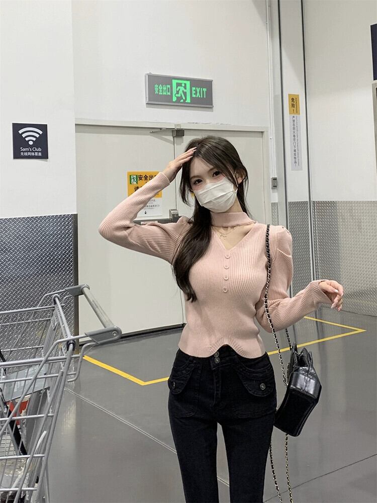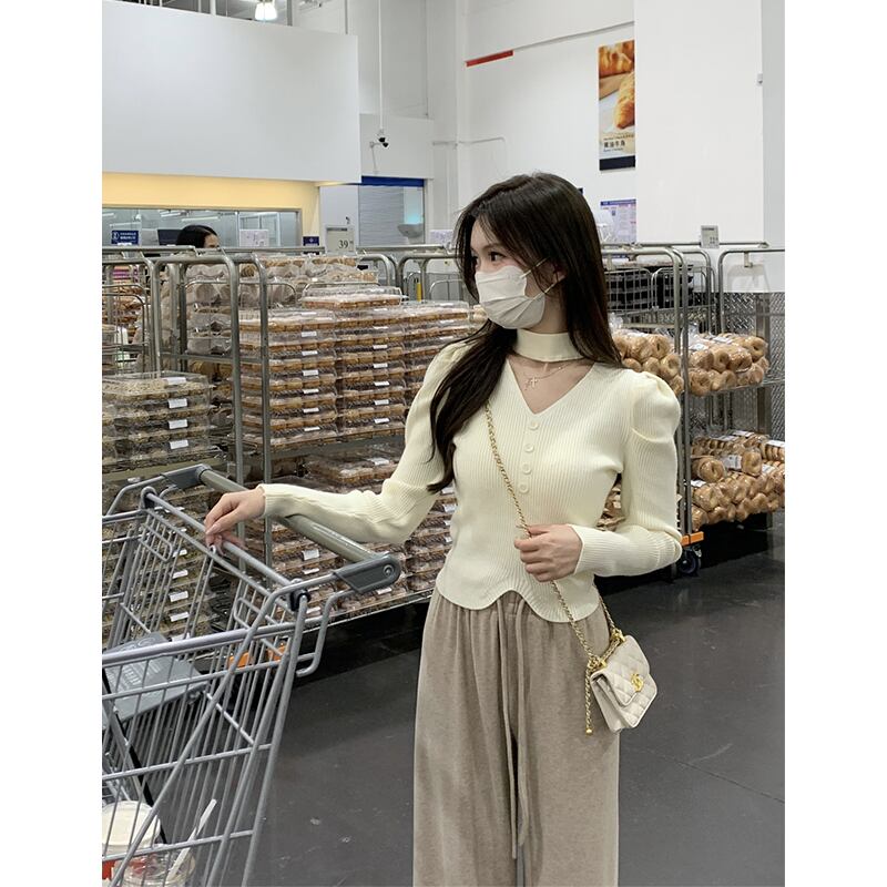 V ネックホルターネック長袖セーター女性秋冬 2023 新しいフレンチデザインスリムフィットボトシャツトップ ロング オータム 秋物 ウィンター 冬物 Vネック missk11844944965