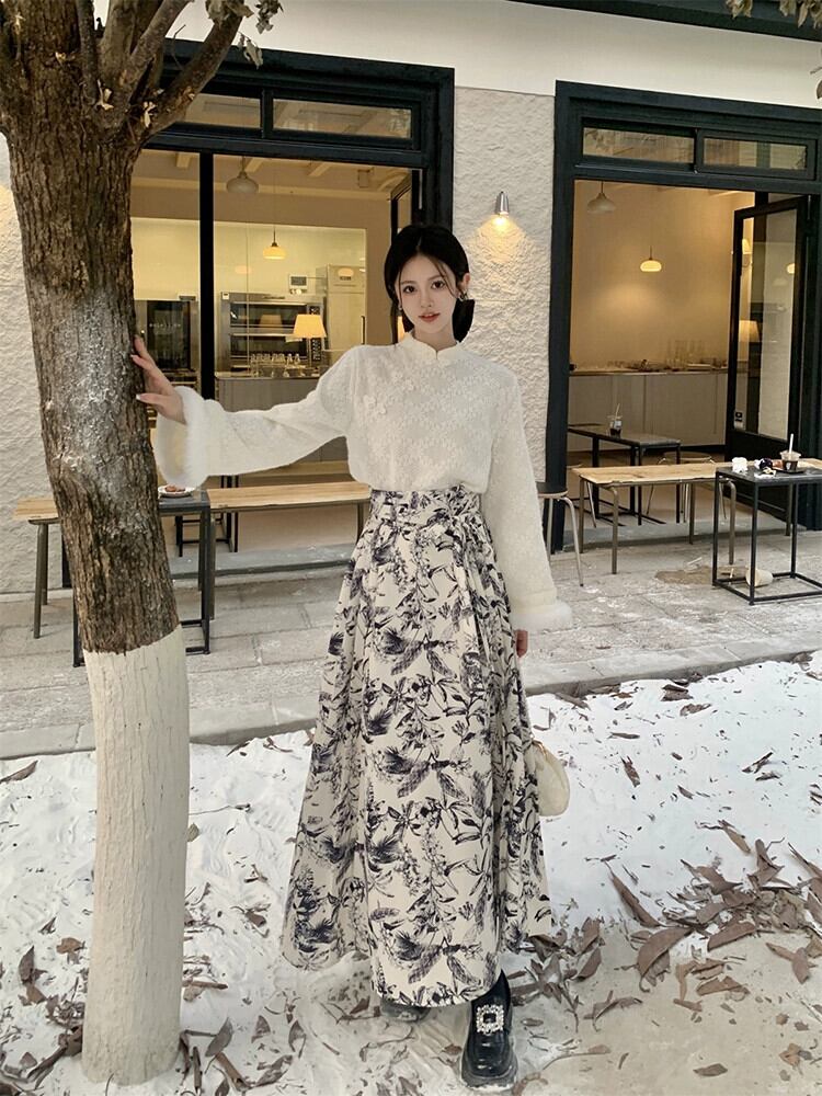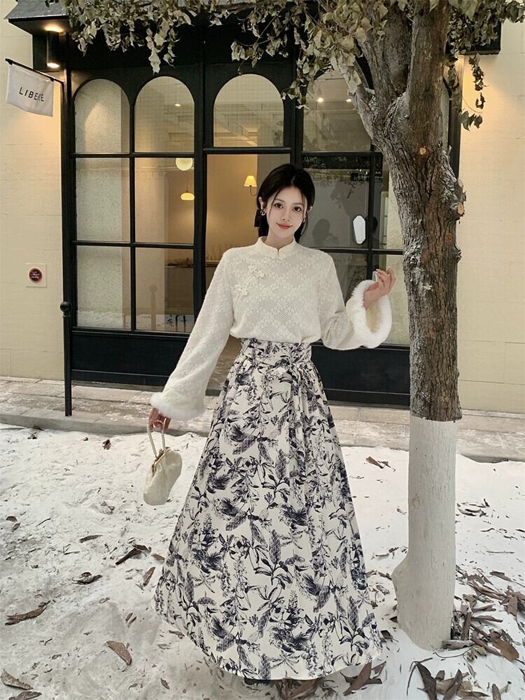 中国風のデザイン立ち襟長袖トップ気質馬の顔ハーフレングススカート女性の秋と冬の 2023 新しい 2 点セット ロング オータム 秋物 ウィンター 冬物 missk78951560860