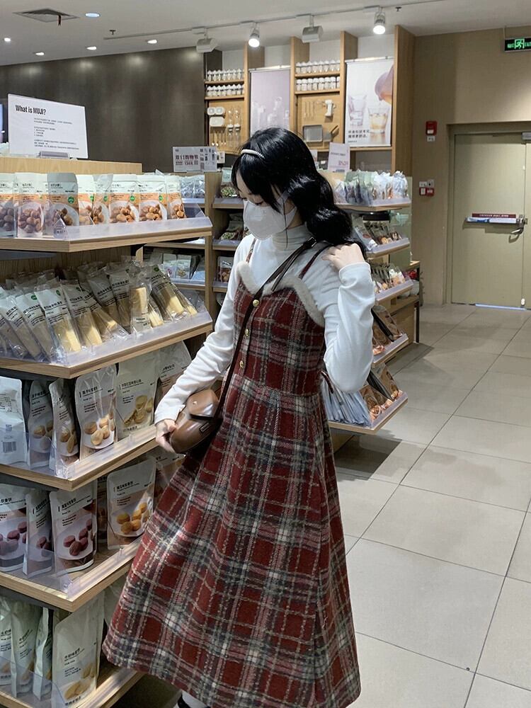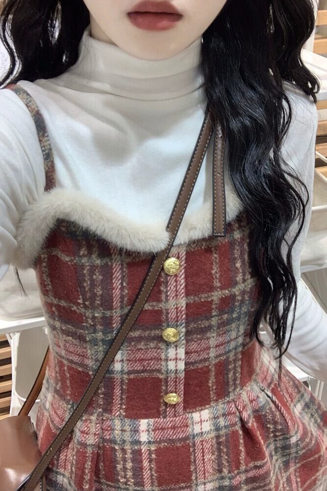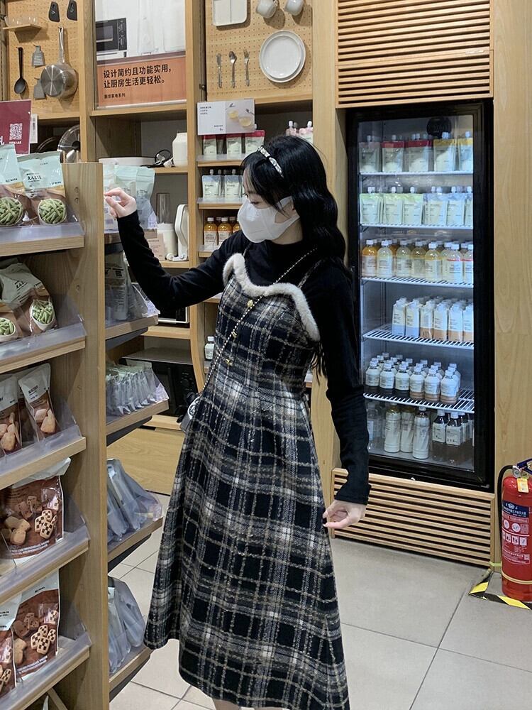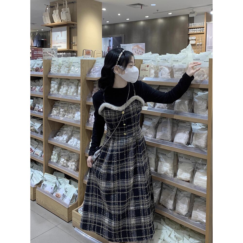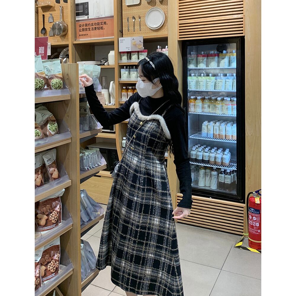 毛皮のようなステッチチェック柄サスペンダードレスの女性の秋と冬 2023 新しいフレンチスタイルウエスト痩身ミッドレングス A ラインスカート オータム 秋物 ウィンター 冬物 Aライン missk85277370497