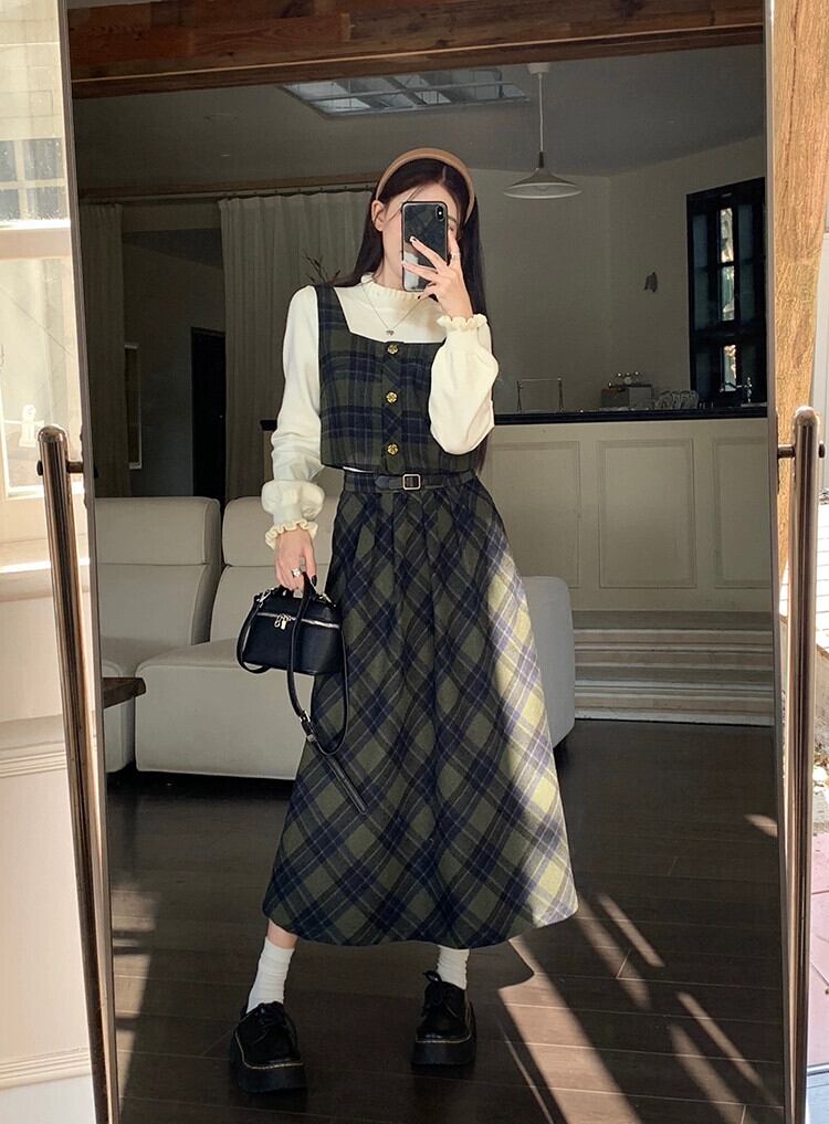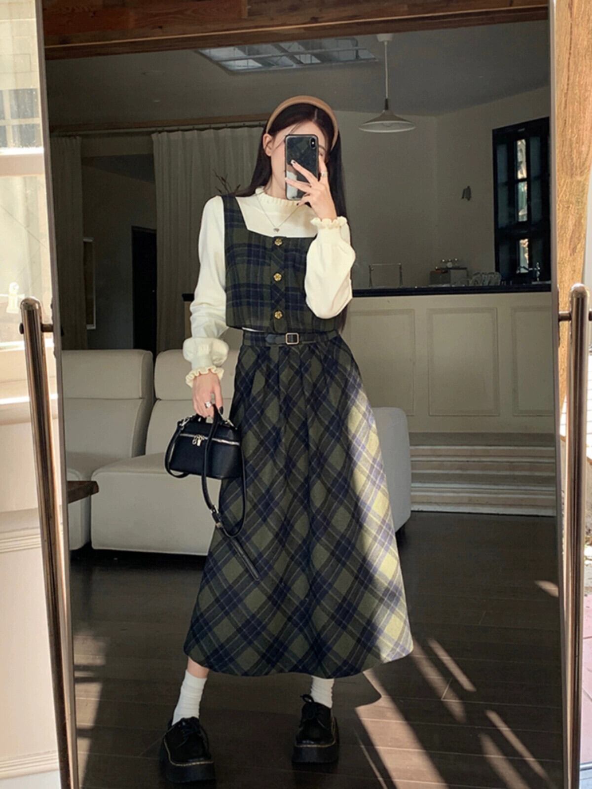 フレンチレトロチェック柄ウールベストボトシャツミッドレングススカート女性の秋冬 2023 新しいファッションスーツ オータム 秋物 ウィンター 冬物 missk91731591858