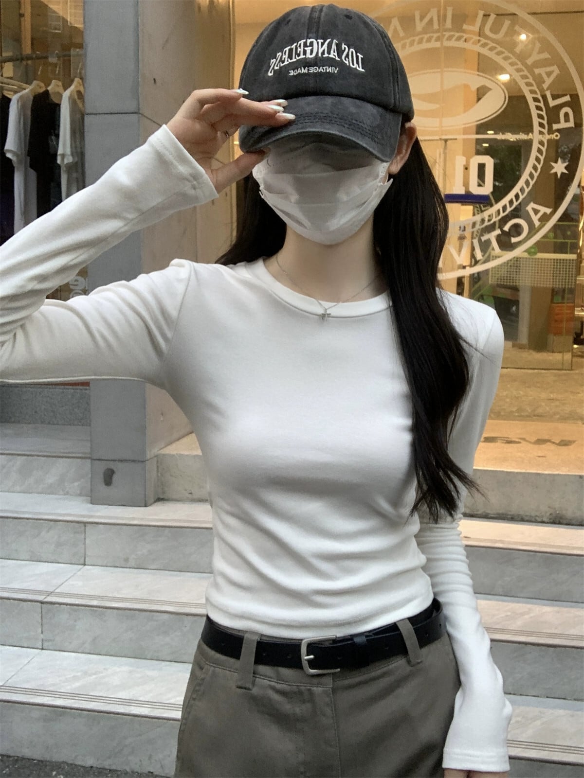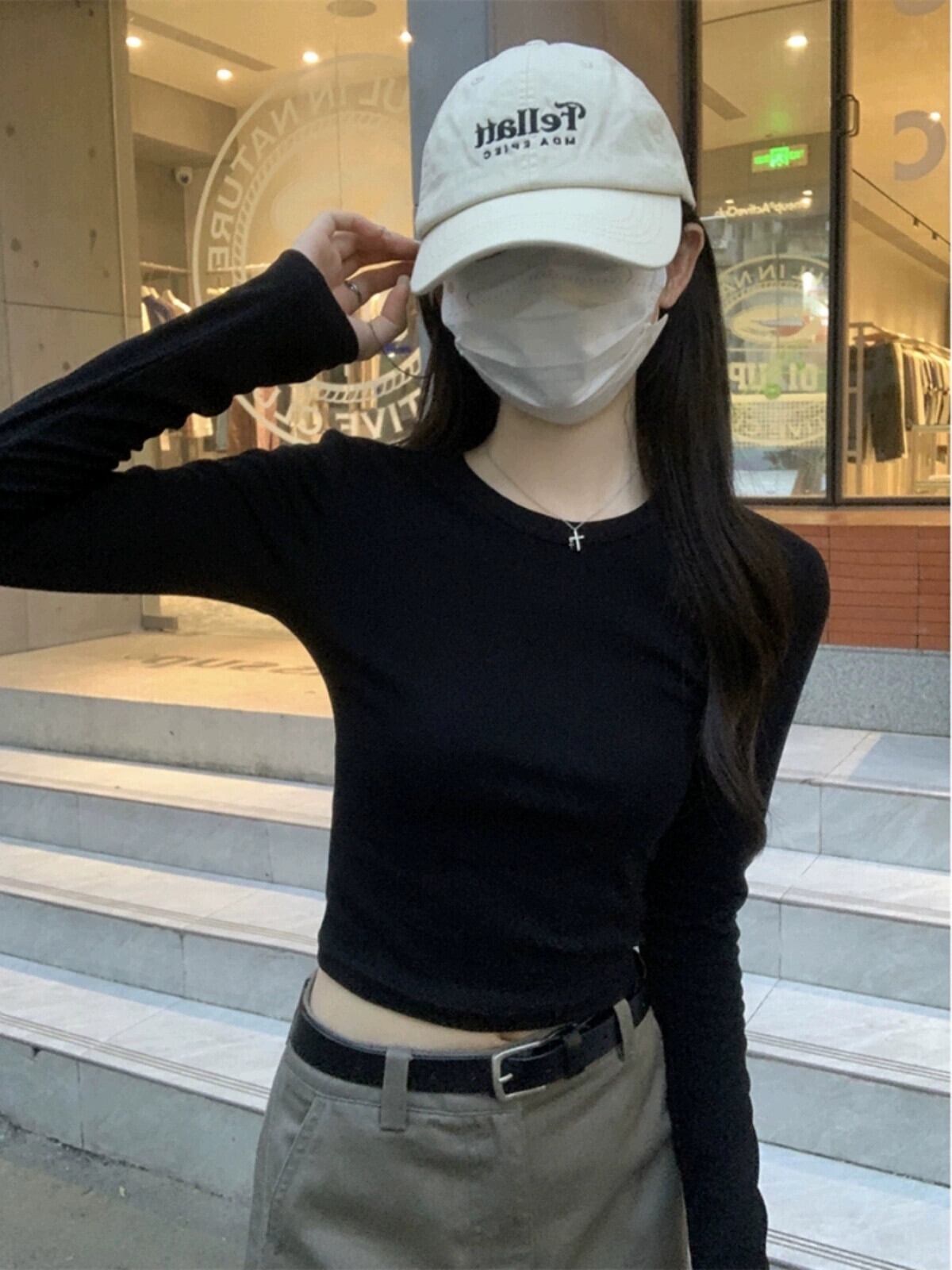 白インナー長袖Tシャツレディース2023秋冬新ベーシックスタイルスリム右肩ラウンドネックボトリングシャツトップ ロング ホワイト オータム 秋物 ウィンター 冬物 Oネック missk63200692770
