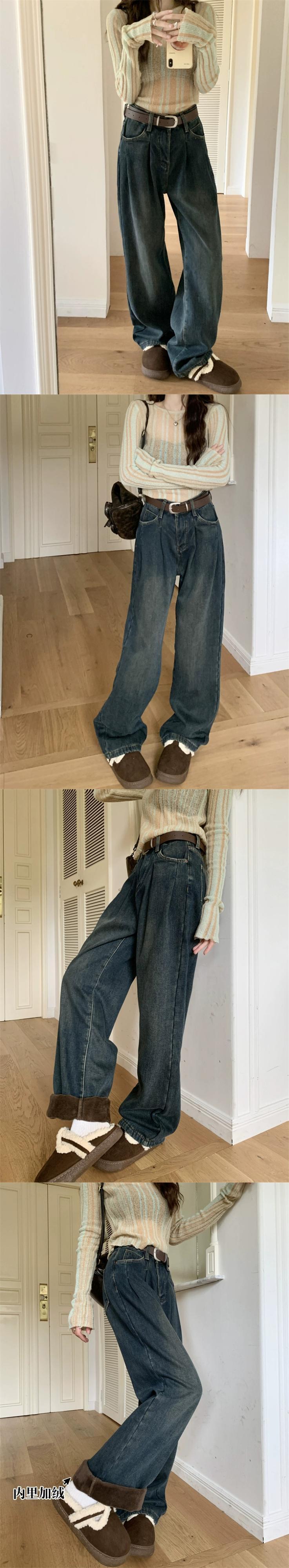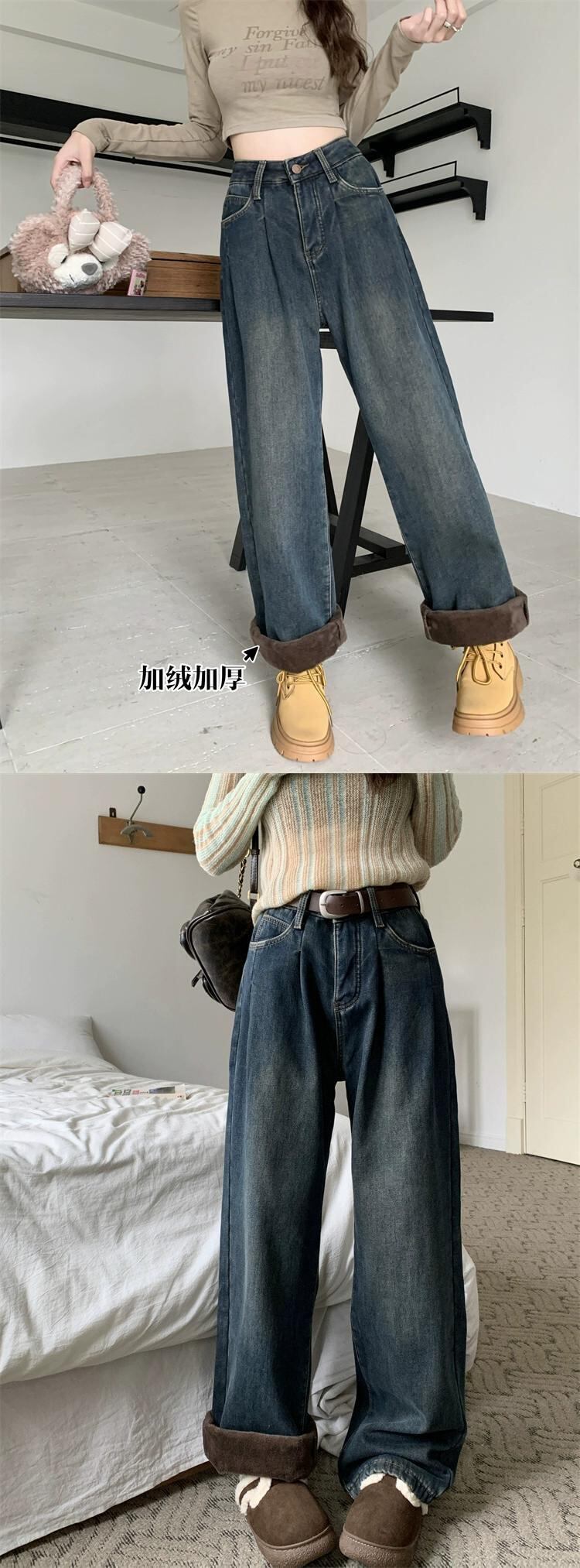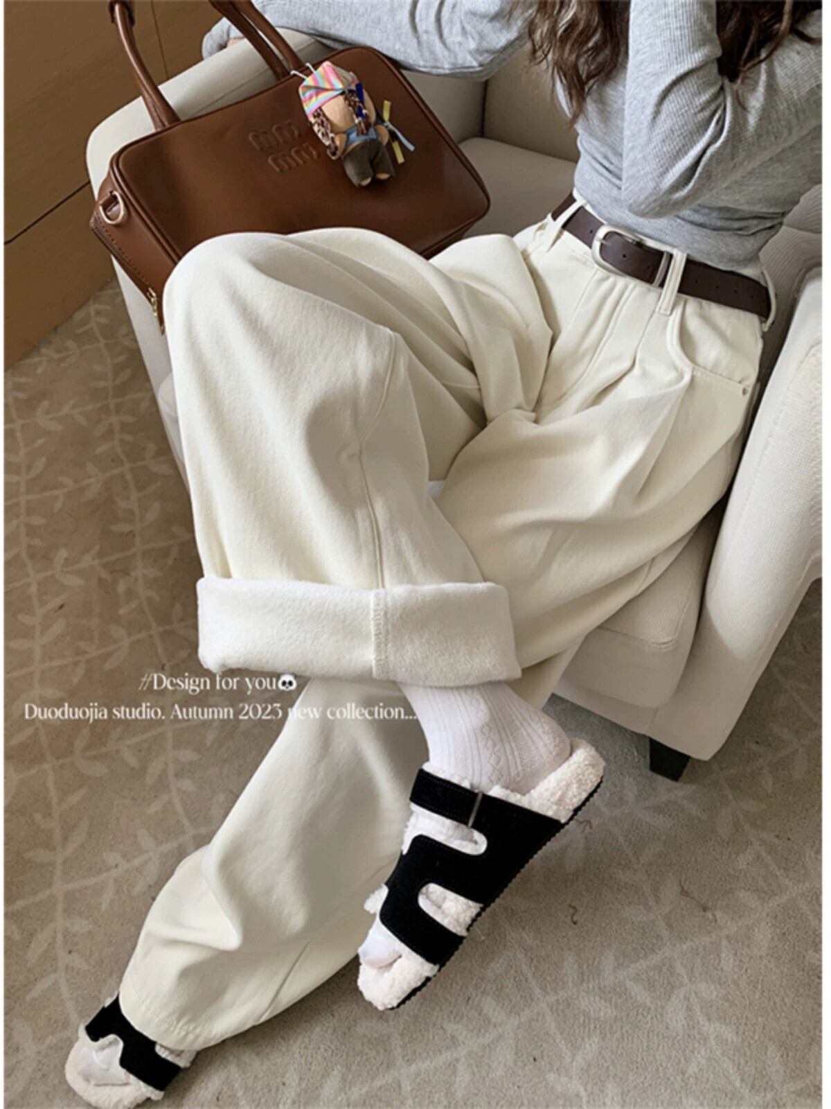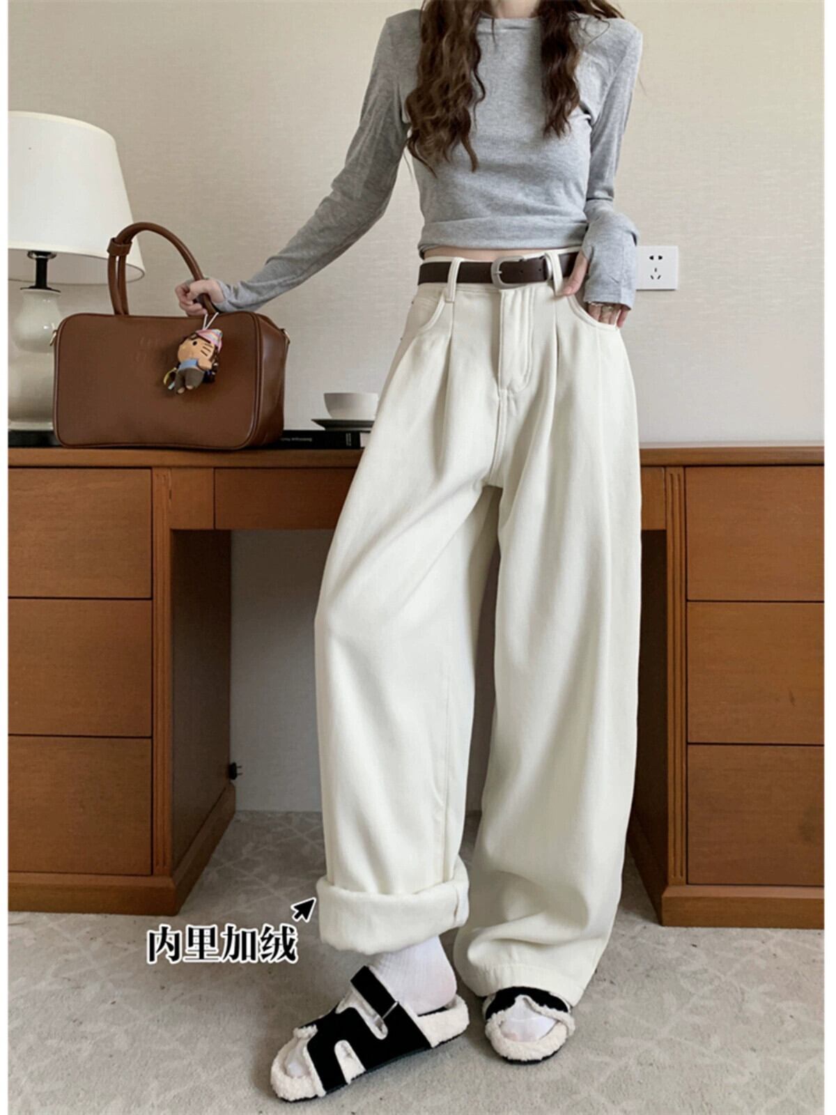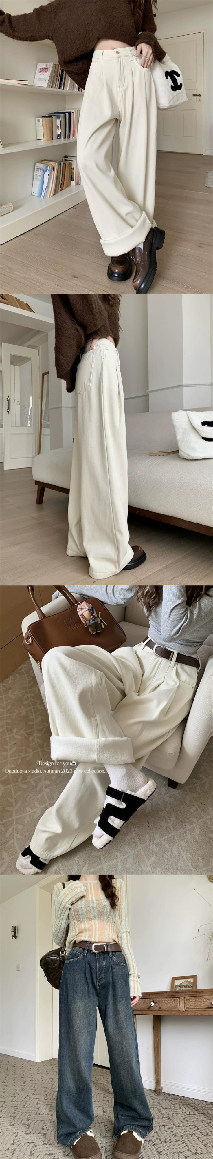 ベルベット肥厚暖かいジーンズ女性秋冬 2023 新しい白ハイウエストドレープワイドレッグパンツストレートレッグパンツ ホワイト オータム 秋物 ウィンター 冬物 missk80097534386