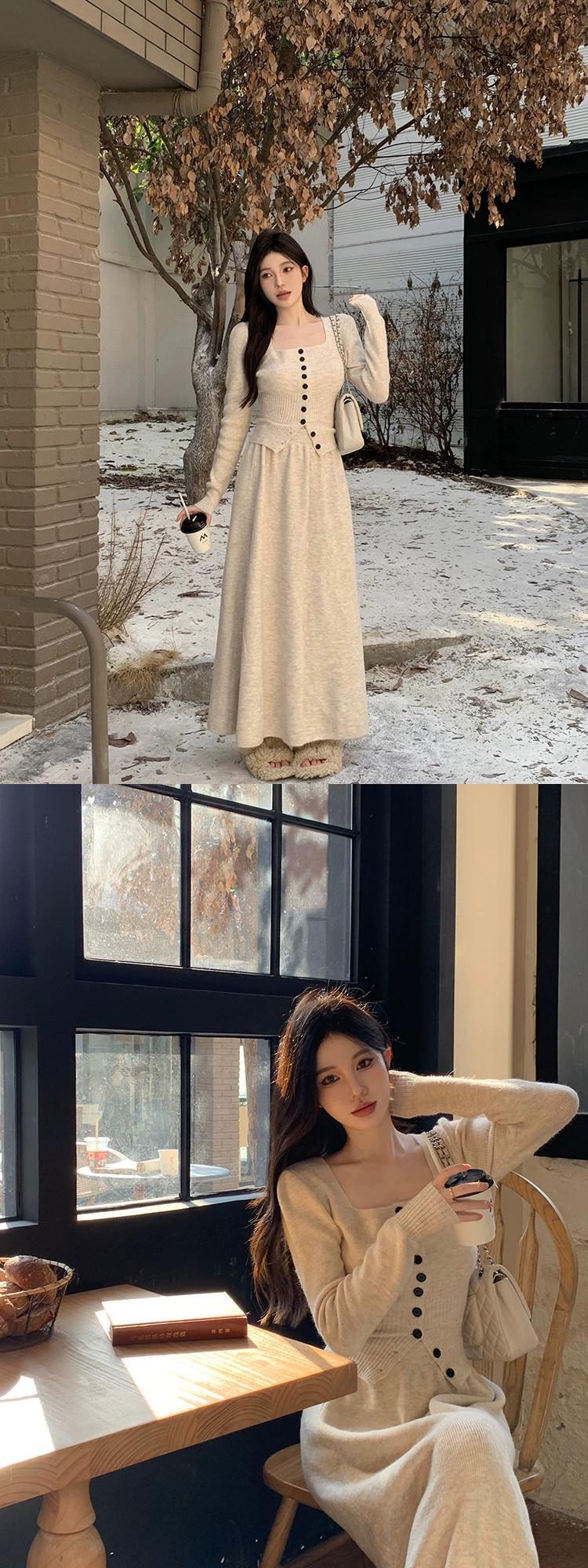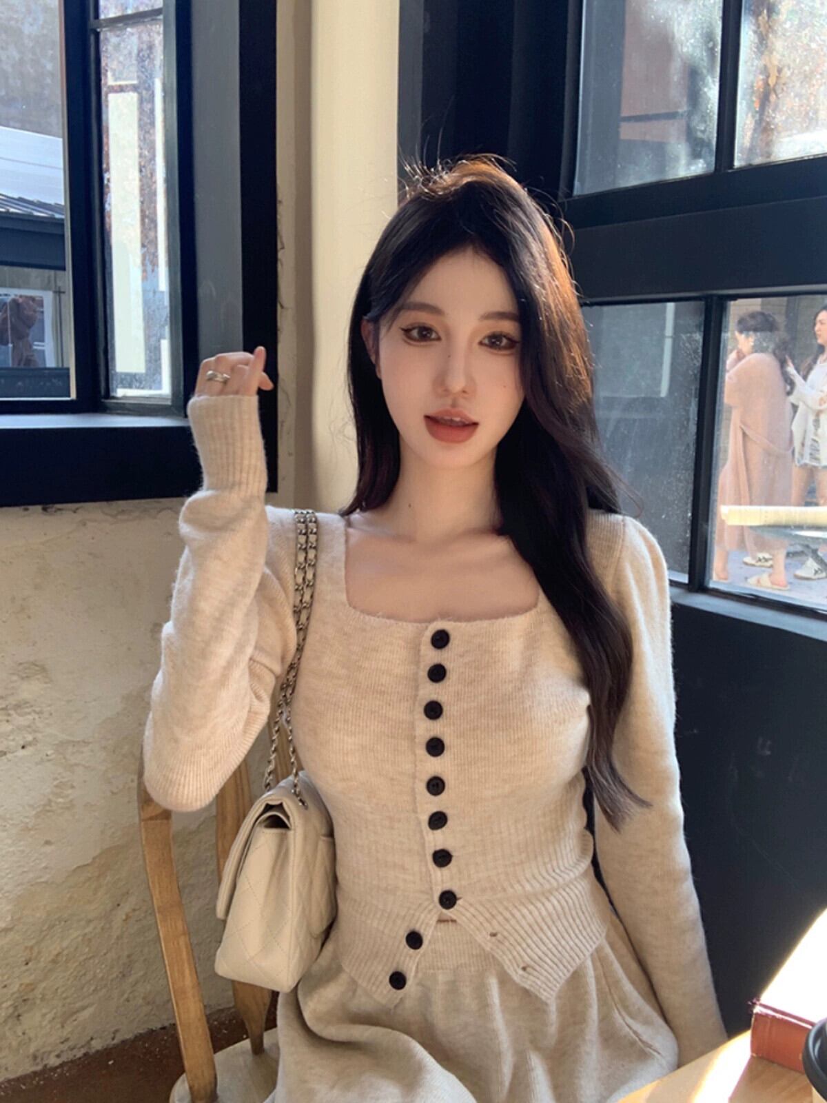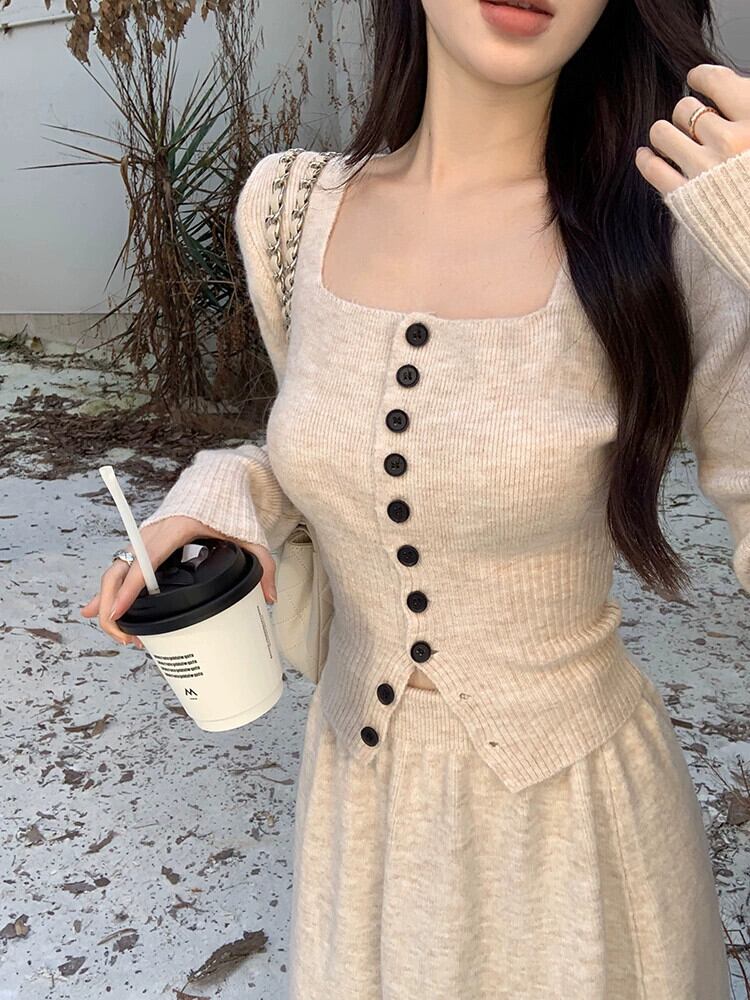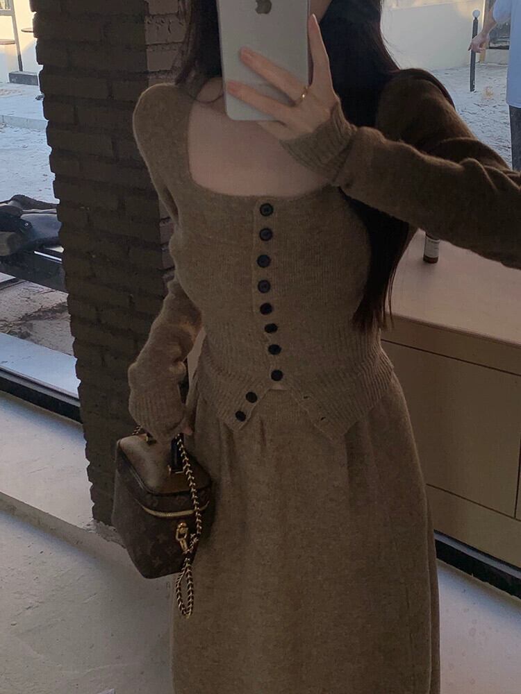 スクエアネックデザイン痩身長袖セーターハーフレングススカート女性の秋と冬の 2023 新しいファッションツーピースセット ロング オータム 秋物 ウィンター 冬物 スクウェア missk58959463499