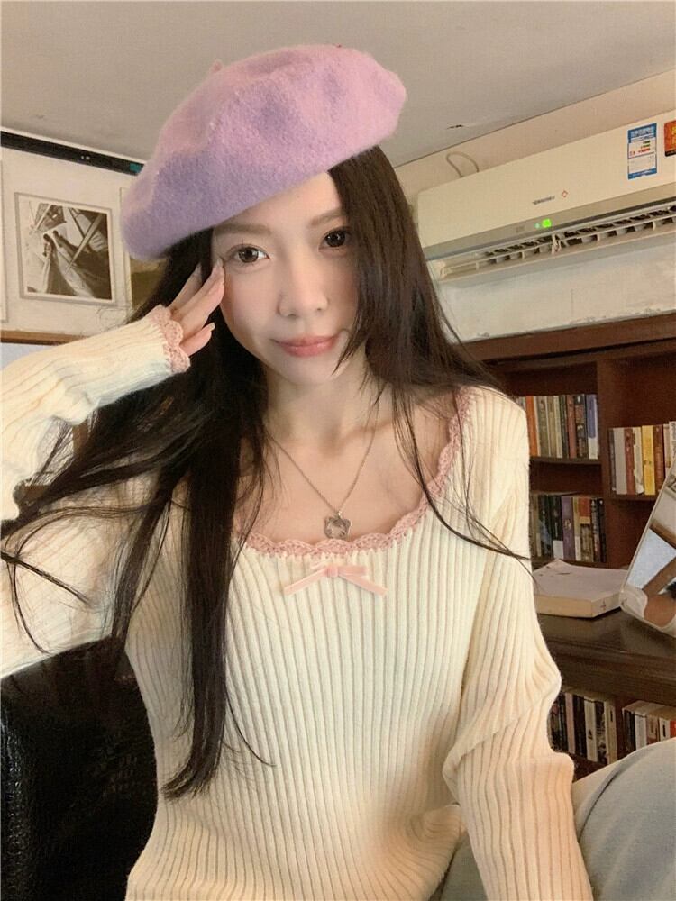 甘いレース長袖ニットセーター女性秋と冬 2023 新しい弓のデザインスリムボトシャツトップ ロング リボン 大人ガーリー スウィート キュート カジュアル オータム 秋物 ウィンター 冬物 missk33015483041