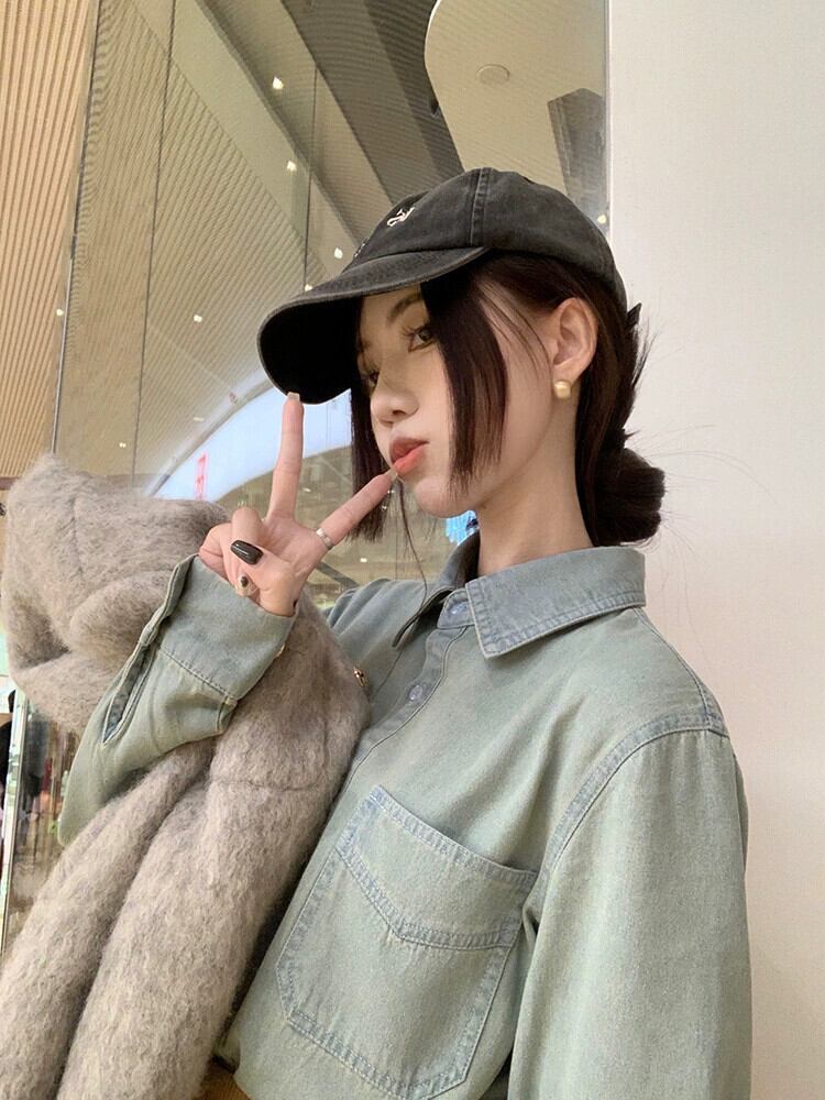 色:グレーのキルティングジャケット,コーデュロイスカート,ブルーデニムシャツ
