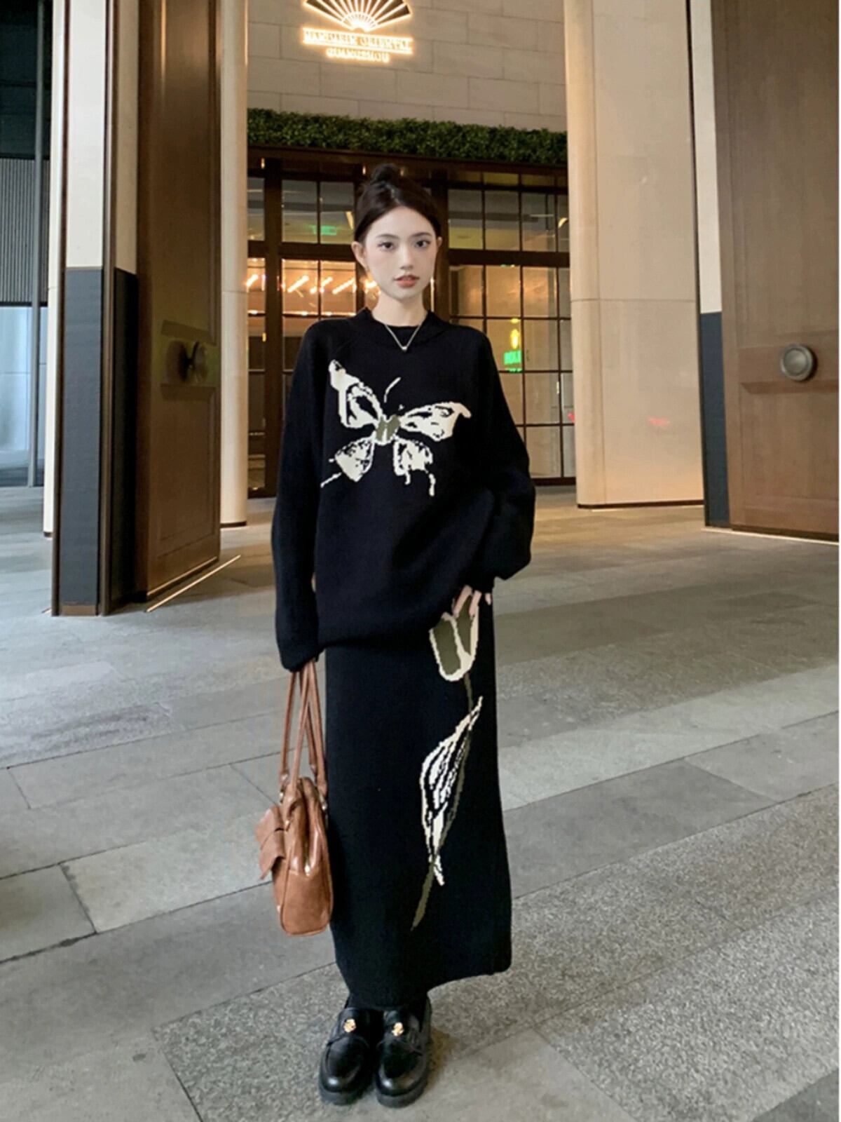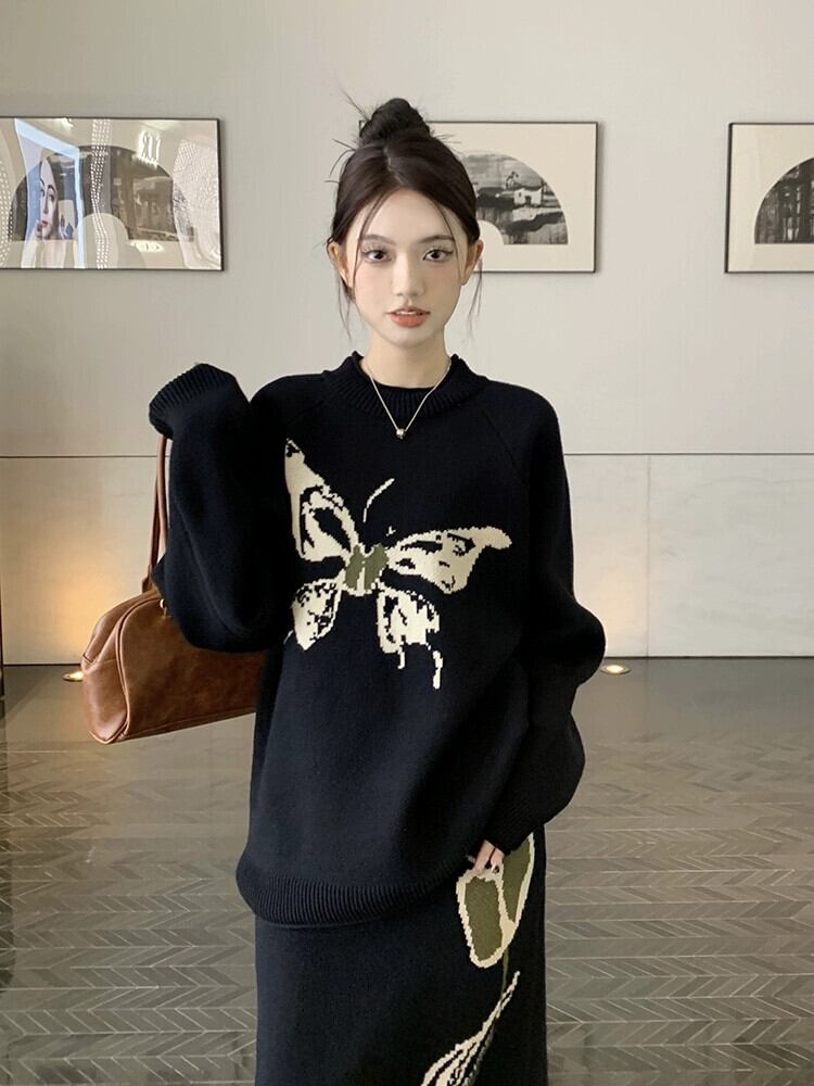蝶のデザイン、怠惰なスタイル、ゆったりとした長袖セーター、スリットニットスカート、女性の2023年秋冬新作スーツ ロング オータム 秋物 ウィンター 冬物 missk56812221043
