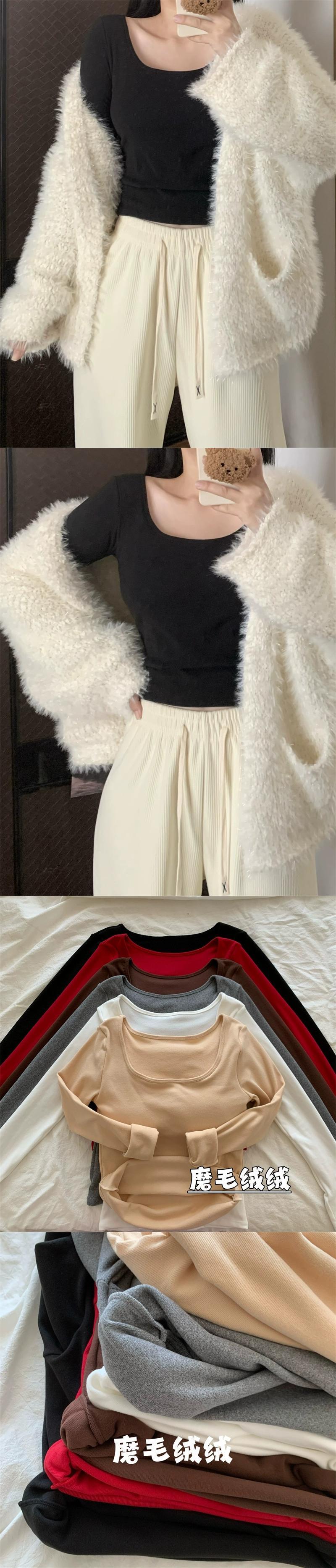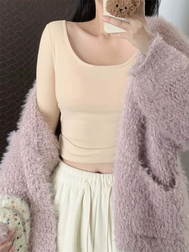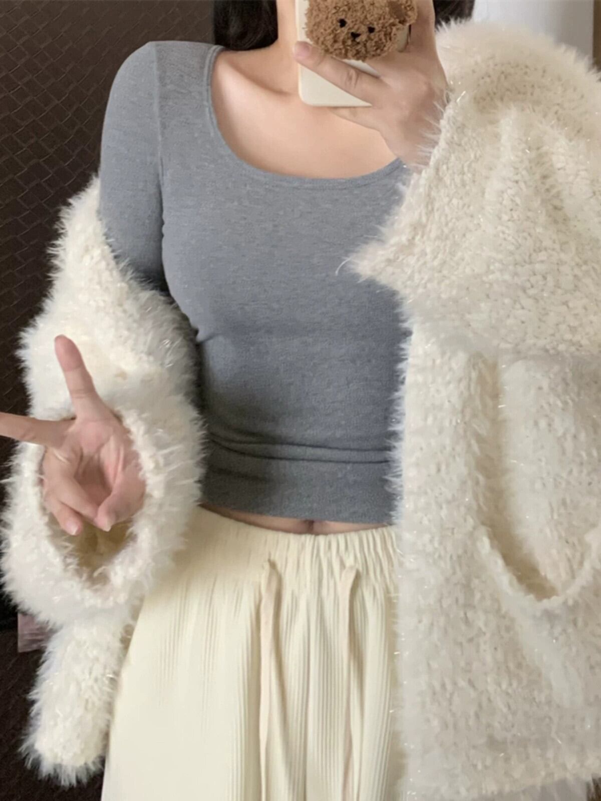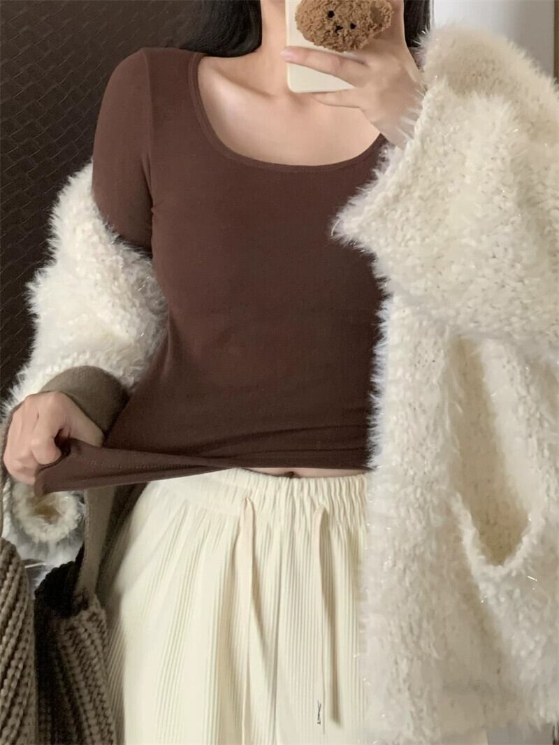 ベルベットと肥厚ボトムシャツ胸パッド付き 2023 年秋冬新無地 U ネック多用途スリムアウターウェア長袖 Tシャツレディース ロング オータム 秋物 ウィンター 冬物 ソリッドカラー missk15757289829