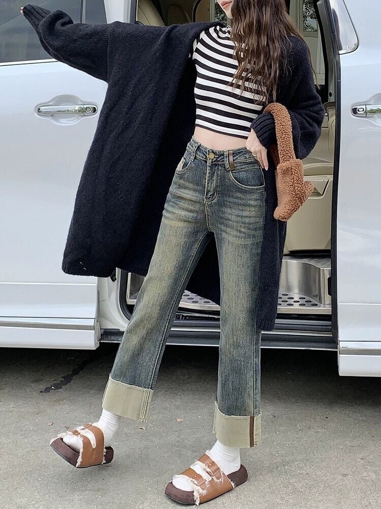 レトロなカラーブロックストレッチストレートシガレットパンツ女性秋冬 2023 新しいハイウエストスリムデザイン 9 ポイントジーンズ オータム 秋物 ウィンター 冬物 missk96287594973