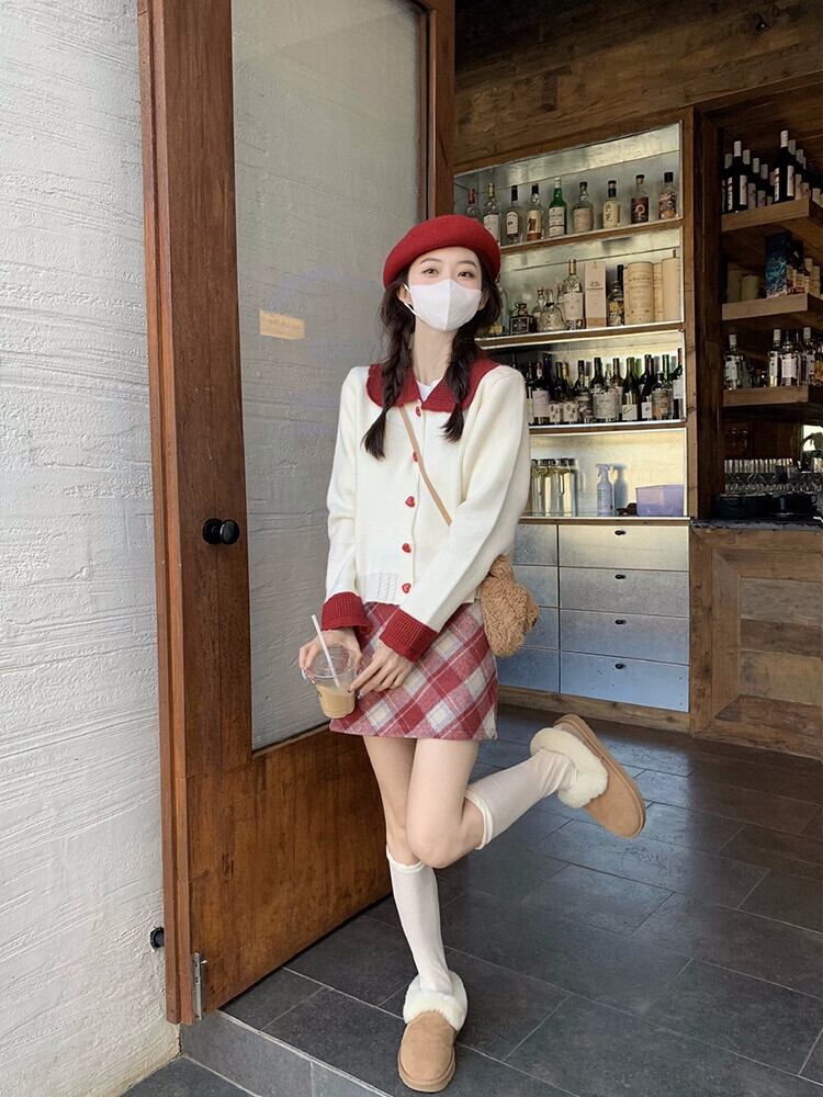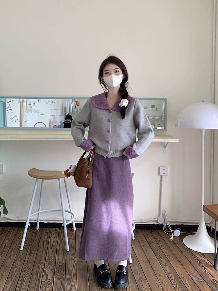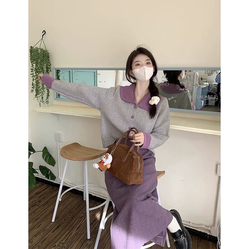 ラペルコントラストカラー優しいスタイルラブボタンセーターウエストハーフロングスカート女性の秋冬 2023 スーツ オータム 秋物 ウィンター 冬物 missk28122329806