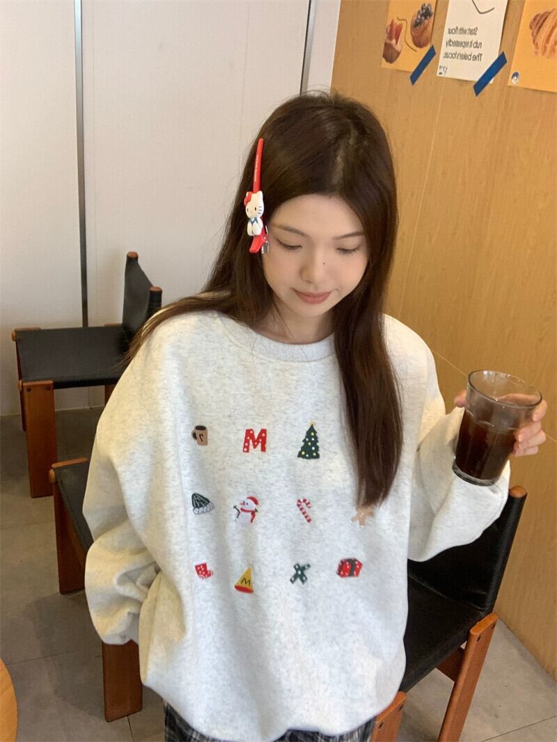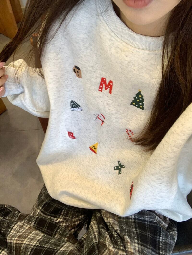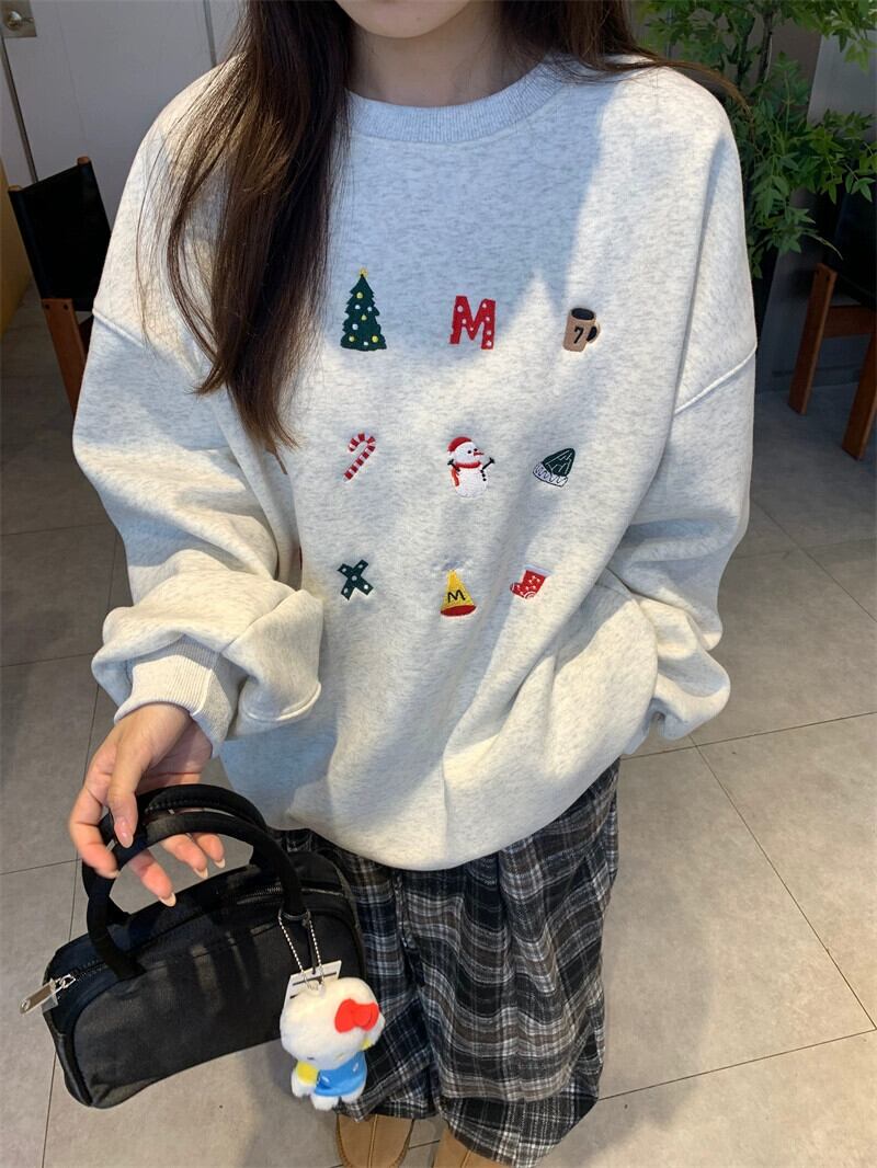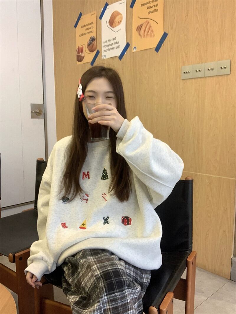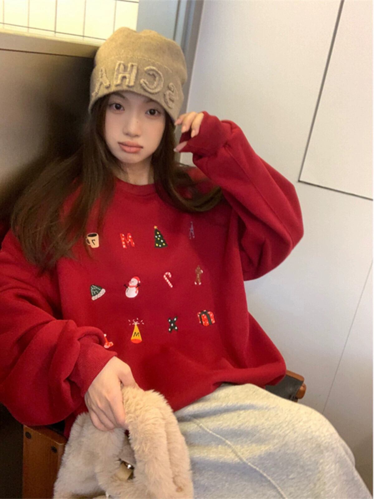 クリスマスレッドトレーナーベルベット肥厚女性の秋冬バージョン2023新しい刺繍ルーズプルオーバー長袖トップ ロング オータム 秋物 ウィンター 冬物 missk42263267257
