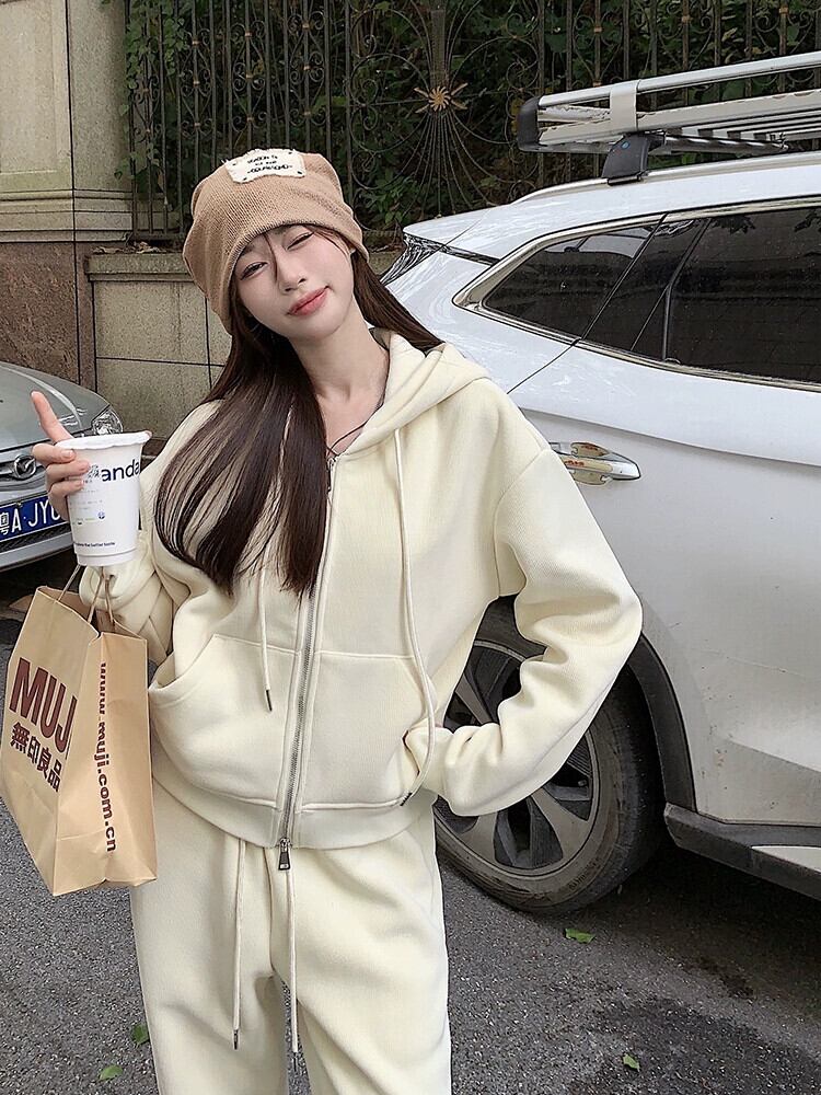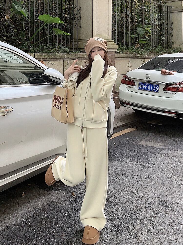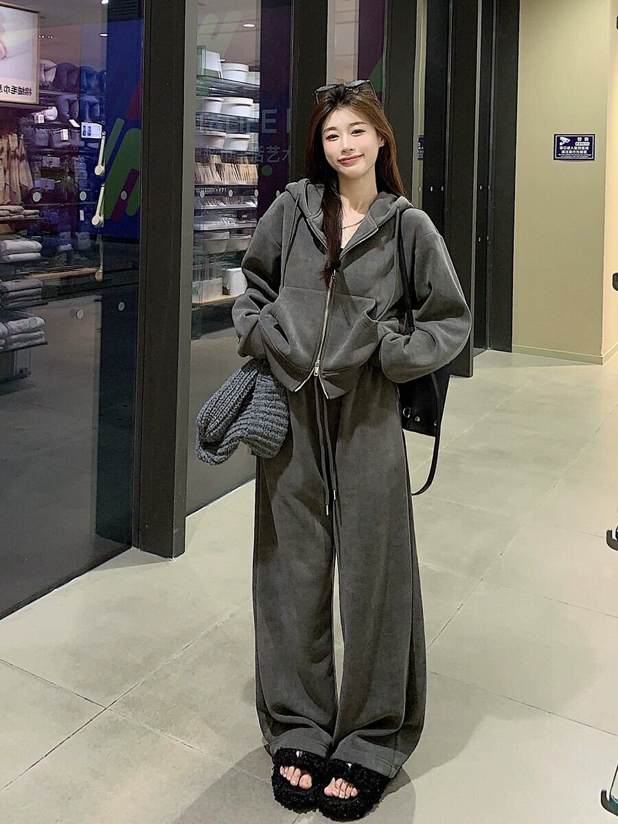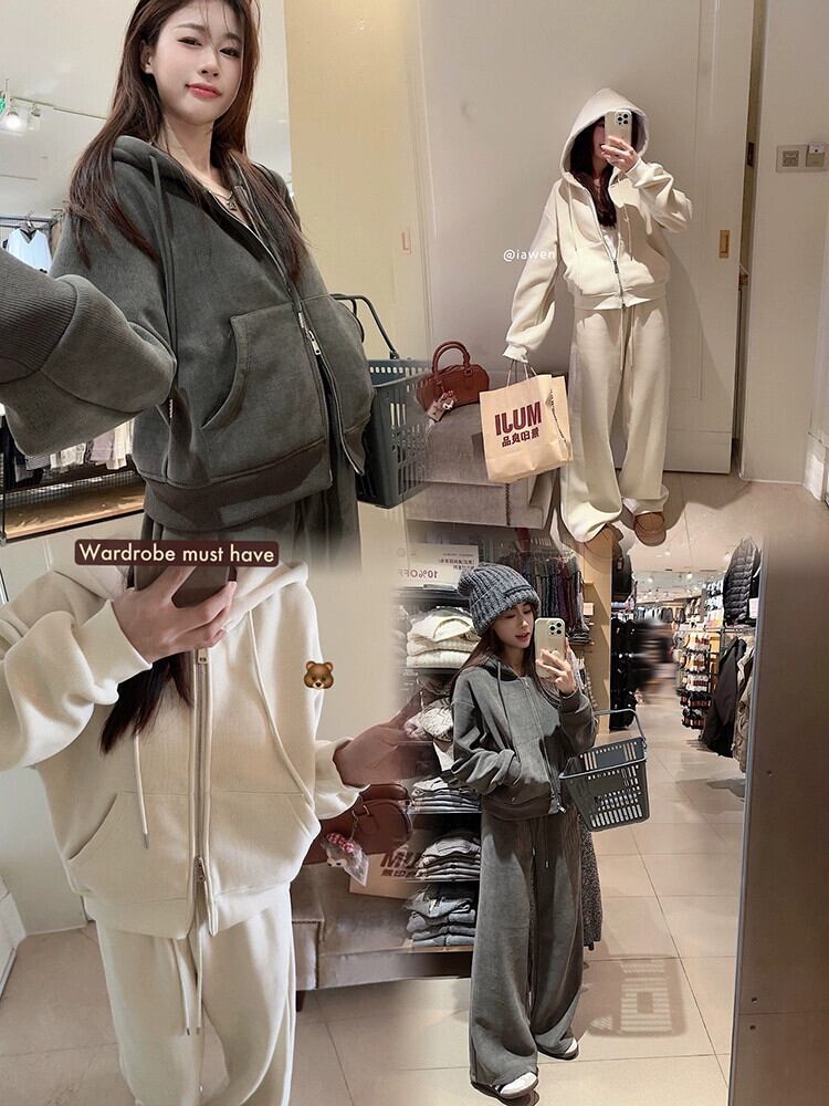 ベルベット肥厚フード付きスウェットシャツカジュアルスポーツハイウエストワイドレッグパンツ女性の秋冬 2023 新しいファッションスーツ ハイウェスト オータム 秋物 ウィンター 冬物 ワイドパンツ missk37206706425