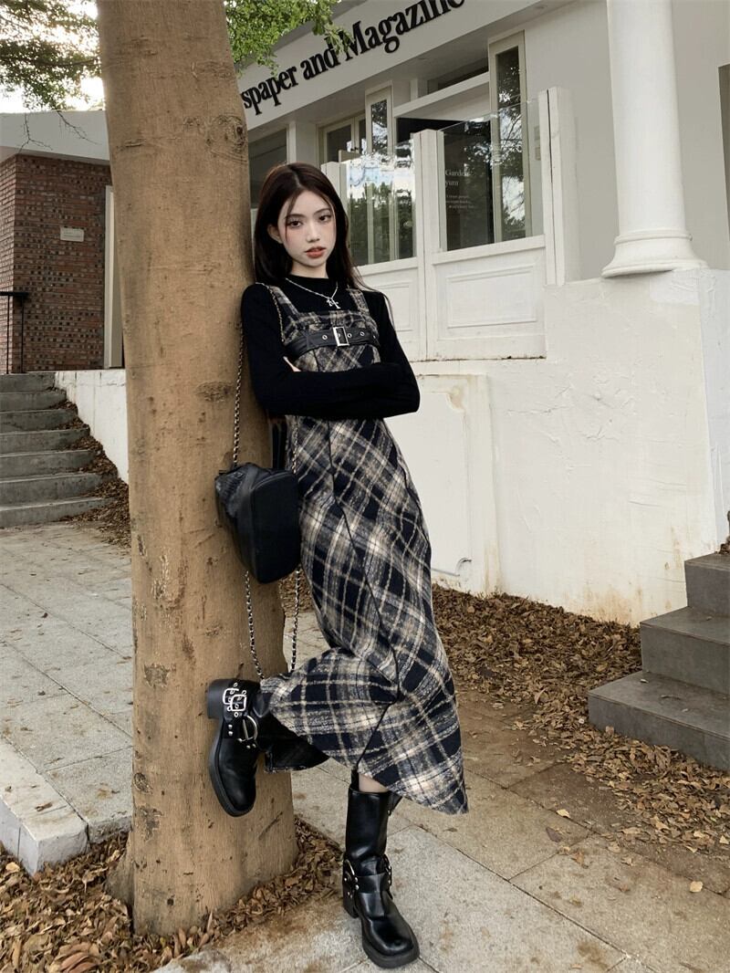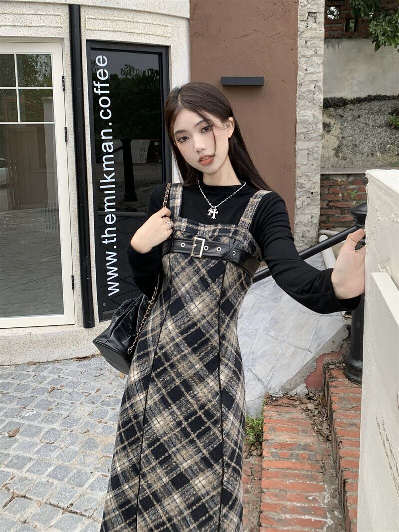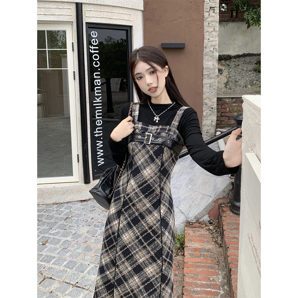 チェック柄サスペンダードレス女性の秋冬 2023 新しいレトロ起毛ウエスト痩身ミッドレングスデザインスカート オータム 秋物 ウィンター 冬物 missk28753192873