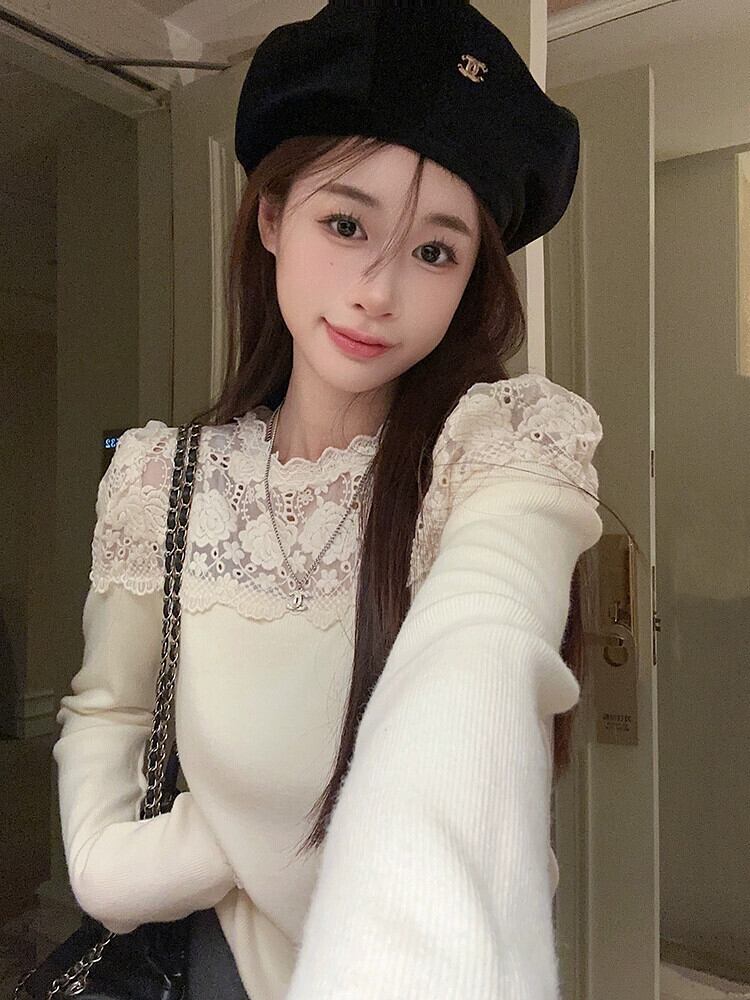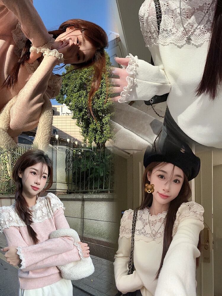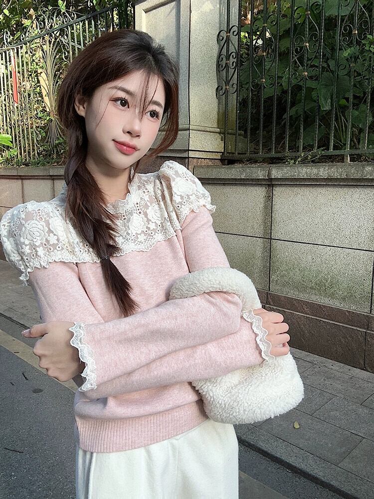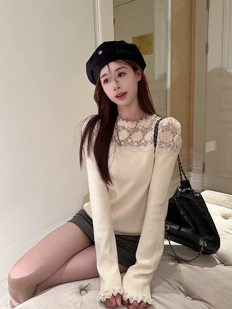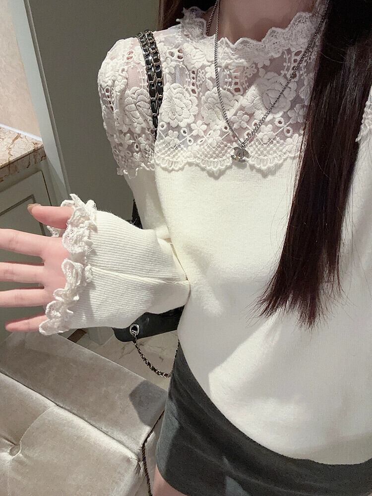 レーススプライシングセーター女性 2023 秋の新しい甘いデザイン痩身と年齢を軽減する長袖ボトリングシャツ ロング 大人ガーリー スウィート キュート カジュアル オータム 秋物 missk31931247414