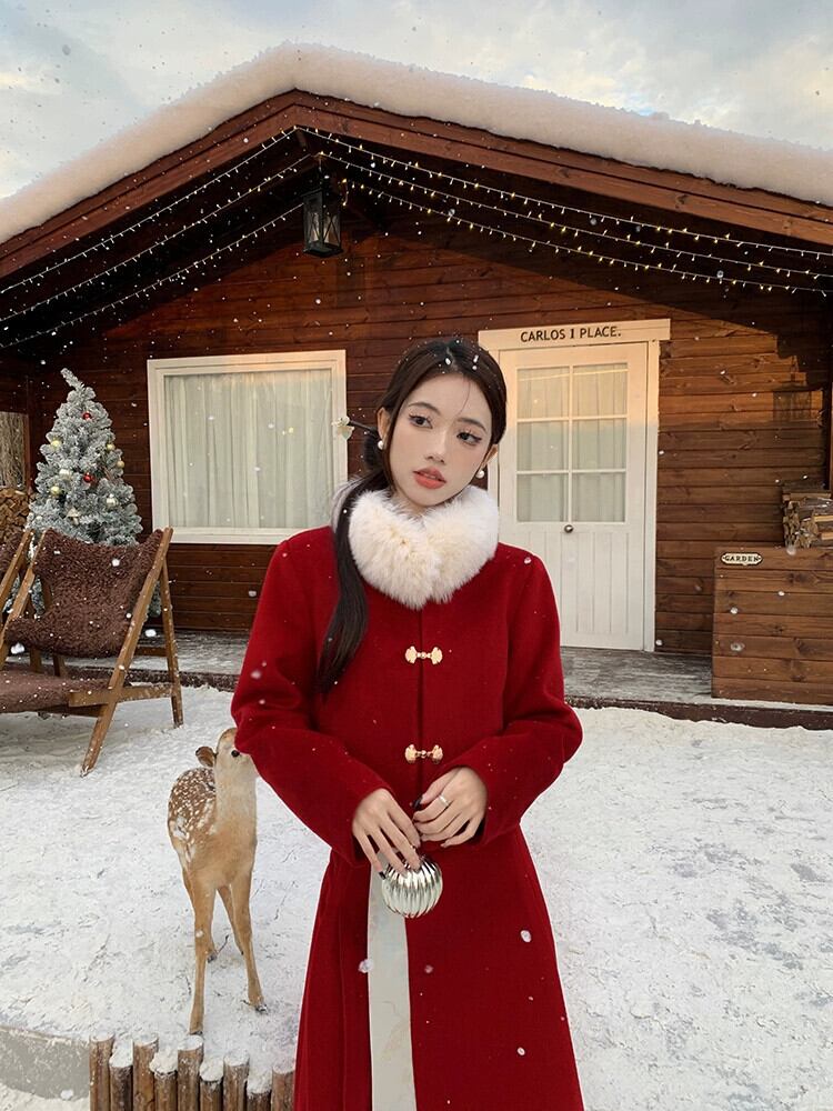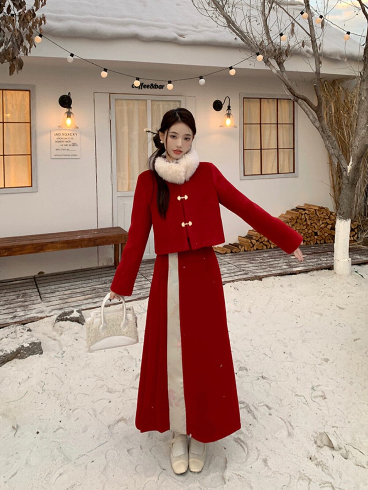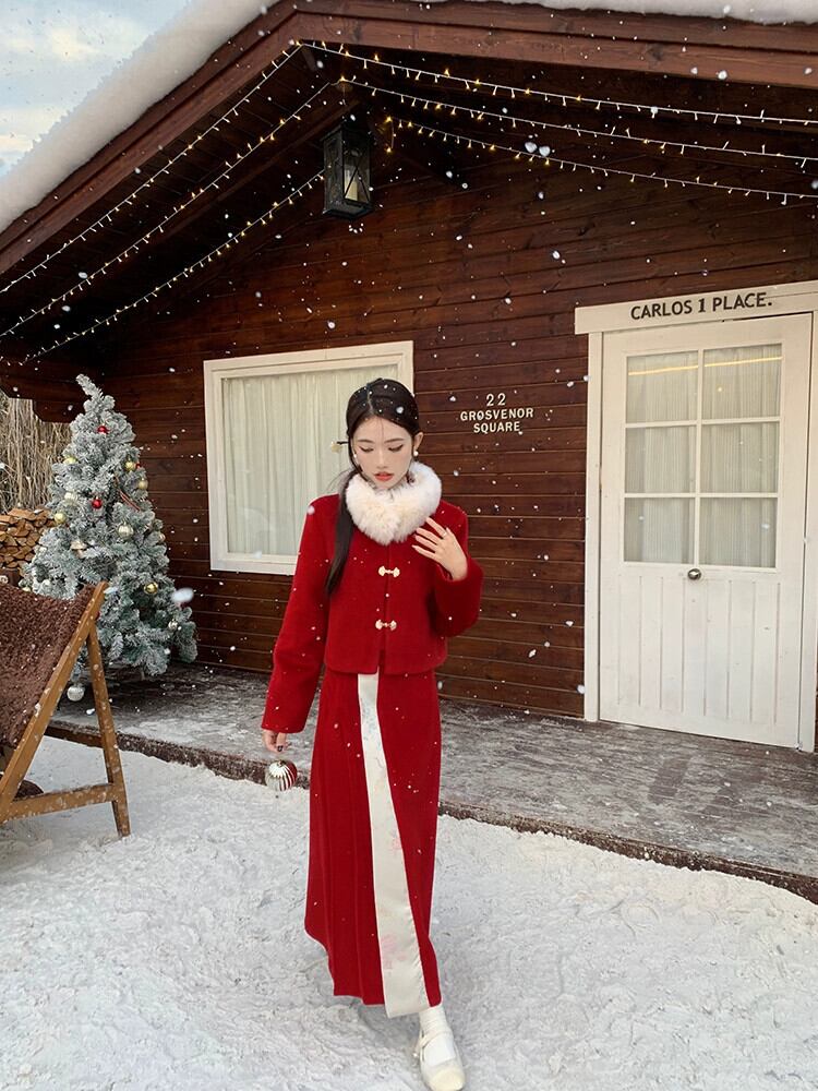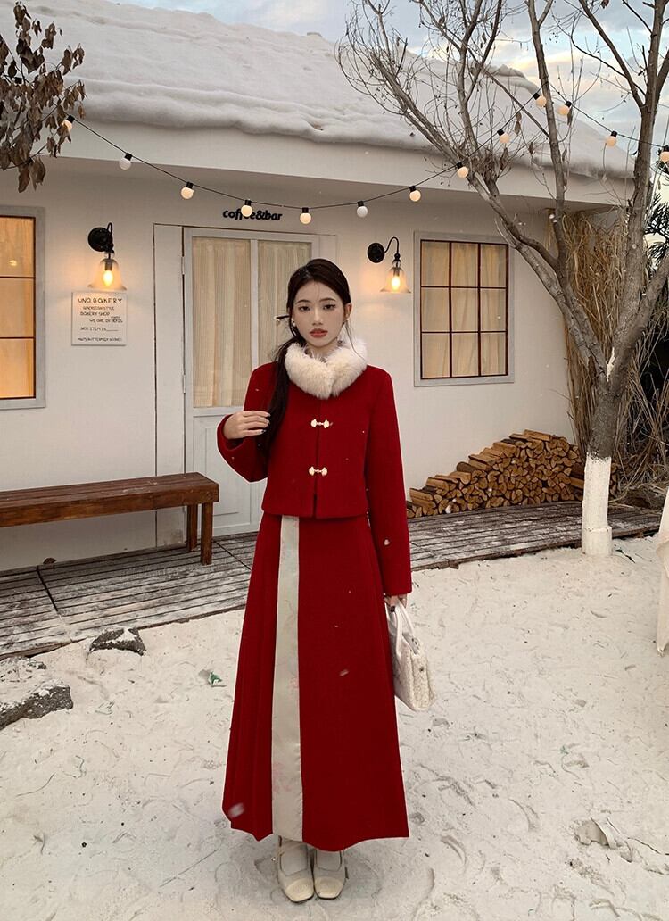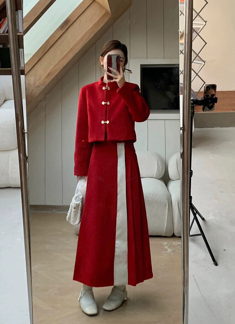 中国風の国民風のスーツの女性の冬新年赤キルティング肥厚ウールコート馬の顔スカートツーピースセット レッド ウィンター 冬物 missk34582408594