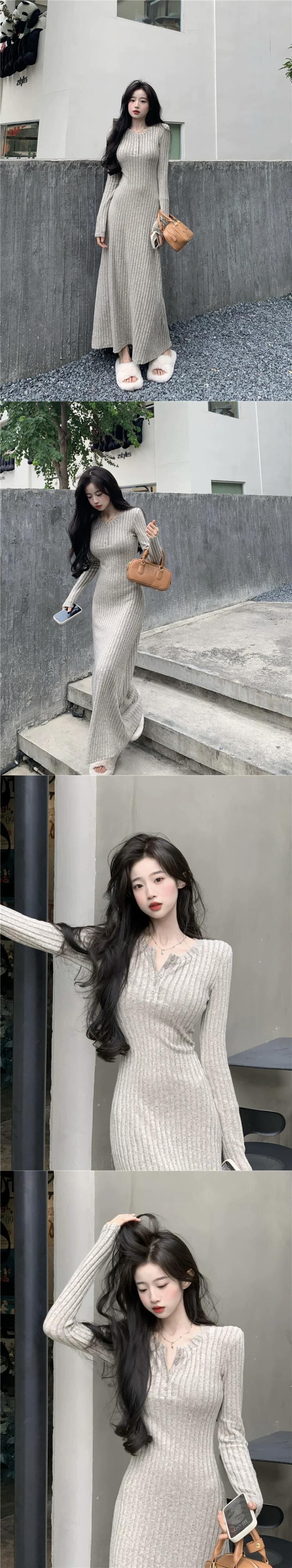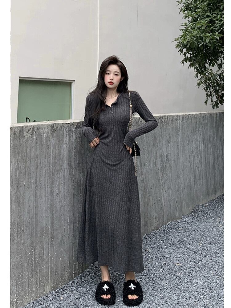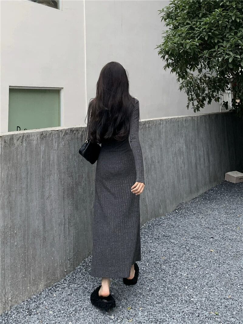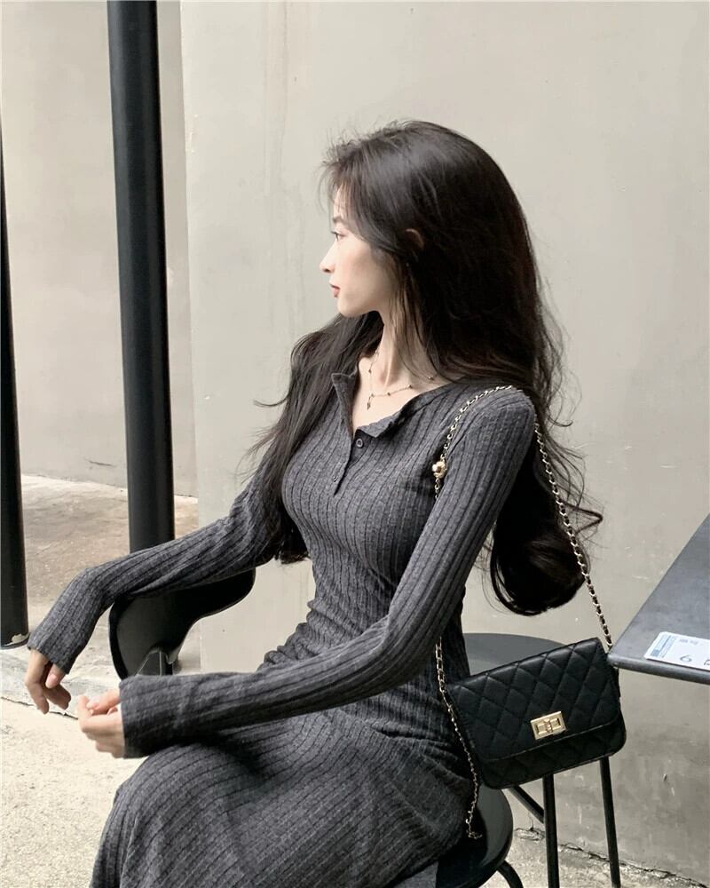 フレンチニットドレスの女性の秋と冬 2023 新しいスタイルラペルウエスト痩身ミッドレングス長袖ボトスカート ロング オータム 秋物 ウィンター 冬物 missk43907979698