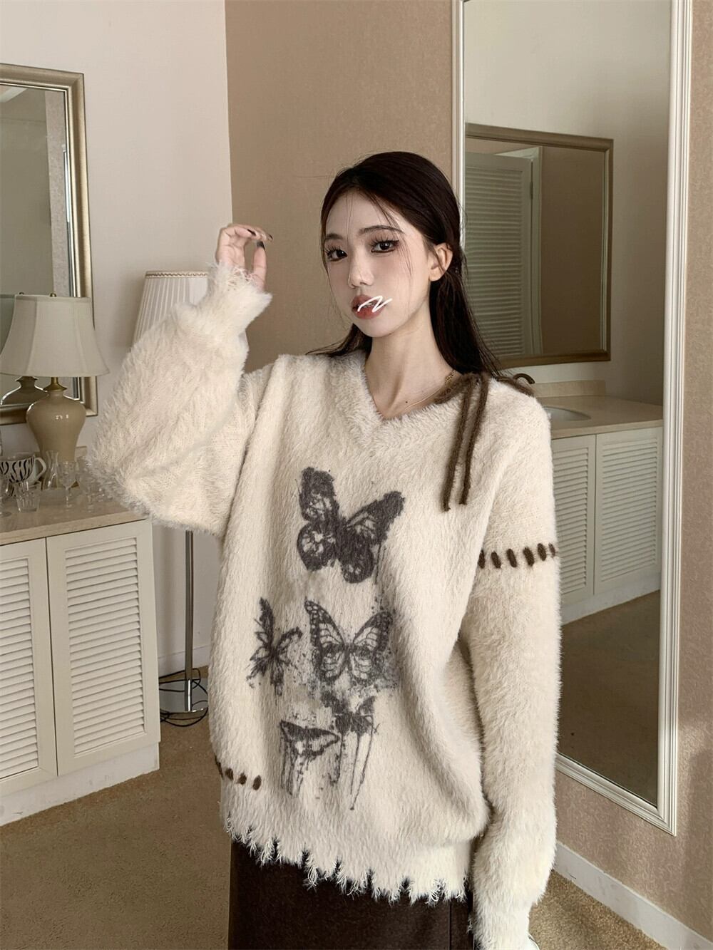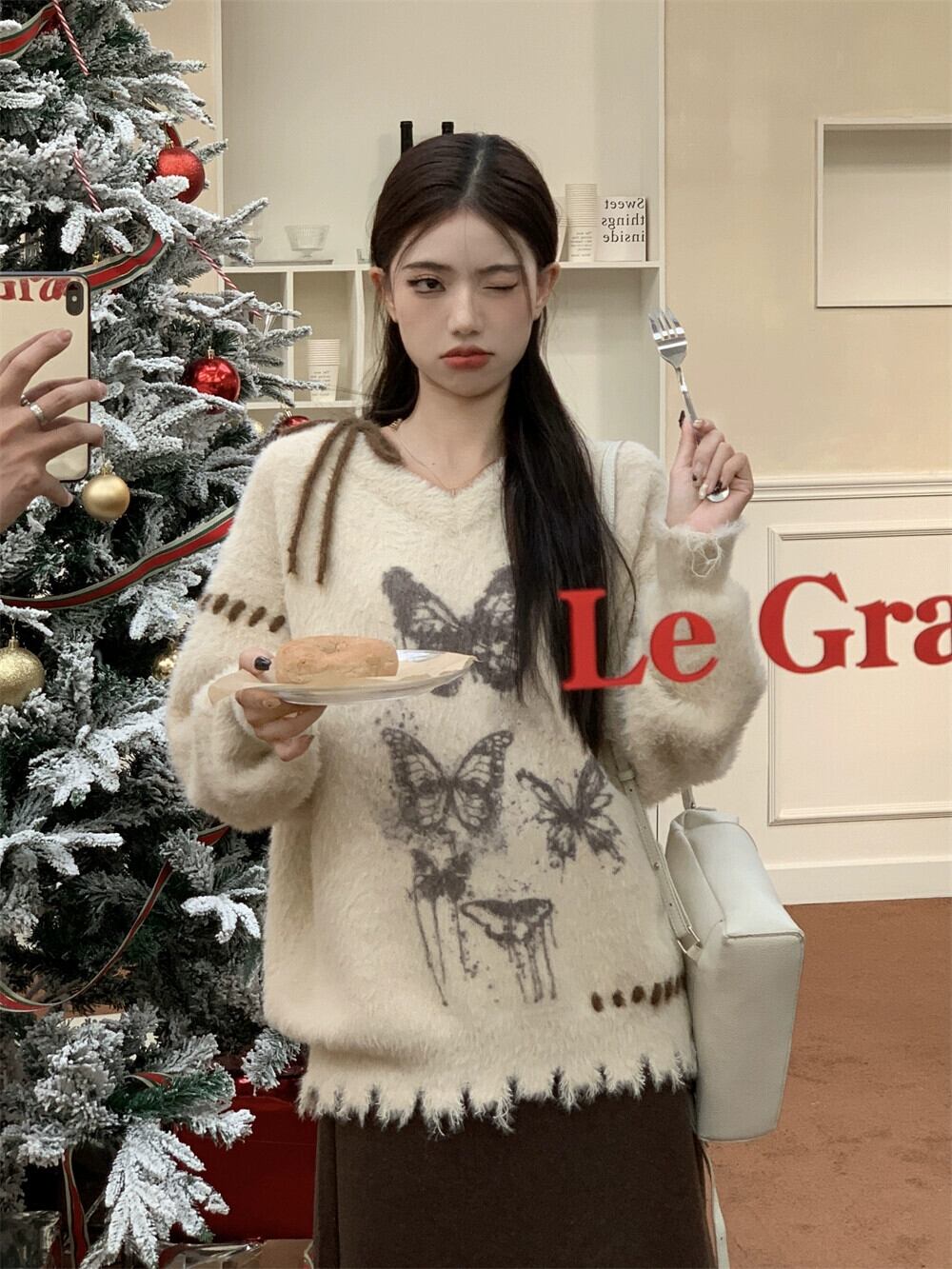 レトロなリップドニットセーターの女性の秋冬 2023 新しい豪華な蝶のデザインルーズ長袖トップ ロング オータム 秋物 ウィンター 冬物 missk93353308475