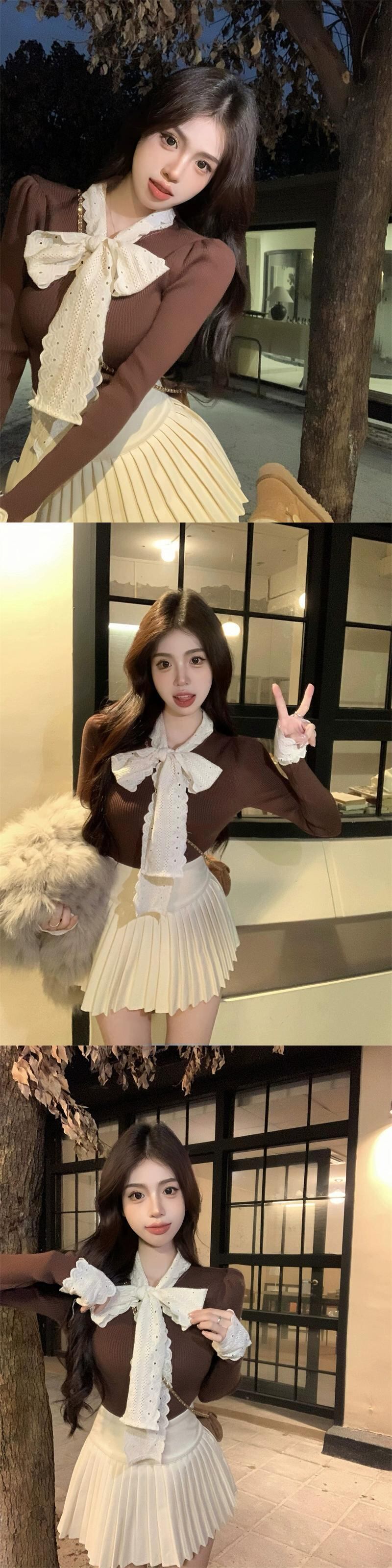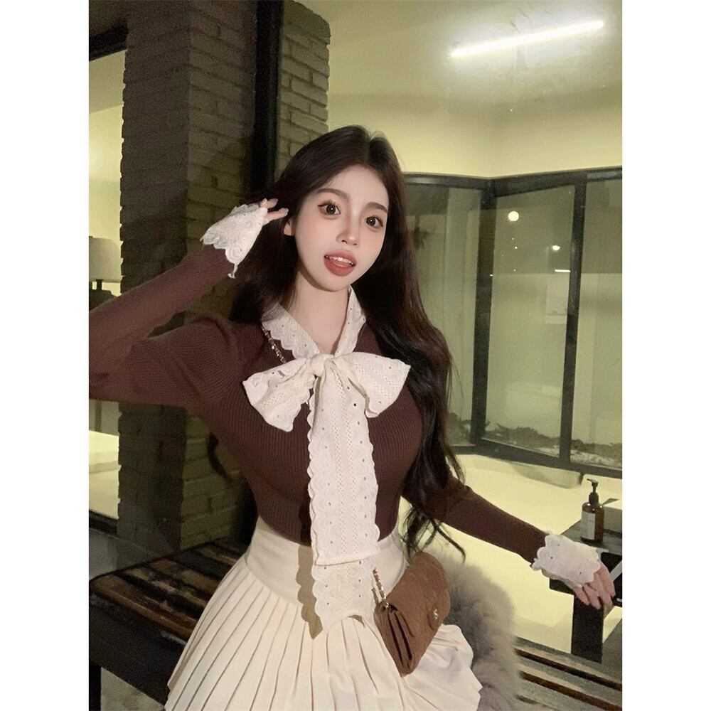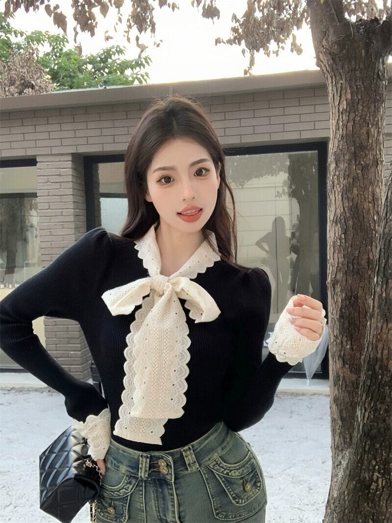 リボンコントラストカラーセーターレディース2023秋新作甘いフレンチレースウエスタンスタイル長袖トップ ロング 大人ガーリー スウィート キュート カジュアル オータム 秋物 missk39869266070