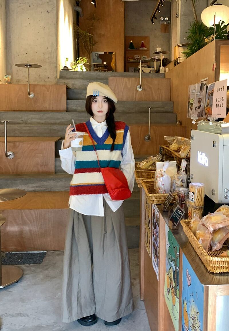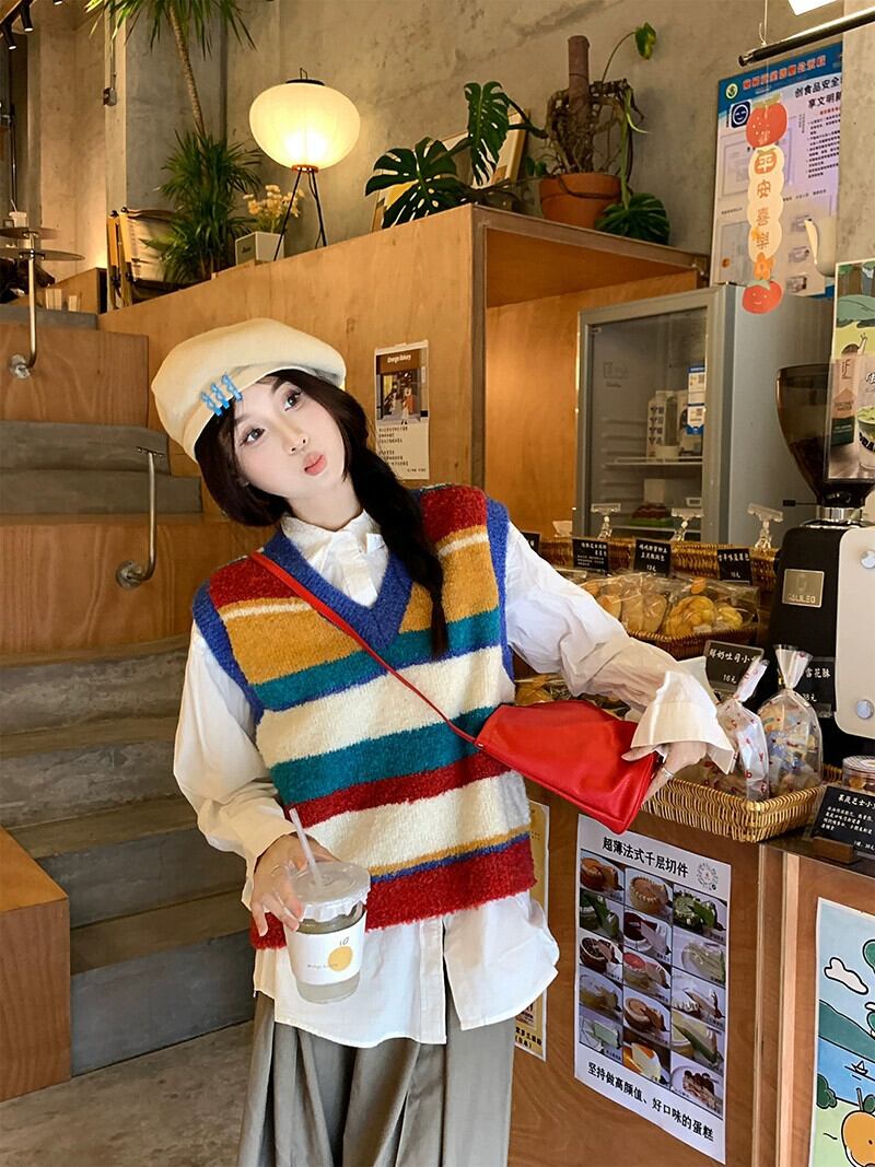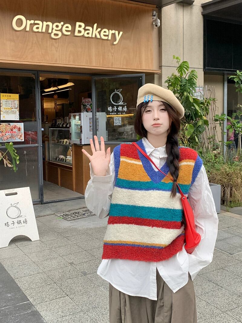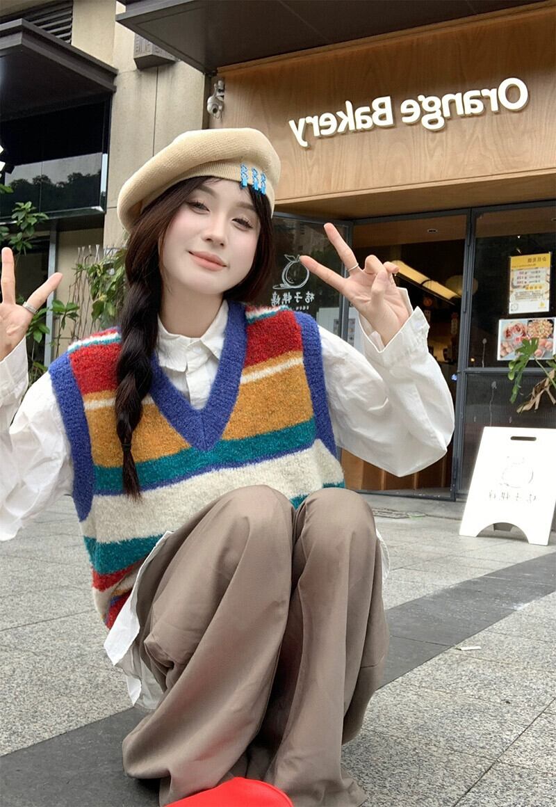 レインボーストライプ V ネックニットベスト女性秋 2024 新しいスタイルの積み重ねデザインノースリーブトップ オータム 秋物 Vネック missk44474324017